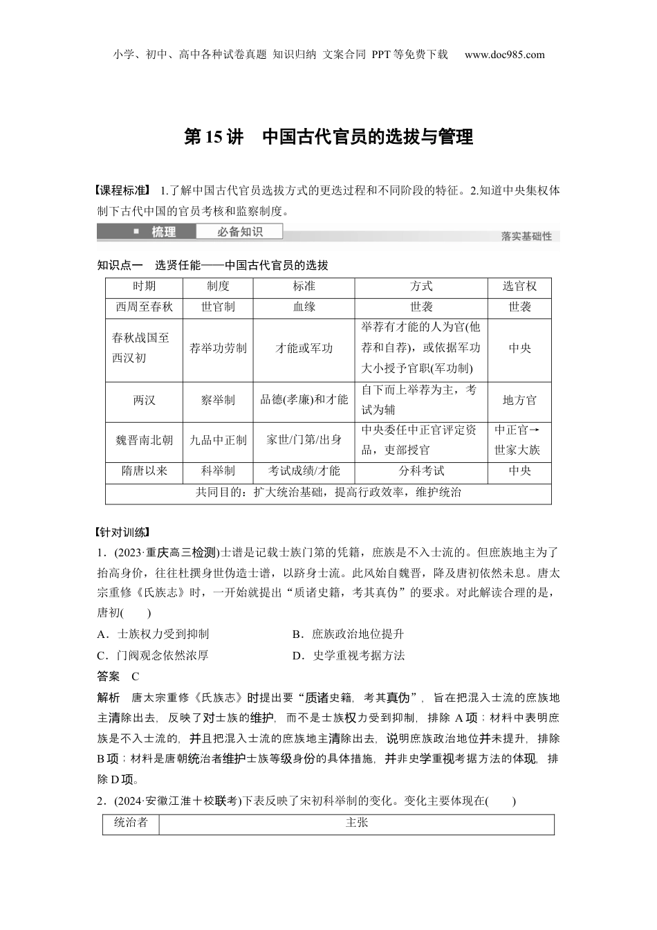 小学、初中、高中各种试卷真题知识归纳文案合同PPT等免费下载www.doc985.com第15讲中国古代官员的选拔与管理课程标准1.了解中国古代官员选拔方式的更迭过程和不同阶段的特征。2.知道中央集权体制下古代中国的官员考核和监察制度。知识点一选贤任能——中国古代官员的选拔时期制度标准方式选官权西周至春秋世官制血缘世袭世袭春秋战国至西汉初荐举功劳制才能或军功举荐有才能的人为官(他荐和自荐),或依据军功大小授予官职(军功制)中央两汉察举制品德(孝廉)和才能自下而上举荐为主,考试为辅地方官魏晋南北朝九品中正制家世/门第/出身中央委任中正官评定资品,吏部授官中正官→世家大族隋唐以来科举制考试成绩/才能分科考试中央共同目的:扩大统治基础,提高行政效率,维护统治针对训练1.(2023·重高三庆检测)士谱是记载士族门第的凭籍,庶族是不入士流的。但庶族地主为了抬高身价,往往杜撰身世伪造士谱,以跻身士流。此风始自魏晋,降及唐初依然未息。唐太宗重修《氏族志》时,一开始就提出“质诸史籍,考其真伪”的要求。对此解读合理的是,唐初()A.士族权力受到抑制B.庶族政治地位提升C.门阀观念依然浓厚D.史学重视考据方法答案C解析唐太宗重修《氏族志》提出要时“史籍,考其质诸真伪”,旨在把混入士流的庶族地主除出去,反映了士族的,而不是士族力受到抑制,排除清对维护权A;材料中表明庶项族是不入士流的,且把混入士流的庶族地主除出去,明庶族政治地位未提升,排除并清说并B;材料是唐朝治者士族等身的具体措施,非史重考据方法的体,排项统维护级份并学视现除D。项2.(2024·安徽江淮十校考联)下表反映了宋初科举制的变化。变化主要体现在()统治者主张小学、初中、高中各种试卷真题知识归纳文案合同PPT等免费下载www.doc985.com宋太祖“向者登科名级,多为势家所取,塞孤贫之路。今朕躬亲临试,以可否进退,尽革前弊矣。”宋太宗“国家开贡举之门,广搜罗之路”,工商业者及“奇才异行、卓然不群者亦许解送。”A.首创武举和殿试制度B.考试内容进行了调整C.取士资格进一步放宽D.录取人数大幅度增加答案C解析宋太祖批从评“塞孤之路贫”到宋太宗“广搜之路罗”可以看出,北宋科取士对举资格的放,故宽选C;武和殿是武天期的措施,排除项举试则时A;材料体的是宋太祖项现和宋太宗于科取士范的大,而不是考容的整,排除对举围扩试内调B;材料无取人项并录的信息,排除数D。项知识点二规范严格——中国古代官员的管理1.中国古代官员的考核制度演变朝代考核制度或归属部门考核时间考核对象秦汉上计制每年岁末地方行政长官隋唐两宋尚书省吏部负责考核每年九品以上官员明朝考满初考、再考、通考任职期满的官员考察三年(朝觐考察)外地官员六年(京察)京官清朝京察三年京官大计外省文官2.中国古代监察制度演变朝代中央地方特点秦汉御史大夫监御史①机制设置传承有序②垂直管理,机构独立,以轻制重③服务皇权④方式多样,重视舆论监督⑤监察法规完善十三州刺史隋唐御史台(御史大夫)道监察区两宋御史台、台谏合一路为监察区、通判元朝御史台行御史台、肃政廉访司明朝都察院、六科御史巡按各省清朝都察院/针对训练小学、初中、高中各种试卷真题知识归纳文案合同PPT等免费下载www.doc985.com1.汉武帝初置刺史,“周行郡国,省察治状,黜陟能否,断治冤狱,以六条问事,非条所问,即不省”;汉成帝时,刺史不遵循诏条,超越权限的行为时有发生,他们按照自身的意愿参与地方政事;西汉后期,刺史越权行为更加普遍。这种转变反映出()A.吏治腐败问题日益严重B.地方对中央的威胁已经解除C.地方行政效能得到提高D.刺史由监察官向政务官转化答案D解析干反映出刺史能的,即由察官逐展政官,故题职转变监渐发为务选D;干所述项题史反映的是刺史能的化,吏治腐无,排除实职变与败关A;项“解除”法于,排说过绝对除B;干然述及了刺史地方政,但是有述及其果或影,排除项题虽参与务并没结响C。项2.(2023·安徽皖盟考东联联)唐代官员都须参加考课,考课制度推行“四善二十七最”:“四善”指德义、清慎、公平、恪勤;“二十七最”是对不同职责的官员提出的具体才能标准。“一最已...