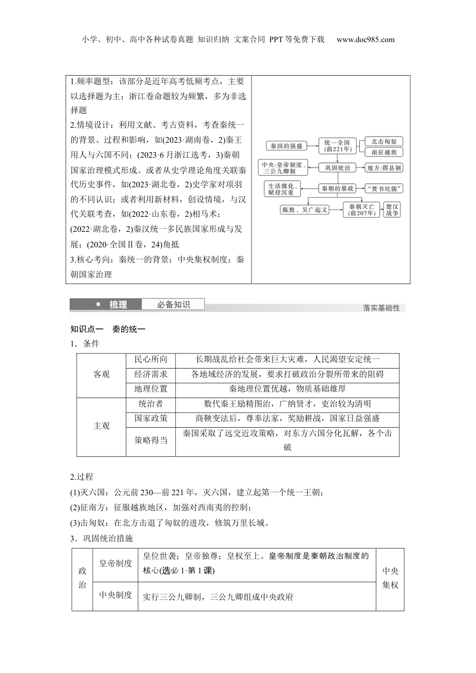 小学、初中、高中各种试卷真题知识归纳文案合同PPT等免费下载www.doc985.com第3讲秦统一多民族封建国家的建立课程标准1.通过了解秦朝的统一业绩,认识统一多民族封建国家的建立在中国历史上的意义。2.通过了解秦朝的社会矛盾和农民起义,认识秦朝崩溃的原因。考情分析整体感知小学、初中、高中各种试卷真题知识归纳文案合同PPT等免费下载www.doc985.com1.频率题型:该部分是近年高考低频考点,主要以选择题为主;浙江卷命题较为频繁,多为非选择题2.情境设计:利用文献、考古资料,考查秦统一的背景、过程和影响,如(2023·湖南卷,2)秦王用人与六国不同;(2023·6月浙江选考,3)秦朝国家治理模式形成。或者从史学理论角度关联秦代历史事件,如(2023·湖北卷,2)史学家对项羽的不同认识;或者利用新材料,创设情境,与汉代关联考查,如(2022·山东卷,2)相马术;(2022·湖北卷,2)秦汉统一多民族国家形成与发展;(2020·全国Ⅱ卷,24)角抵3.核心考向:秦统一的背景;中央集权制度;秦朝国家治理知识点一秦的统一1.条件客观民心所向长期战乱给社会带来巨大灾难,人民渴望安定统一经济需求各地域经济的发展,要求打破政治分裂所带来的阻碍地理位置秦地理位置优越,物质基础雄厚主观统治者数代秦王励精图治,广纳贤才,吏治较为清明国家政策商鞅变法后,尊奉法家,奖励耕战,国家日益强盛策略得当秦国采取了远交近攻策略,对东方六国分化瓦解,各个击破2.过程(1)灭六国:公元前230—前221年,灭六国,建立起第一个统一王朝;(2)征南方:征服越族地区,加强对西南夷的控制;(3)击匈奴:在北方击退了匈奴的进攻,修筑万里长城。3.巩固统治措施政治皇帝制度皇位世袭;皇帝独尊;皇权至上。皇帝制度是秦朝政治制度的核心(必选1·第1课)中央集权中央制度实行三公九卿制,三公九卿组成中央政府小学、初中、高中各种试卷真题知识归纳文案合同PPT等免费下载www.doc985.com丞相府是行政中,太尉是最高武官,御史大夫是副丞相,枢协理政,又是最高察官;官僚机以公卿首,家重大事国监构为国由公卿行廷,最后由皇帝裁务进议断(必选1·第1课)地方制度废除分封制,推广郡县制,郡、县主要官员由中央任免和考核。考核法主要是上制办计(必选1·第5课)选官制度官拔主要是员选“以法为教”“以吏为师”(必选1·第5课)文书邮传官僚机以文推行行政管理,建立了以中心的文构书邮传为书传送系,以保障皇帝和中央政令送统传(必选1·第1课)经济统一车轨、货币和度量衡,修驰道、直道国家统一基层治理县以下设乡、里和亭,负责管理民众和治安;编制户籍,迁徙六国贵族豪强到关中、巴蜀等地;整顿社会风俗文化统一文字;焚书坑儒法律秦以法家思想治,推了律的纂。此后,朝法典多以国动编历“律”命名。(必选1·第8课)4.意义(1)疆域:建立起幅员辽阔的国家,为我国统一的多民族国家的建立和发展奠定了基础。(2)社会:促进了各民族的交往交流交融,推动了统一多民族国家政治、经济、社会的发展。(3)制度:确立的政治制度被以后的王朝长期沿用,影响深远。1.图解·关键知识秦朝中央集权制度2.阐释·核心概念专制主义与中央集权“制主专义”是指一策方式,其特点是皇帝人裁,集家最高力于一身,皇种决个专断独国权帝策到行使、政、等大具有很大的意性和性。从决军财权随独断“中央集权”是中央和地方的系而言,是一家行政管理体制,地方分相。针对关种国与权对其特点是全、政、等大都中央,地方必听命于中央,有任何立性。国军财权归属须绝对没独3.挖掘·教材信息阅读教材“里耶秦简户籍簿”图片及释文,据此可知秦朝推行了怎样的统治措施?推行这一措施有何作用?小学、初中、高中各种试卷真题知识归纳文案合同PPT等免费下载www.doc985.com试答:__________________________________________________________________________________________________________________________________________答案措施:编制户籍。作用:有利于国家控制百姓,保障治安;便于征发赋役。4.思考·情境问题秦朝的政治制度与先秦时期的政治制度在本质上有何不同?试答:_______________________________________________________...