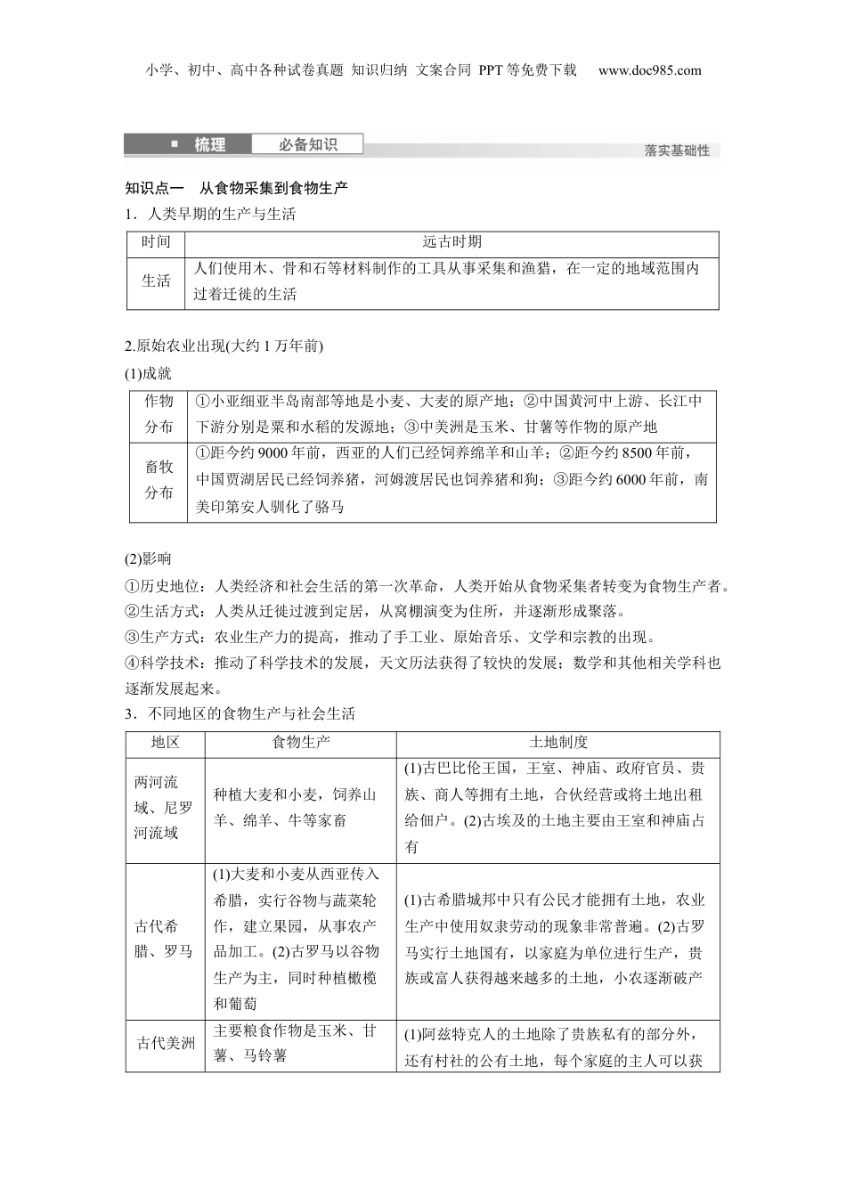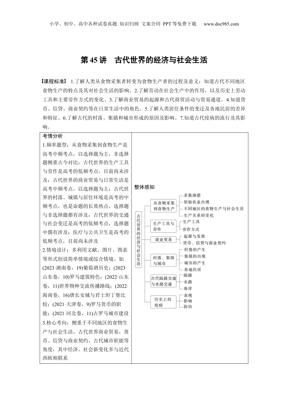 小学、初中、高中各种试卷真题知识归纳文案合同PPT等免费下载www.doc985.com第45讲古代世界的经济与社会生活课程标准1.了解人类从食物采集者转变为食物生产者的过程及意义;知道古代不同地区食物生产的特点及其对社会生活的影响。2.了解劳动在社会生产中的作用,以及历史上劳动工具和主要劳作方式的变化。3.了解商业贸易的起源和古代商贸活动与贸易通道。4.知道货币、信贷、商业契约等在日常生活中的角色。5.了解人类居住条件的变迁及各地民居的差异和特征。6.了解古代的村落、集镇和城市形成的原因及影响。7.知道古代疫病的流行及其影响。考情分析1.频率题型:从食物采集到食物生产是高考中频考点,以选择题为主,非选择题侧重古今对比;古代世界的生产工具与劳作是高考的低频考点,目前尚未涉及;古代世界的商业贸易与日常生活是高考中频考点,以选择题为主;古代世界的村落、城镇与居住环境是高考的中频考点,也是命题的长效热点,选择题与非选择题都有涉及;古代世界的交通与社会变迁是高考的低频考点,选择题中偶有涉及;医疗与公共卫生是高考的低频考点,目前尚未涉及2.情境设计:多利用文献、图片、图表等形式创设简单情境或综合情境。如(2023·湖南卷,19)葡萄酒历史;(2023·山东卷,10)罗马建筑特色;(2022·山东卷,11)世界物种交流传播路线;(2022·海南卷,16)唐长安城与君士坦丁堡比较;(2021·天津卷,9)罗马货币的职能;(2021·河北卷,11)古罗马城市建设3.核心考向:侧重于不同地区的食物生产与社会生活,古代世界商业贸易,货币、信贷与商业契约,古代城市职能等角度,其中经济、社会新变化多与近代西欧相联系整体感知小学、初中、高中各种试卷真题知识归纳文案合同PPT等免费下载www.doc985.com知识点一从食物采集到食物生产1.人类早期的生产与生活时间远古时期生活人们使用木、骨和石等材料制作的工具从事采集和渔猎,在一定的地域范围内过着迁徙的生活2.原始农业出现(大约1万年前)(1)成就作物分布①小亚细亚半岛南部等地是小麦、大麦的原产地;②中国黄河中上游、长江中下游分别是粟和水稻的发源地;③中美洲是玉米、甘薯等作物的原产地畜牧分布①距今约9000年前,西亚的人们已经饲养绵羊和山羊;②距今约8500年前,中国贾湖居民已经饲养猪,河姆渡居民也饲养猪和狗;③距今约6000年前,南美印第安人驯化了骆马(2)影响①历史地位:人类经济和社会生活的第一次革命,人类开始从食物采集者转变为食物生产者。②生活方式:人类从迁徙过渡到定居,从窝棚演变为住所,并逐渐形成聚落。③生产方式:农业生产力的提高,推动了手工业、原始音乐、文学和宗教的出现。④科学技术:推动了科学技术的发展,天文历法获得了较快的发展;数学和其他相关学科也逐渐发展起来。3.不同地区的食物生产与社会生活地区食物生产土地制度两河流域、尼罗河流域种植大麦和小麦,饲养山羊、绵羊、牛等家畜(1)古巴比伦王国,王室、神庙、政府官员、贵族、商人等拥有土地,合伙经营或将土地出租给佃户。(2)古埃及的土地主要由王室和神庙占有古代希腊、罗马(1)大麦和小麦从西亚传入希腊,实行谷物与蔬菜轮作,建立果园,从事农产品加工。(2)古罗马以谷物生产为主,同时种植橄榄和葡萄(1)古希腊城邦中只有公民才能拥有土地,农业生产中使用奴隶劳动的现象非常普遍。(2)古罗马实行土地国有,以家庭为单位进行生产,贵族或富人获得越来越多的土地,小农逐渐破产古代美洲主要粮食作物是玉米、甘薯、马铃薯(1)阿兹特克人的土地除了贵族私有的部分外,还有村社的公有土地,每个家庭的主人可以获小学、初中、高中各种试卷真题知识归纳文案合同PPT等免费下载www.doc985.com得一块份地并终身使用。(2)两年不耕作的土地将被村社收回4.生产关系的变化根本条件随着农业产生,生产力发展,出现了剩余产品主要表现(1)社会结构:男子开始在生产中占据主导地位,妇女地位下降;(2)阶级关系:剩余产品出现和私有制产生,氏族内部出现了贫富分化和阶级分化;(3)治理方式:为了调节阶级之间的利益冲突,产生了国家历史影响(1)生产力:生产关系的变化,推动了人类生产力的进一步发展;(2)社会形态:随着国家、文...