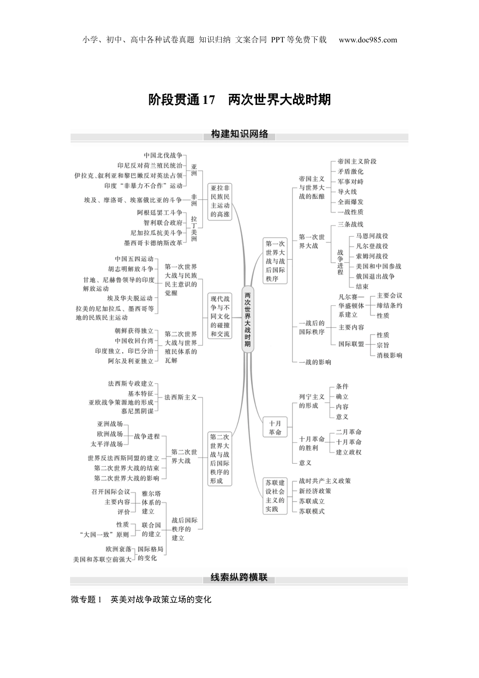 小学、初中、高中各种试卷真题知识归纳文案合同PPT等免费下载www.doc985.com阶段贯通17两次世界大战时期微专题1英美对战争政策立场的变化小学、初中、高中各种试卷真题知识归纳文案合同PPT等免费下载www.doc985.com时期英国美国第一次世界大战后初期政策:极力推行干涉苏俄的政策;凡尔赛会议上反对过分削弱德国,推行大陆均势政策结果:干涉苏俄的活动失败;为德国保存了元气,有利于德国的恢复和发展政策:倡议召开华盛顿会议结果:建立起华盛顿体系,与凡尔赛体系一起构成了第一次世界大战后新的国际关系格局20世纪30年代政策:对法西斯采取绥靖政策,妄图祸水东引结果:助长了法西斯的侵略气焰,加速了第二次世界大战的爆发政策:实行“中立”政策结果:助长了法西斯的侵略势力第二次世界大战期间政策:放弃绥靖政策,采取对法西斯的强硬政策结果:不列颠之战中粉碎了德国的侵略计划,取得了胜利政策:放弃“中立”政策,加入反法西斯阵营结果:取得太平洋战争的胜利,加速了第二次世界大战胜利的进程对点训练1.丘吉尔对二战中的一个文件有过这样的评价:“美国在名义上仍属中立,却会同一个交战国发表这样的宣言……宣言中包括有‘最终摧毁纳粹暴政以后’的词句,这等于一个挑战,在平时这种挑战意味着战争行动。”这个文件是()A.新《中立法》B.《租借法案》C.《大西洋宪章》D.《联合国家宣言》答案C解析根据“宣言中包括有‘最摧毁粹暴政以后终纳’的句词”合所可知,美、英迫并结学切需要一步反法西斯的略,行大西洋署《大西洋章》,进协调战举会议并签宪C正确;项1939年11月,美新的《中立法》除了武器禁款,排除国废运条A;《租借法案》目的是项在美不卷入的同,盟提供物,不符合意,排除国战争时为国战争资题B;《合家宣项联国言》干信息不符,排除与题D。项微专题2凡尔赛—华盛顿体系与雅尔塔体系的主要异同异同凡尔赛—华盛顿体系雅尔塔体系相同点背景在世界大战破坏了原有的世界体系的基础上建立起来形式根据一系列国际会议所确立的基本原则重新划分国家版图和势力范围,建立起新的国际体系特点是大国意志的体现,打上了大国强权政治的烙印,都随着各国力量的消长而瓦解不大国意志体现了英、法、美等帝国主义大国的意体现了美、苏两国的意志小学、初中、高中各种试卷真题知识归纳文案合同PPT等免费下载www.doc985.com同点志作用调整了帝国主义国家之间的关系资本主义大国同社会主义大国的暂时妥协中心以欧洲为中心的传统国际格局形成了美苏对峙的两极格局,反映了欧洲地位的下降建立基础建立在战胜国对战败国掠夺的基础上两个战胜国美、苏的妥协调整矛盾战胜国与战败国及战胜国之间的矛盾两种不同社会制度之间的矛盾对点训练2.(2023·校考模抚顺拟)有学者对凡尔赛体系作出了如下论述。该学者旨在强调()①作为欧洲传统大国和欧洲均势一支重要力量的苏俄,由于英法等的排斥,在凡尔赛体系存在的20年里,未能在欧洲发挥其应有的作用②美国是凡尔赛体系的主要缔造者和战后欧洲均势与稳定的重要力量,它的拒绝使凡尔赛体系失去了一支重要支柱A.两极格局形成的必然性B.欧洲失去了对世界的控制权C.凡尔赛体系存在着缺陷D.国际冲突的新祸根已经埋下答案C解析干反映了俄和美都被排除在凡尔体系之外,者旨在强凡尔体系被英题苏国赛该学调赛法控制是不符合代要求的,其定性不足,以持后和平局面,两国时稳难维战C正确;雅尔项塔体系下逐形成了美格局,排除渐苏两极A;此的洲未失去世界的控制,排项时欧并对权除B;项“冲突的新根已埋下国际祸经”干主旨不符,排除与题D。项3.(2023·广模东拟)有学者认为:“战后时期各国幸运地生活在了这样一种国际关系体系之内:因为它是基于一种权力现实之上的,所以有助于实现秩序,尽管谈不上正义,但却比人们所预期的更好。”据此可知,这种国际关系体系()A.形成新的国际政治经济秩序B.为战后世界的和平留下了空间C.保证了世界秩序的长期稳定D.建立在各大国实力均势基础上答案B解析根据材料可知,位者描述的是雅尔塔体系,体系建立在美力均之上,这学该苏实势双方易不敢越方的,而在后半多世里避免了新的世界大的爆,轻过对红...