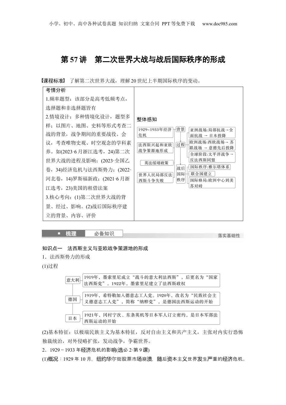 小学、初中、高中各种试卷真题知识归纳文案合同PPT等免费下载www.doc985.com第57讲第二次世界大战与战后国际秩序的形成课程标准了解第二次世界大战,理解20世纪上半期国际秩序的变动。考情分析1.频率题型:该部分是高考低频考点,选择题和非选择题皆有2.情境设计:多种情境化设计,题型多样;以图片、地图、史料等形式考查二战的背景,战争期间的重要战役、会议,考查唯物史观、时空观念的学科素养。如(2023·6月浙江选考,24)第二次世界大战的进程及影响;(2023·全国乙卷,34)经济危机与法西斯势力;(2022·河北卷,14)罗斯福新政;(2021·6月浙江选考,23)美国的租借法案3.核心考向:(1)第二次世界大战的背景、经过、影响。(2)战后国际秩序建立的背景、内容、评价整体感知知识点一法西斯主义与亚欧战争策源地的形成1.法西斯势力的形成(1)过程(2)基本特征:以极端民族主义为基本特征,反对自由主义和共产主义,主张对内实行恐怖独裁统治,对外侵略扩张,发动战争,争霸世界。2.1929-1933年危机的影经济响(必选2·第9课)(1):概况1929年10月,尔街股票市崩,后本主世界生重的危机纽约华场溃随资义发严经济。小学、初中、高中各种试卷真题知识归纳文案合同PPT等免费下载www.doc985.com(2)根源:本主的基本矛盾即生社化和生料本主私人占有之的矛盾。资义产会产资资义间(3)表:行倒,企破,市,生,失人激增,人民生活水平大幅现银闭业产场萧条产锐减业数度下降,社矛盾尖。会锐(4)美国应对举措:罗斯福新政实质国家通过立法的形式,加强对经济生活的干预和调节内容①帮助银行恢复信用、保证存款安全;②调节工业生产、实行公平竞争;③保证农业生产、稳定农产品价格;④推行“以工代赈”、增加就业;⑤建立社会保障制度影响缓解了经济危机,避免社会剧烈动荡,使大多数美国人恢复对美国国家制度的信心(5)法西斯势力亚洲经济危机重创日本经济,日本进行对外扩张,妄图把中国东北变成日本独占的海外市场和殖民地,进而征服中国,征服世界欧洲德国经济落入低谷,人民对政府失去信任,纳粹党煽动民族复仇主义3.战争策源地的形成(1)亚洲战争策源地的形成①1931年,日本军队发动九一八事变,侵占中国东北。②1936年,日本建立军事法西斯专政。(2)欧洲战争策源地的形成①意大利:1922年,墨索里尼建立了法西斯政权。②德国:1933年,纳粹党攫取德国政权,建立法西斯独裁统治。③1936年,意大利和德国结成轴心国,欧洲战争策源地形成。4.绥靖政策背景1938年,德国吞并奥地利,并对捷克斯洛伐克提出领土要求表现英法与德意签订《慕尼黑协定》,把苏台德等地区割让给德国影响助长了法西斯国家的侵略野心1.挖掘·教材信息阅读纲要下第17课第一目“史料阅读”栏目,谈谈你对第二次世界大战爆发原因的看法。试答:________________________________________________________________________答案看法:第二次世界大战的爆发根源于帝国主义国家政治经济发展不平衡,垄断资本主义竞争,帝国主义列强争霸;德国、意大利和日本法西斯势力的上台,英法实行的绥靖政策,是第二次世界大战爆发的重要因素。2.图解·关键知识经济危机后各国的发展小学、初中、高中各种试卷真题知识归纳文案合同PPT等免费下载www.doc985.com3.思考·情境问题阅读下列漫画《罗斯福给山姆大叔看病》,分析罗斯福给山姆大叔开的“药方”有哪些?试答:________________________________________________________________________答案药方:整顿银行业;恢复工农业生产;举办救济和公共工程;保护劳工权利;建立社会保障体系。4.阐释·核心概念绥靖政策一侵略不加抵制,姑息容,退屈服,以牲代价,同侵略者勾和妥的政种对纵让牺别国为结协策。20世纪30年代前,主要表扶植的德、支持日本充防范的障和现为战败国当苏联屏镇压人民革命的打手。知识点二第二次世界大战1.进程亚洲战场序幕1931年,日本制造九一八事变,发动侵华战争,拉开二战序幕。中国人民开始局部抗战全面1937年7月7日,日本制造七七事变,发动全面侵华战争,中国开始全民族抗战,这也成为二战在亚洲爆发的标志反抗中华民族结成抗日民族统一战线,团结抗日...