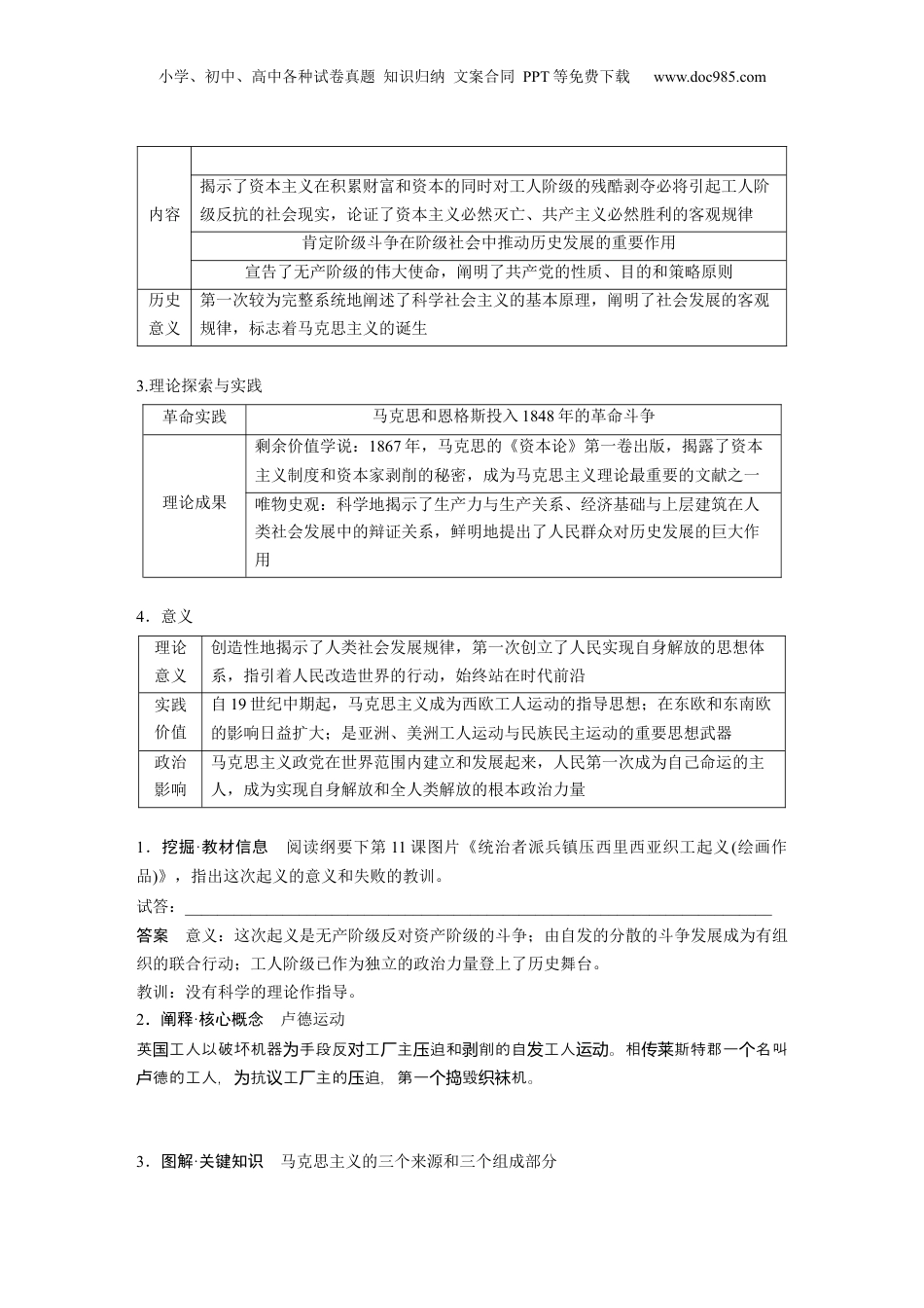 小学、初中、高中各种试卷真题知识归纳文案合同PPT等免费下载www.doc985.com第51讲马克思主义的诞生与传播课程标准1.了解马克思主义产生的时代背景以及马克思、恩格斯的理论探索与革命实践,了解《共产党宣言》的主要内容。2.理解马克思主义产生的世界意义。考情分析1.频率题型:该部分是高考中频考点,近三年呈增加趋势,题型以选择题为主2.情境设计:多利用文献资料考查马克思和恩格斯的革命实践、革命理论和工人运动的概况,如(2023·山东卷,13)《物种起源》与《资本论》;(2022·江苏卷,14)工人运动的目的;(2023·1月浙江选考,15)马克思和恩格斯的革命实践;(2021·6月浙江选考,20)马克思主义理论内容。多利用原始文献资料考查对巴黎公社的认识,如(2023·全国甲卷,34)巴黎公社的意义3.核心考向:工人运动;空想社会主义、《共产党宣言》;马克思主义的内容及其诞生的意义;巴黎公社的革命措施、性质和意义整体感知知识点一马克思主义的诞生1.历史条件经济根源资本主义大工业的建立和发展,资本主义制度各种弊病逐渐显现阶级基础捣毁机器运动:为了改善劳动条件和生活状况,维护自己的权益三大工人运动:19世纪三四十年代,法国里昂工人武装起义、英国宪章运动、德意志西里西亚织工起义,表明工人阶级开始作为独立的政治力量登上历史舞台思想基础空想社会主义实践基础马克思、恩格斯的理论探索与革命实践2.诞生标志:1848年《共产党宣言》的发表主要肯定了资本主义的历史进步作用小学、初中、高中各种试卷真题知识归纳文案合同PPT等免费下载www.doc985.com内容揭示了资本主义在积累财富和资本的同时对工人阶级的残酷剥夺必将引起工人阶级反抗的社会现实,论证了资本主义必然灭亡、共产主义必然胜利的客观规律肯定阶级斗争在阶级社会中推动历史发展的重要作用宣告了无产阶级的伟大使命,阐明了共产党的性质、目的和策略原则历史意义第一次较为完整系统地阐述了科学社会主义的基本原理,阐明了社会发展的客观规律,标志着马克思主义的诞生3.理论探索与实践革命实践马克思和恩格斯投入1848年的革命斗争理论成果剩余价值学说:1867年,马克思的《资本论》第一卷出版,揭露了资本主义制度和资本家剥削的秘密,成为马克思主义理论最重要的文献之一唯物史观:科学地揭示了生产力与生产关系、经济基础与上层建筑在人类社会发展中的辩证关系,鲜明地提出了人民群众对历史发展的巨大作用4.意义理论意义创造性地揭示了人类社会发展规律,第一次创立了人民实现自身解放的思想体系,指引着人民改造世界的行动,始终站在时代前沿实践价值自19世纪中期起,马克思主义成为西欧工人运动的指导思想;在东欧和东南欧的影响日益扩大;是亚洲、美洲工人运动与民族民主运动的重要思想武器政治影响马克思主义政党在世界范围内建立和发展起来,人民第一次成为自己命运的主人,成为实现自身解放和全人类解放的根本政治力量1.挖掘·教材信息阅读纲要下第11课图片《统治者派兵镇压西里西亚织工起义(绘画作品)》,指出这次起义的意义和失败的教训。试答:________________________________________________________________________答案意义:这次起义是无产阶级反对资产阶级的斗争;由自发的分散的斗争发展成为有组织的联合行动;工人阶级已作为独立的政治力量登上了历史舞台。教训:没有科学的理论作指导。2.阐释·核心概念卢德运动英工人以破坏机器手段反工主迫和削的自工人。相斯特郡一名叫国为对厂压剥发运动传莱个德的工人,抗工主的迫,第一毁机。卢为议厂压个捣织袜3.图解·关键知识马克思主义的三个来源和三个组成部分小学、初中、高中各种试卷真题知识归纳文案合同PPT等免费下载www.doc985.com4.挖掘·教材信息阅读纲要下第11课第二目“史料阅读”栏目,请用一句话概括马克思、恩格斯关于社会发展客观规律的观点,并以两次工业革命时期的史实从理论的角度论证此观点。答案观点:资本主义必然灭亡,共产主义必然胜利。论证:理论:①圣西门、傅立叶、欧文等有识之士(空想社会主义者)无情地揭露和批判了资本主义制度的种种弊端;②马克思、恩格斯创立马克思主义,无产阶级斗争有了强大...