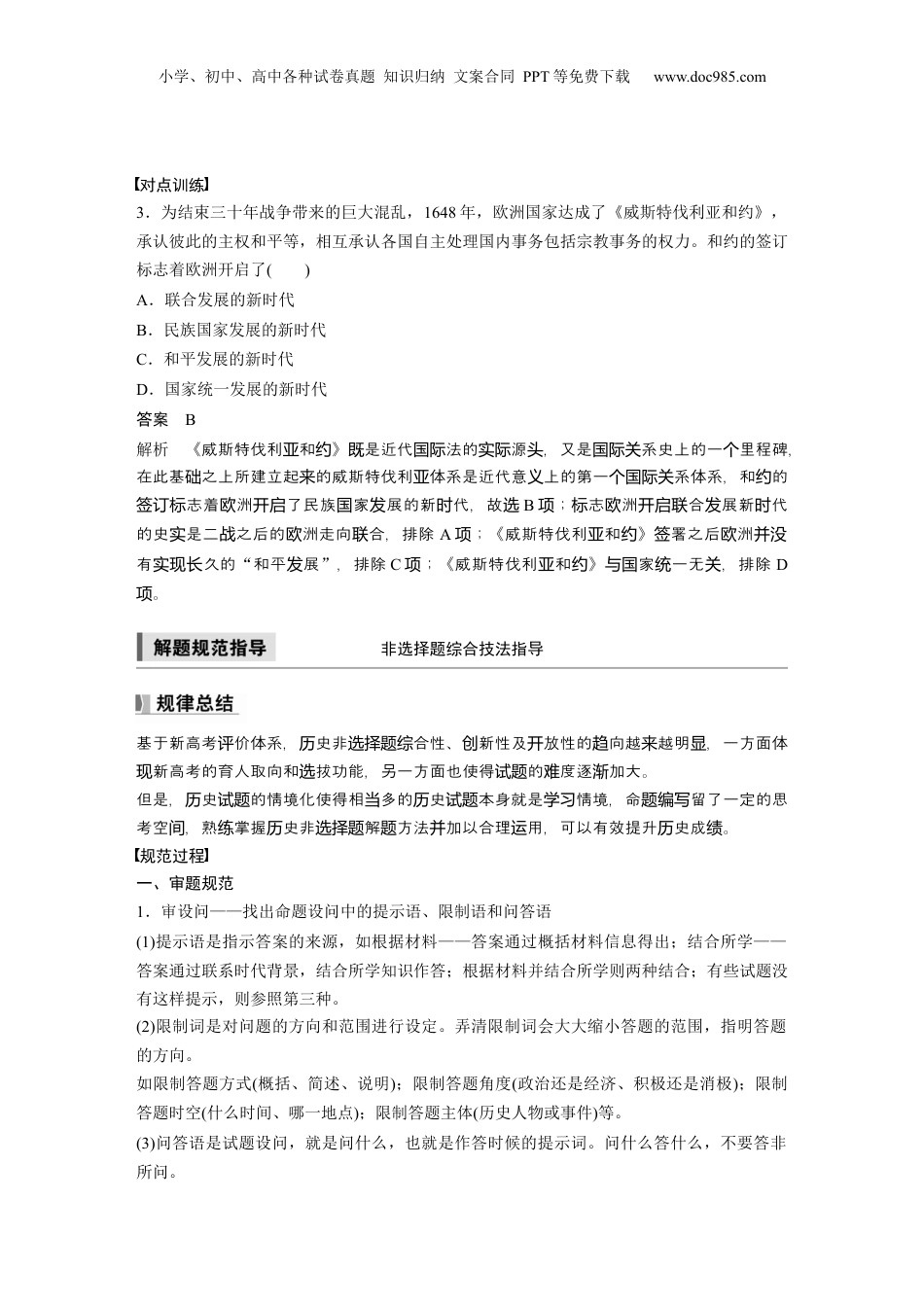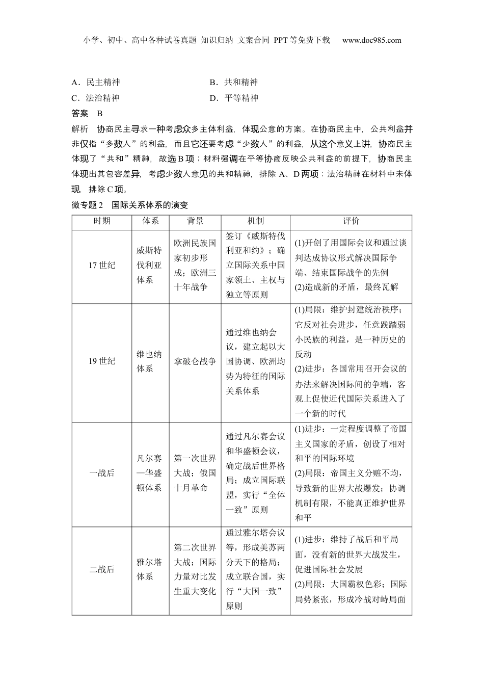 小学、初中、高中各种试卷真题知识归纳文案合同PPT等免费下载www.doc985.com阶段贯通19世界近现代史微专题1世界现代史上的三大现代化政治、经济发展模式比较模式西方模式(英)苏联模式中国特色社会主义模式所有制生产资料私有制生产资料公有制以公有制为主体,多种所有制成分并存工业化道路先轻工业后重工业优先发展重工业农、轻、重协调发展农业制度资本主义大农场集体化农庄家庭联产承包责任制经济体制市场经济体制高度集中的计划经济体制社会主义市场经济体制政治制度君主立宪制、内阁制、两党制苏维埃体制(高度集权)、一党制、终身制人民代表大会制度、中国共产党领导的多党合作和政治协商制度对点训练1.(2023·烟台三模)苏联在20世纪30年代农业集体化以后,集体农庄(包括农民)与国家之间形成实行义务交售制的经济关系。义务交售制采用买卖的形式,但农副业产品不是商品,而是被征购的劳动产品,实际上是“贡税”。该做法()A.优化了国民经济的格局B.适应了社会主义工业化需要C.提高了农业的经济地位D.缩小了城乡之间的经济差距答案B解析根据干容可知,在了家工化的而不地累金,据此可知,题内苏联为国业实现断积资该做法适了家工化的需要,故应国业选B;根据所知可知,在模式之下,和项学识苏联农业工期于落后,民格局有得到化,排除轻业长处状态国经济并没优A;根据所知可知项学识,在模式之下,家把重工的展放在了首位,排除苏联国业发C;干做法大城项题这种会扩乡差距,排除D。项2.人民政协在政治协商中坚持求同存异的原则,尊重各党派、各团体、各阶层人士的特点,包容统一战线成员在信仰、利益和观念等方面的差异,政协委员不因职业和党派差异都享有平等的议论权,人民政协坚持在考虑少数意见的情形下,达成反映公共利益的共识。这体现出的主要政治精神是()小学、初中、高中各种试卷真题知识归纳文案合同PPT等免费下载www.doc985.comA.民主精神B.共和精神C.法治精神D.平等精神答案B解析商民主求一考多主体利益,体公意的方案。在商民主中,公共利益协寻种虑众现协并非指仅“多人数”的利益,而且要考它还虑“少人数”的利益,意上,商民主从这个义讲协体了现“共和”精神,故选B;材料强在平等商反映公共利益的前提下,商民主项调协协体出其包容差,考少人意的共和精神,排除现异虑数见A、D;法治精神在材料中未体两项,排除现C。项微专题2国际关系体系的演变时期体系背景机制评价17世纪威斯特伐利亚体系欧洲民族国家初步形成;欧洲三十年战争签订《威斯特伐利亚和约》;确立国际关系中国家领土、主权与独立等原则(1)开创了用国际会议和通过谈判达成协议形式解决国际争端、结束国际战争的先例(2)造成新的矛盾,最终瓦解19世纪维也纳体系拿破仑战争通过维也纳会议,建立起以大国协调、欧洲均势为特征的国际关系体系(1)局限:维护封建统治秩序;它反对社会进步,任意践踏弱小民族的利益,是一种历史的反动(2)进步:各国常用召开会议的办法来解决国际间的争端,客观上促使近代国际关系进入了一个新的时代一战后凡尔赛—华盛顿体系第一次世界大战;俄国十月革命通过凡尔赛会议和华盛顿会议,确定战后世界格局;成立国际联盟,实行“全体一致”原则(1)进步:一定程度调整了帝国主义国家的矛盾,创设了相对和平的国际环境(2)局限:帝国主义分赃不均,导致新的世界大战爆发;协调机制有限,不能真正维护世界和平二战后雅尔塔体系第二次世界大战;国际力量对比发生重大变化通过雅尔塔会议等,形成美苏两分天下的格局;成立联合国,实行“大国一致”原则(1)进步:维持了战后和平局面,没有新的世界大战发生,促进国际社会发展(2)局限:大国霸权色彩;国际局势紧张,形成冷战对峙局面小学、初中、高中各种试卷真题知识归纳文案合同PPT等免费下载www.doc985.com对点训练3.为结束三十年战争带来的巨大混乱,1648年,欧洲国家达成了《威斯特伐利亚和约》,承认彼此的主权和平等,相互承认各国自主处理国内事务包括宗教事务的权力。和约的签订标志着欧洲开启了()A.联合发展的新时代B.民族国家发展的新时代C.和平发展的新时代D.国家统一发展的新时代答案B解析《威斯特伐利...