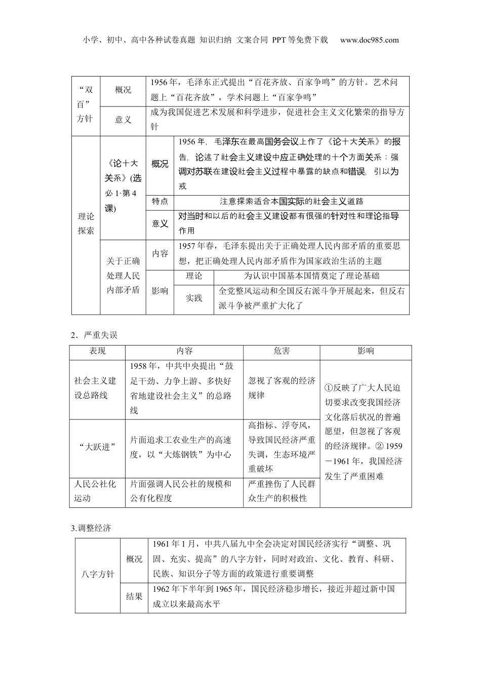 小学、初中、高中各种试卷真题知识归纳文案合同PPT等免费下载www.doc985.com第36讲社会主义建设在探索中曲折发展课程标准1.了解20世纪50至70年代中国探索社会主义建设道路的曲折发展和成就,认识“文化大革命”的错误及教训;2.理解政治、经济、外交、国防等领域所取得的成就在新中国历史上所具有的开创性、奠基性意义;3.了解和感悟这一时期中国人民艰苦奋斗、奋发图强的精神风貌;4.了解毛泽东对中国革命和社会主义建设的贡献,认识毛泽东思想对近现代中国的深远影响。考情分析整体感知1.频率题型:该部分是高考重要考点,以选择题为主,非选择题也多有涉及2.情境设计:多利用文献、图表、漫画等形式创设情境,以社会主义探索时期的成功探索和成就,考查唯物史观、时空观念、家国情怀等学科素养。如(2023·1月浙江选考,9)自力更生、艰苦奋斗的建设成果;(2023·全国甲卷,42)伟大的建设成就;(2023·江苏卷,10)全面建设社会主义;(2023·全国乙卷,30)社会主义文化艺术的发展;(2021·天津卷,8)国民经济调整3.核心考向:中共八大、国民经济的调整、三线建设、科技成就、20世纪70年代的外交突破知识点一全面建设社会主义1.良好开端中共八大(1956年)背景社会主义工业化取得重大进展;社会主义基本制度在中国已经建立起来内容(1)主要矛盾:人民对于建立先进的工业国的要求同落后的农业国的现实之间的矛盾,人民对于经济文化迅速发展的需要同当前经济文化不能满足人民需要的状况之间的矛盾。(2)主要任务:解决主要矛盾,把我国尽快地从落后的农业国变为先进的工业国影响我国建设社会主义道路的一次成功探索,为全面建设社会主义指明了方向小学、初中、高中各种试卷真题知识归纳文案合同PPT等免费下载www.doc985.com“双百”方针概况1956年,毛泽东正式提出“百花齐放、百家争鸣”的方针。艺术问题上“百花齐放”,学术问题上“百家争鸣”意义成为我国促进艺术发展和科学进步,促进社会主义文化繁荣的指导方针理论探索《十大论系》关(选必1·第4课)概况1956年,毛在最高上作了《十大系》的泽东国务会议论关报告,述了社主建中正确理的十方面系;强论会义设应处个关在建社主程中暴露的缺点和,引以调对苏联设会义过错误为戒特点注意探索适合本的社主道路国实际会义意义和以后的社主建都有很强的性和理指对当时会义设针对论导作用关于正确处理人民内部矛盾内容1957年春,毛泽东提出关于正确处理人民内部矛盾的重要思想,把正确处理人民内部矛盾作为国家政治生活的主题影响理论为认识中国基本国情奠定了理论基础实践全党整风运动和全国反右派斗争开展起来,但反右派斗争被严重扩大化了2.严重失误表现内容危害影响社会主义建设总路线1958年,中共中央提出“鼓足干劲、力争上游、多快好省地建设社会主义”的总路线忽视了客观的经济规律①反映了广大人民迫切要求改变我国经济文化落后状况的普遍愿望,但忽视了客观的经济规律。②1959-1961年,我国经济发生了严重困难“大跃进”片面追求工农业生产的高速度,以“大炼钢铁”为中心高指标、浮夸风,导致国民经济严重失调,生态环境严重破坏人民公社化运动片面强调人民公社的规模和公有化程度严重挫伤了人民群众生产的积极性3.调整经济八字方针概况1961年1月,中共八届九中全会决定对国民经济实行“调整、巩固、充实、提高”的八字方针,同时对政治、文化、教育、科研、民族、知识分子等方面的政策进行重要调整结果1962年下半年到1965年,国民经济稳步增长,接近并超过新中国成立以来最高水平小学、初中、高中各种试卷真题知识归纳文案合同PPT等免费下载www.doc985.com“四个现代化”概况1964年,三届全国人大一次会议提出建设“四个现代化”(工业现代化、农业现代化、国防现代化、科学技术现代化)的伟大目标,极大地激发了亿万人民建设社会主义国家的积极性1.阐释·核心概念七千人大会是1962年1月11日至2月7日中共中央在北京召的大工作。出席的有中央各开扩会议会议部、各中央局、各省、地、门县(包括重要工企和部矿业队)五干部,共级领导7118人。人地次们习惯称这会议为“七千人大会”。上,了民主,展了批自我批,初步会发扬开评与评...