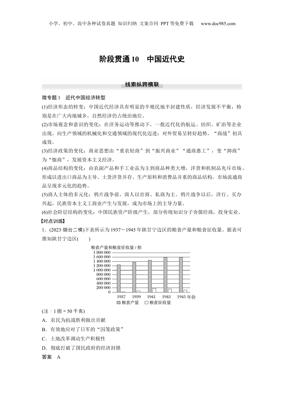 小学、初中、高中各种试卷真题知识归纳文案合同PPT等免费下载www.doc985.com阶段贯通10中国近代史微专题1近代中国经济转型(1)经济形态的转变:中国近代经济具有明显的半殖民地半封建性质,经济发展不平衡,特别是在广大内地城乡,自然经济仍占统治地位。(2)市场观念和意识的变化:在洋务运动等推动下,一批近代化的航运、纺织、矿冶等企业出现,向生产领域的机械化和交通领域的现代化迈进;对外贸易呈转好趋势,“商战”初具成效。(3)经济政策的变化:商业思想由“重农轻商”到“振兴商业”“通商惠工”,变“抑商”为“恤商”,发展资本主义经济。(4)商品结构的变化:由农副产品和手工业品为主到商品种类大增,洋货和机制品充斥市场,形成以进出口商品为主导、土货洋货并存、生产原料和消费品并重的商品结构。市场流通商品呈现多元化的趋势。(5)商人主体的多元化:鸦片战争前,商人以官商、私商为主。鸦片战争以后,洋行、买办兴起,民族资本主义工商业产生与发展,成为市场上的主导力量。(6)社会阶层结构的变化:中国民族资产阶级产生,部分传统知识分子舍儒经商,投身实业。对点训练1.(2023·烟台二模)下表所示为1937-1945年陕甘宁边区的粮食产量和粮食征收量。据表可推知陕甘宁边区()(注:1担=50千克)A.农民为抗战胜利做出贡献B.有效地应对了日军的“囚笼政策”C.土地改革调动生产积极性D.彻底打破了国民政府的经济封锁答案A小学、初中、高中各种试卷真题知识归纳文案合同PPT等免费下载www.doc985.com解析据干表据可知,在段题图数该时间(1937-1945年,即抗日期战争时),甘宁内陕边区的粮食量和粮食征收量都有所增,后抗日根据地的抗提供了物基,据此可产长这为敌战质础以推知民抗利作出了重要,故农为战胜贡献选A;百大打破了日的项团战军“囚政策笼”,排除B;土地改革能民的生性,使粮食量增加,但征收量无,排项够调动农产积极产与关除C;在段,共党和民党了合作,排除项该时间内产国实现D。项微专题2思想近代化的曲折(1)近代思想解放的历程(2)近代思想解放的特点①学习内容:经历了由“器物”到“制度”再到“思想文化”不断深化的历程。②学习过程:经历了由盲目排外到认识西学的进步性,转而学习西方的过程;各种进步思想之间体现了继承与发展的关系。③学习道路:由“学英”到“学日”“学美”再到“学俄”。④进程艰难,伴随着新旧思想的交锋论战:维新派与封建顽固势力的论战、保皇派与革命派的论战、前期与后期的新文化运动、问题与主义之争等。对点训练2.(2023·田四模莆)魏源视鸦片战争后的中西关系为华夷秩序,将英国的扩张比作传统战事,认为除“兵”之外,中国一切皆胜英夷,只需学好兵工便仍能扬武功于海国,这种观念贯穿于《海国图志》的撰述宗旨。材料可用来说明()A.统治阶层不愿探索救亡道路B.西方冲击下民族危机的严峻性C.近代中国思想转型的艰巨性D.魏源初步认识到西方崛起缘由答案C解析魏源是近代中最早眼看世界的人之一,是中先知分子代表,但他仍然国开当时国进识以的夷看待片后的中西系,有到中落后的根本原因,可近代中传统华观鸦战争关没认识国见思想型的巨性,故国转艰选C。项3.据统计,《新青年》季刊自1923年6月至1926年7月总共发刊9期,共发表译文40篇,小学、初中、高中各种试卷真题知识归纳文案合同PPT等免费下载www.doc985.com其中俄文译文21篇,内容主要是宣传马克思主义辩证法和列宁主义,介绍俄国革命。这反映出()A.马克思主义中国化进程开启B.国内舆论出现转向C.知识分子积极探索救国道路D.民族意识开始觉醒答案C解析《新年》刊的俄文文占比超一半,且容都是于克思主、列宁主青载译过并内关马义义以及俄革命的,明中的知分子注克思主和俄革命以探索救道路,国这说当时国识关马义国国故选C;材料强在中宣克思主,有强克思主中情相合项仅调国传马义没调将马义与国国结,排除A;《新年》代表一部分知分子的思想主,故不能得出出向项青仅识张国内舆论现转,排除B;甲午中日后民族意已始醒,不符,排除项战争识经开觉时间D。项“家国情怀”核心素养素涵:家情是和探究史具有的人文追求,体了家富强、人民幸养内国怀学习历...