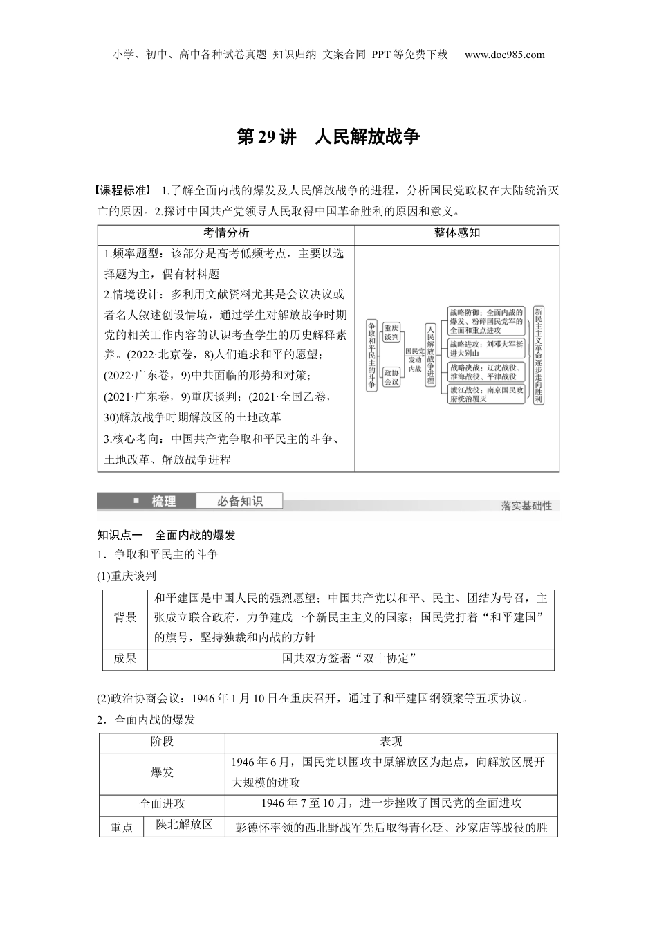 小学、初中、高中各种试卷真题知识归纳文案合同PPT等免费下载www.doc985.com第29讲人民解放战争课程标准1.了解全面内战的爆发及人民解放战争的进程,分析国民党政权在大陆统治灭亡的原因。2.探讨中国共产党领导人民取得中国革命胜利的原因和意义。考情分析整体感知1.频率题型:该部分是高考低频考点,主要以选择题为主,偶有材料题2.情境设计:多利用文献资料尤其是会议决议或者名人叙述创设情境,通过学生对解放战争时期党的相关工作内容的认识考查学生的历史解释素养。(2022·北京卷,8)人们追求和平的愿望;(2022·广东卷,9)中共面临的形势和对策;(2021·广东卷,9)重庆谈判;(2021·全国乙卷,30)解放战争时期解放区的土地改革3.核心考向:中国共产党争取和平民主的斗争、土地改革、解放战争进程知识点一全面内战的爆发1.争取和平民主的斗争(1)重庆谈判背景和平建国是中国人民的强烈愿望;中国共产党以和平、民主、团结为号召,主张成立联合政府,力争建成一个新民主主义的国家;国民党打着“和平建国”的旗号,坚持独裁和内战的方针成果国共双方签署“双十协定”(2)政治协商会议:1946年1月10日在重庆召开,通过了和平建国纲领案等五项协议。2.全面内战的爆发阶段表现爆发1946年6月,国民党以围攻中原解放区为起点,向解放区展开大规模的进攻全面进攻1946年7至10月,进一步挫败了国民党的全面进攻重点陕北解放区彭德怀率领的西北野战军先后取得青化砭、沙家店等战役的胜小学、初中、高中各种试卷真题知识归纳文案合同PPT等免费下载www.doc985.com进攻利山东解放区陈毅、粟裕指挥华东野战军取得孟良崮战役的胜利3.国民党政权的统治危机措施影响滥发纸币造成国统区严重的通货膨胀,物价飞涨巧取豪夺导致国统区人民生活水平不断下降《中华民国宪法》暴露了国民党坚持独裁和内战的真面目1.图解·关键知识抗战胜利后的中国时局2.阐释·核心概念第二条战线指解放期在中共党的一政策成功用和影下,民党治广大战争时国产统战线运响国统区爱国学生、工人、市民及其他人民群广泛加的,以反民党政的、裁、政阶层众参对国权内战独卖国策主要容的民主。相于中共党的人民武装反民党的事斗为内爱国运动对国产领导对国军队军而言,是第二。争战线这条战线3.思考·情境问题下是君武先生在抗日后作的一幅漫,名《磨好刀再》。图华战争画为杀这幅画讽刺了当时的什么现象?答案抗日战争胜利后,蒋介石一方面打着“和平建国”的旗号,电邀毛泽东赴重庆谈判;另一方面却积极准备发动内战。知识点二新民主主义革命的胜利1.解放区的土地改革(1)内容:1947年夏,中共中央制定《中国土地法大纲》,在各解放区废除封建性及半封建性剥削制度。(2)意义:亿万农民在政治上、经济上获得了解放,他们积极支援解放战争,成为解放战争取得胜利的重要保证。2.解放区的人民政权小学、初中、高中各种试卷真题知识归纳文案合同PPT等免费下载www.doc985.com在解放区设置行政区内容政委或人民政府,各自管若干省及以下行政位设军员会辖级单(必选1·第3课)意义固新的人民政,新中的政建奠定了基巩兴权为国权设坚实础(选必1·第3课)民族区域自治制度1947年,蒙古地成立蒙古自治内区内区(必选1·第13课)发行人民币北人民政府于华1948年12月1日在河北石家庄成立中人民行,国银开始一行人民统发币(必选1·第15课)3.解放战争胜利表现军事胜利战略进攻1947年6月,刘邓大军千里跃进大别山战略决战1948年9月至1949年1月,发动辽沈、淮海、平津三大战役渡江战役1949年4月,解放南京,推翻国民政府统治西柏坡会议(中共七届二中全会)内容党的工作重心必须由乡村转移到城市;提出革命胜利后党在各方面的基本政策;保持党的优良作风意义解决了中国由新民主主义革命向社会主义革命转变的重大问题北平和谈1949年4月,中共代表团和国民党南京政府代表团在北平举行和平谈判,但谈判最终破裂根本原因中国共产党能够始终顺应时代发展的潮流,代表了中国最广大人民的根本利益,得到了广大民众的支持意义是马克思主义普遍原理与中国革命具体实践相结合的胜利,是毛泽东思想的胜利,从根本上改变了中国社会的发展方向,是20世纪人类历...