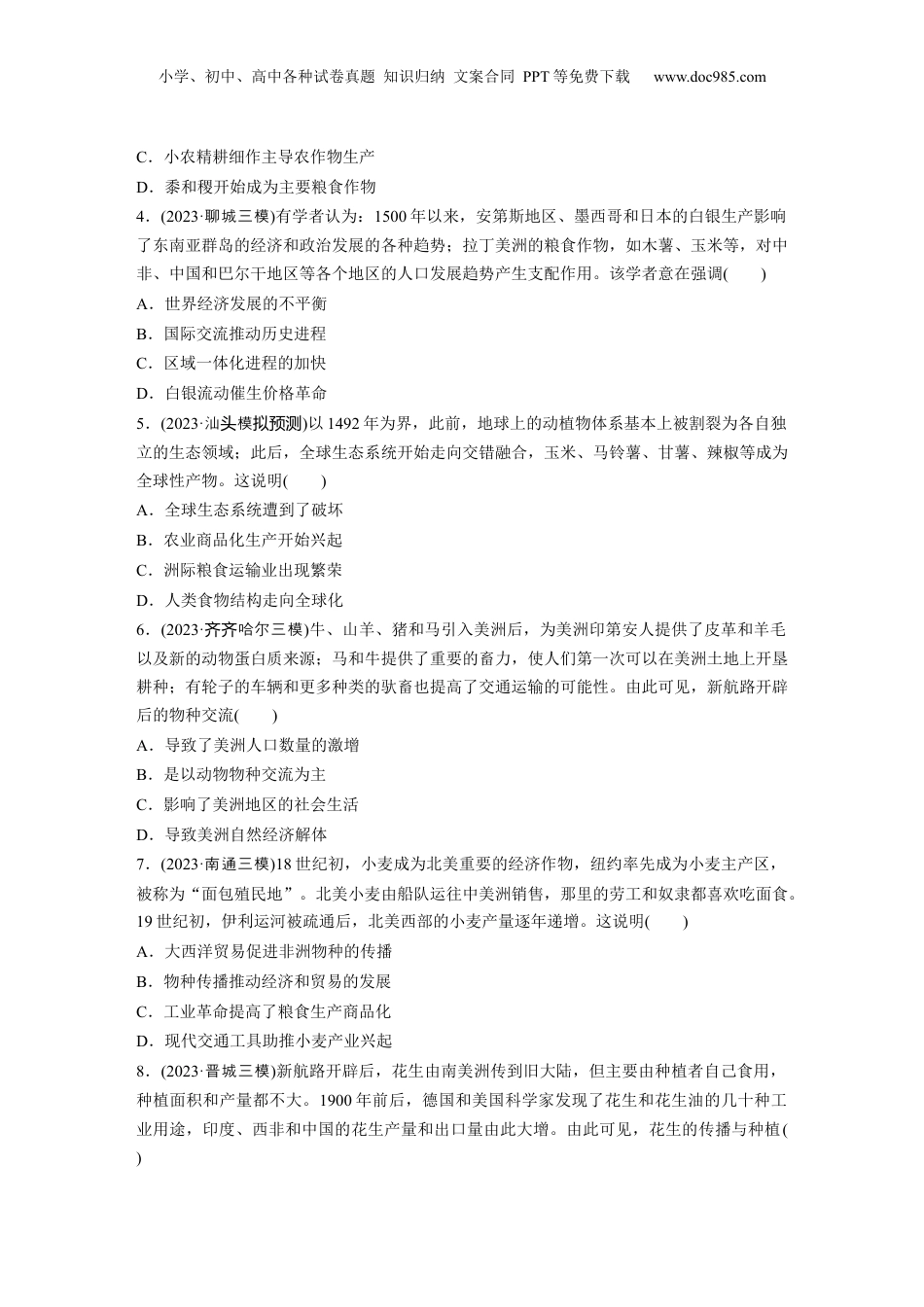 小学、初中、高中各种试卷真题知识归纳文案合同PPT等免费下载www.doc985.com一、选择题(每题3分,共36分)1.(2023·南模济拟检测)许倬云教授认为:现在常说的“新石器”与“旧石器”时代,是以人类获取食物来维持生计的方式为分界线的。从旧石器时代采集食物,到新石器时代生产食物。从中我们可以看出,许倬云认为划分新旧石器时代的分界线是()A.天然火的运用B.打制石器的使用C.群居生活的出现D.原始农业的兴起2.(2023·湛江一模)如图是古埃及拉美西斯二世(在位时间为公元前1279-公元前1213年)时期的墓葬壁画《森尼杰姆夫妇在田野上》,壁画描绘了森尼杰姆夫妇耕地播种、收割稻谷、礼拜神灵的场面。这反映了当时埃及()A.文明起源和农业间的关系B.农业经营呈现多元化特色C.灌溉农业生产的发展状况D.百姓过着较为富裕的生活3.(2023·太原一模)下图是《诗经》中出现粮食作物词汇的诗歌采集地,据此可合理推知,当时()(注:黍:大米;稷:干旱谷,有也指黍或高粱;禾:即粟,小米,后也指水稻;备黄时黄秬:黑黍子,古人嘉谷;牟:大小子;视为来麦统称稌:糯稻)A.已经形成南稻北粟的种植格局B.农业活动较集中于黄河中下游小学、初中、高中各种试卷真题知识归纳文案合同PPT等免费下载www.doc985.comC.小农精耕细作主导农作物生产D.黍和稷开始成为主要粮食作物4.(2023·聊城三模)有学者认为:1500年以来,安第斯地区、墨西哥和日本的白银生产影响了东南亚群岛的经济和政治发展的各种趋势;拉丁美洲的粮食作物,如木薯、玉米等,对中非、中国和巴尔干地区等各个地区的人口发展趋势产生支配作用。该学者意在强调()A.世界经济发展的不平衡B.国际交流推动历史进程C.区域一体化进程的加快D.白银流动催生价格革命5.(2023·汕模头拟预测)以1492年为界,此前,地球上的动植物体系基本上被割裂为各自独立的生态领域;此后,全球生态系统开始走向交错融合,玉米、马铃薯、甘薯、辣椒等成为全球性产物。这说明()A.全球生态系统遭到了破坏B.农业商品化生产开始兴起C.洲际粮食运输业出现繁荣D.人类食物结构走向全球化6.(2023·哈尔三模齐齐)牛、山羊、猪和马引入美洲后,为美洲印第安人提供了皮革和羊毛以及新的动物蛋白质来源;马和牛提供了重要的畜力,使人们第一次可以在美洲土地上开垦耕种;有轮子的车辆和更多种类的驮畜也提高了交通运输的可能性。由此可见,新航路开辟后的物种交流()A.导致了美洲人口数量的激增B.是以动物物种交流为主C.影响了美洲地区的社会生活D.导致美洲自然经济解体7.(2023·南通三模)18世纪初,小麦成为北美重要的经济作物,纽约率先成为小麦主产区,被称为“面包殖民地”。北美小麦由船队运往中美洲销售,那里的劳工和奴隶都喜欢吃面食。19世纪初,伊利运河被疏通后,北美西部的小麦产量逐年递增。这说明()A.大西洋贸易促进非洲物种的传播B.物种传播推动经济和贸易的发展C.工业革命提高了粮食生产商品化D.现代交通工具助推小麦产业兴起8.(2023·晋城三模)新航路开辟后,花生由南美洲传到旧大陆,但主要由种植者自己食用,种植面积和产量都不大。1900年前后,德国和美国科学家发现了花生和花生油的几十种工业用途,印度、西非和中国的花生产量和出口量由此大增。由此可见,花生的传播与种植()小学、初中、高中各种试卷真题知识归纳文案合同PPT等免费下载www.doc985.comA.主要缘于工业革命进程的推进B.以世界市场的最终形成为前提C.迅速提高了农业的商品化程度D.受到科学技术发展水平的影响9.(2023·沙二模长)1850年,美国引进的谷仓技术无须大量人力,收割机使几个人就能收获大量庄稼。1862年,林肯颁布了《宅地法》,人们通过极便宜的价格得到大片土地。随后40年里有5亿公顷土地加入农场行业。这说明美国农场业发展迅速主要得益于()A.《宅地法》维护农场主的利益B.工业革命助力粮食规模生产C.高度集约的现代农业日益壮大D.南北战争解放了黑人生产力10.(2023·沙模长拟预测)为了保障小麦的产量和质量,其最理想的收割时间是麦穗成熟的前一天和当天。20世纪三四十年代的河南、山东草帽辫(原料是麦秆,即小麦生产的手工副产...