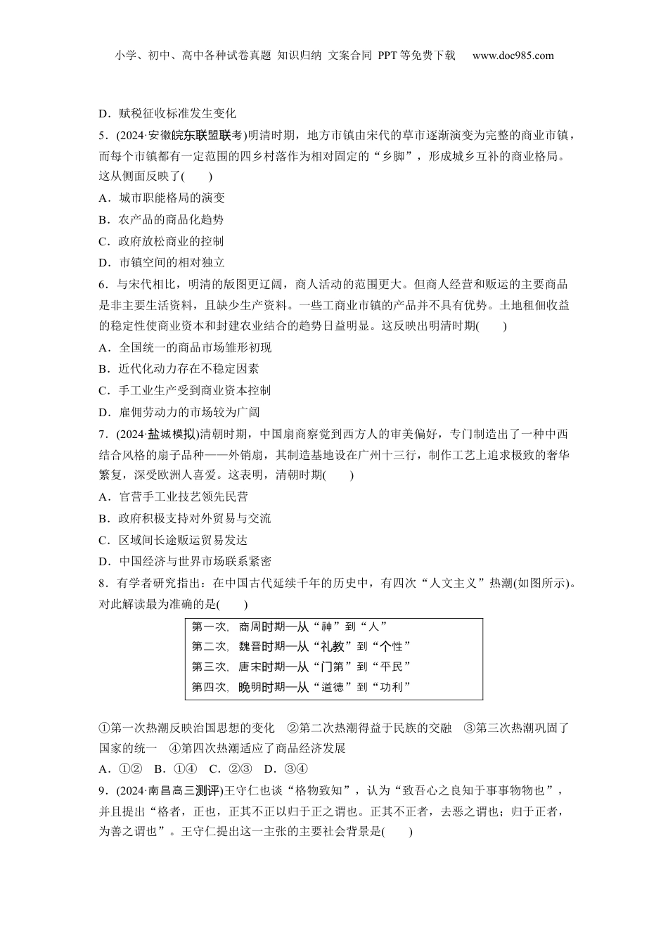 小学、初中、高中各种试卷真题知识归纳文案合同PPT等免费下载www.doc985.com一、选择题(每题3分,共48分)1.(2024·州郑调研)明末小说集《醒世恒言》中描绘了一些商人的形象,如卖油郎秦重因其卖货不缺斤少两,为其之后的发展打下了良好的经营基础。普通商人吕大郎,偶然拾得二百两白银,仔细寻访,物归原主。材料中这些小说对商人形象的描绘()A.表明商品经济领域出现新现象B.迎合了新兴资产阶级的需求C.反映了传统社会等级结构松动D.体现了社会主流思想的影响2.(2024·广南粤名校考东联)明代徐光启所著《农政全书》,全书共六十卷,分十二门:农本、田制、农事、水利、农器、树艺、蚕桑、蚕桑广类、种植、收养、制造、荒政。这反映了()A.中西农业思想的交汇B.以农治国的农业生态观C.农本商末的经济思想D.农工商皆本的撰写宗旨3.(2023·唐山模拟检测)棉纺织业中资本主义性质的工场手工业稀疏出现,是经过了长达四、五百年的孕育过程,直到清初才脱胎降世的,而棉布生产的普遍形式,则仍为农家的副业。出现这些现象的历史原因是()A.封建社会市场有效需求不足B.海外棉纺织品具有竞争优势C.棉纺织技术阻碍其市场推广D.新型生产关系阻碍社会进步4.(2023·武高三汉调研)下表为松江府垦田数和上交的夏秋两税在全国的比重表。年份垦田占全国百分比夏秋税粮占全国百分比洪武二十六年0.60%6.50%弘治九年0.76%6.23%万历六年0.61%6.24%由上表可知()A.区域经济结构的新变化B.江南地区社会矛盾尖锐C.江南地区赋税负担沉重小学、初中、高中各种试卷真题知识归纳文案合同PPT等免费下载www.doc985.comD.赋税征收标准发生变化5.(2024·安徽皖盟考东联联)明清时期,地方市镇由宋代的草市逐渐演变为完整的商业市镇,而每个市镇都有一定范围的四乡村落作为相对固定的“乡脚”,形成城乡互补的商业格局。这从侧面反映了()A.城市职能格局的演变B.农产品的商品化趋势C.政府放松商业的控制D.市镇空间的相对独立6.与宋代相比,明清的版图更辽阔,商人活动的范围更大。但商人经营和贩运的主要商品是非主要生活资料,且缺少生产资料。一些工商业市镇的产品并不具有优势。土地租佃收益的稳定性使商业资本和封建农业结合的趋势日益明显。这反映出明清时期()A.全国统一的商品市场雏形初现B.近代化动力存在不稳定因素C.手工业生产受到商业资本控制D.雇佣劳动力的市场较为广阔7.(2024·城模盐拟)清朝时期,中国扇商察觉到西方人的审美偏好,专门制造出了一种中西结合风格的扇子品种——外销扇,其制造基地设在广州十三行,制作工艺上追求极致的奢华繁复,深受欧洲人喜爱。这表明,清朝时期()A.官营手工业技艺领先民营B.政府积极支持对外贸易与交流C.区域间长途贩运贸易发达D.中国经济与世界市场联系紧密8.有学者研究指出:在中国古代延续千年的历史中,有四次“人文主义”热潮(如图所示)。对此解读最为准确的是()第一次,商周期—时从“神”到“人”第二次,魏晋期—时从“礼教”到“性个”第三次,唐宋期—时从“第门”到“平民”第四次,明期—晚时从“道德”到“功利”①第一次热潮反映治国思想的变化②第二次热潮得益于民族的交融③第三次热潮巩固了国家的统一④第四次热潮适应了商品经济发展A.①②B.①④C.②③D.③④9.(2024·南昌高三测评)王守仁也谈“格物致知”,认为“致吾心之良知于事事物物也”,并且提出“格者,正也,正其不正以归于正之谓也。正其不正者,去恶之谓也;归于正者,为善之谓也”。王守仁提出这一主张的主要社会背景是()小学、初中、高中各种试卷真题知识归纳文案合同PPT等免费下载www.doc985.comA.儒家思想统治地位动摇B.教育水平低下C.程朱理学影响日渐衰微D.社会矛盾尖锐10.(2024·洛高三考阳调研试)顾炎武编修《肇域志》,“先取一统志,后取各省府州县志,后取二十一史参互书之”,内容上遍涉边防、要塞、农田、水利、赋役、粮食、屯田、矿产、交通等与现实生活、百姓利益相关的问题,密切联系“天下利病,生民疾苦”。这表明顾炎武()A.改变了学术发展方向B.注重历史研究C.重建了儒家思想体系D.倡导经世致用11.(2024·浙江百校调...