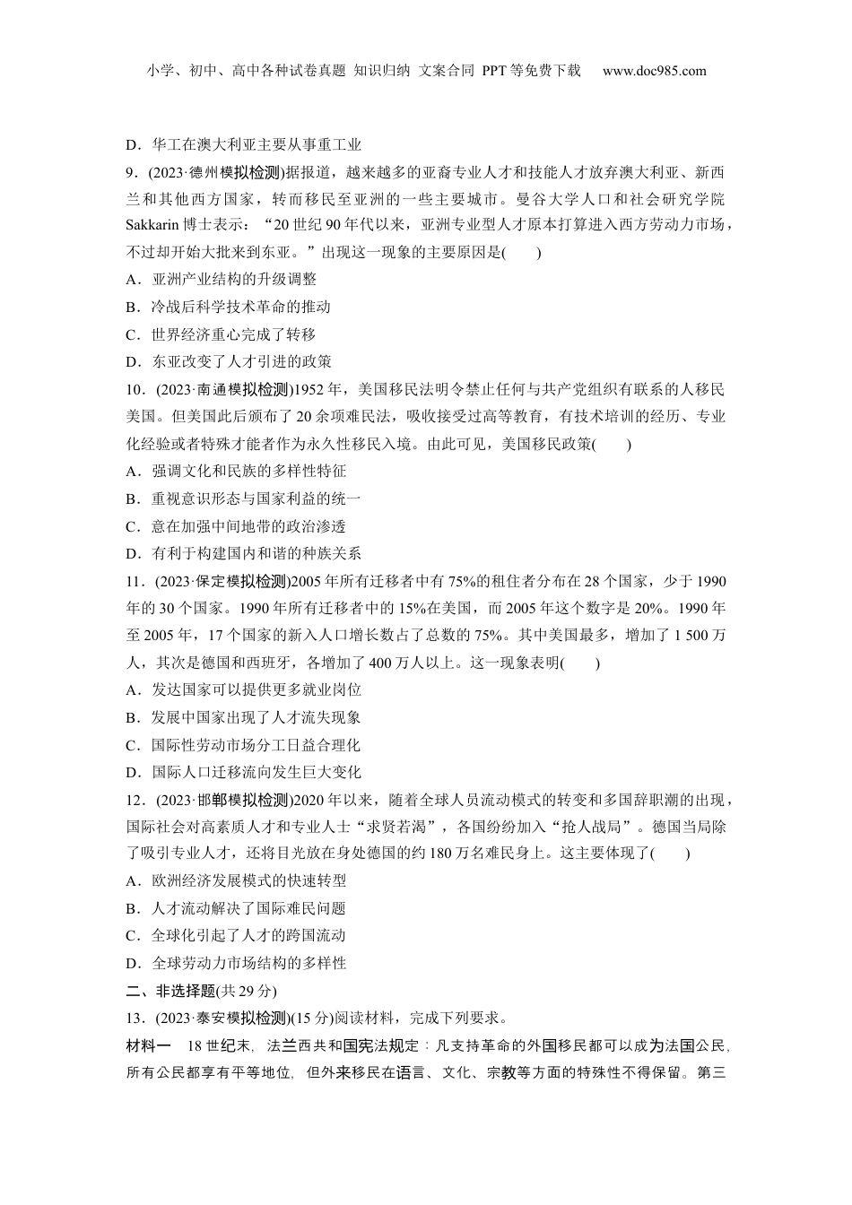 小学、初中、高中各种试卷真题知识归纳文案合同PPT等免费下载www.doc985.com一、选择题(每题3分,共36分)1.(2023·聊城模拟)阅读下表“印欧人的迁徙”,据此可知,印欧人的迁徙()原聚集地迁徙过程黑海北岸印欧人来到小亚细亚,被称为赫梯人,公元前1595年,灭古巴比伦王国,赫梯成为近东大国黑海以东印欧人分化为伊朗语族和印度语族,其中伊朗语族的波斯人在公元前6世纪建立大帝国黑海以西印欧人公元前2000年初,入侵意大利;公元前6世纪,其中的拉丁人建立了罗马A.产生了古代许多显赫一时的国家B.引发古代西亚、南亚文明的衰弱C.有利于游牧民族与农耕民族的交融D.推动了最早一批奴隶制国家的兴起2.(2023·佛山模拟)阿卡德人迁入两河流域南部时,不是将已有较高文明的苏美尔人征服、奴役,而是共同居住生息,逐渐相互融合,从而形成新的文明。公元前2千纪,印欧人来到伊朗高原后,直到公元前1000年才居于优势地位,当地原有的较发达的文明并没有因之而被摧。这反映了当时()A.农耕文明具有扩张优势B.西亚区域文化不断重构C.西亚文明演进的渐进性D.民族国家因迁徙而形成3.据西晋的史料记载,内迁的少数民族主动认同中原地区的历史和文化,如鲜卑族说自己是黄帝之子的后裔,匈奴的铁弗部自称是大禹的后代。这种现象说明()A.汉族人已全部被赶出中原B.西晋对内迁各族实行了仁政C.内迁民族全部被汉族同化D.民族交融的趋势进一步加强4.(2023·州模郑拟检测)新航路开辟后,欧洲各民族的服饰、食品、宗教与世俗的节庆娱乐、音乐、舞蹈、建筑,在新大陆触目可见:墨西哥斗牛起源于西班牙斗牛;拉美各国的音乐舞小学、初中、高中各种试卷真题知识归纳文案合同PPT等免费下载www.doc985.com蹈,处处洋溢着热烈浓郁的西班牙韵致;吉他从西班牙传入美洲,风靡四方。以上现象反映了()A.美洲本土文化遭到破坏B.殖民扩张推动美洲开发C.族群迁移推动文化扩展D.人口迁移推动种族交融5.(2023·日照模拟检测)有学者研究美国外来移民地位:1789—1880年移民是备受欢迎的财富;1880—1924年移民逐渐被看作是“威胁”而加以限制;1924—1942年移民在美国的地位跌入谷底。这一变化说明()A.世界形势变化影响移民走向B.外来移民是国家崛起的重要力量C.社会环境影响外来移民地位D.社会发展程度导致移民数量变化6.(2023·邯模郸拟检测)19世纪,英国移民在阿根廷大量兴建英式学校。据统计,19世纪40年代,在英国私立学校中,英国移民及后裔所占的比重仅为40%左右;在19世纪80年代的一份抽样调查中,40名接受调查的学生中仅1名是英国移民。英国移民此举()A.服务于资本原始积累需要B.客观上传播了资本主义文明C.具有深刻的种族歧视倾向D.促使列强收缩在拉美的扩张7.(2023·州模郑拟检测)19世纪70年代,美国太平洋铁路最终建成。这条铁路修建最为困难的西段近90%的部分由华人劳工建成,但在铁路建成之后,华人劳工未获尊重反而遭到了白人的歧视与迫害,他们只好在以旧金山都板街为中心的小范围内聚集,后来这里又迁入了新的移民,发展至今。华人劳工的聚集()A.提升了中国在世界的社会影响力B.有利于中华文化的保留与传播C.使华工成为各国建设的主要劳力D.为中国带来了巨额的外汇收入8.(2023·大同高三检测)1851年以来,大批华工前往澳大利亚淘金。据统计,当时每6个外国淘金者中就有一个中国人。华工不仅成为澳大利亚淘金热潮中的一支重要力量,还参加了当地的建设和清除丛林、开扩田地的工程。在1888年前后,约有5000名华工参与修筑了从达尔文至松湾的铁路。同时,昆士兰所有的公路都是华工修筑的。这反映了()A.华工获得了在海外发展的自由权B.华工推动近代中国国际地位提高C.华工促进了澳大利亚经济的发展小学、初中、高中各种试卷真题知识归纳文案合同PPT等免费下载www.doc985.comD.华工在澳大利亚主要从事重工业9.(2023·德州模拟检测)据报道,越来越多的亚裔专业人才和技能人才放弃澳大利亚、新西兰和其他西方国家,转而移民至亚洲的一些主要城市。曼谷大学人口和社会研究学院Sakkarin博士表示:“20世纪90年代以来,亚洲专业型人才原本打算进入西方劳动力市场,不过却...