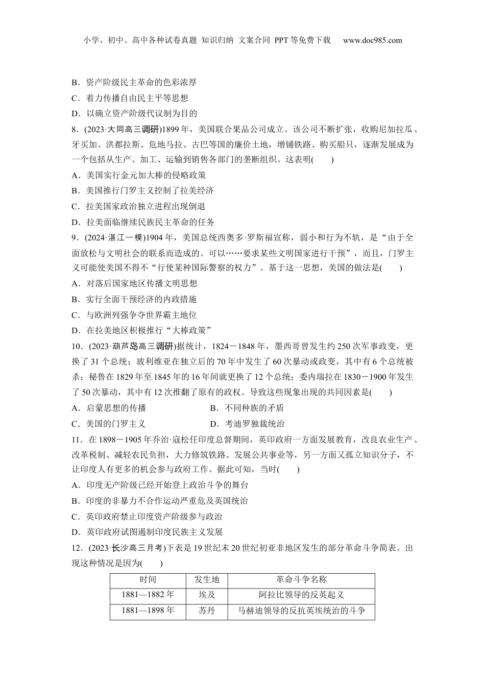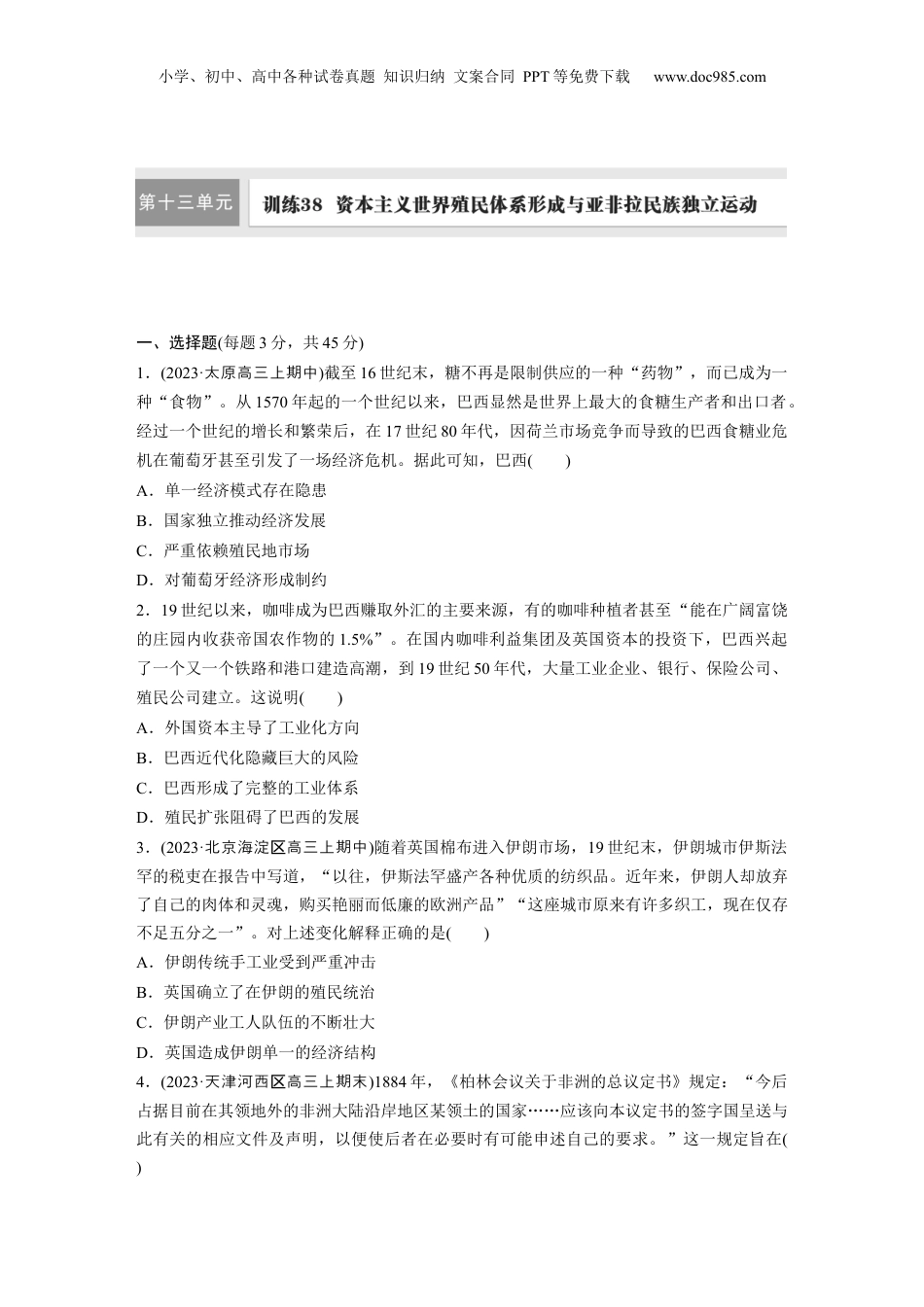 小学、初中、高中各种试卷真题知识归纳文案合同PPT等免费下载www.doc985.com一、选择题(每题3分,共45分)1.(2023·太原高三上期中)截至16世纪末,糖不再是限制供应的一种“药物”,而已成为一种“食物”。从1570年起的一个世纪以来,巴西显然是世界上最大的食糖生产者和出口者。经过一个世纪的增长和繁荣后,在17世纪80年代,因荷兰市场竞争而导致的巴西食糖业危机在葡萄牙甚至引发了一场经济危机。据此可知,巴西()A.单一经济模式存在隐患B.国家独立推动经济发展C.严重依赖殖民地市场D.对葡萄牙经济形成制约2.19世纪以来,咖啡成为巴西赚取外汇的主要来源,有的咖啡种植者甚至“能在广阔富饶的庄园内收获帝国农作物的1.5%”。在国内咖啡利益集团及英国资本的投资下,巴西兴起了一个又一个铁路和港口建造高潮,到19世纪50年代,大量工业企业、银行、保险公司、殖民公司建立。这说明()A.外国资本主导了工业化方向B.巴西近代化隐藏巨大的风险C.巴西形成了完整的工业体系D.殖民扩张阻碍了巴西的发展3.(2023·北京海淀高三上期中区)随着英国棉布进入伊朗市场,19世纪末,伊朗城市伊斯法罕的税吏在报告中写道,“以往,伊斯法罕盛产各种优质的纺织品。近年来,伊朗人却放弃了自己的肉体和灵魂,购买艳丽而低廉的欧洲产品”“这座城市原来有许多织工,现在仅存不足五分之一”。对上述变化解释正确的是()A.伊朗传统手工业受到严重冲击B.英国确立了在伊朗的殖民统治C.伊朗产业工人队伍的不断壮大D.英国造成伊朗单一的经济结构4.(2023·天津河西高三上期末区)1884年,《柏林会议关于非洲的总议定书》规定:“今后占据目前在其领地外的非洲大陆沿岸地区某领土的国家……应该向本议定书的签字国呈送与此有关的相应文件及声明,以便使后者在必要时有可能申述自己的要求。”这一规定旨在()小学、初中、高中各种试卷真题知识归纳文案合同PPT等免费下载www.doc985.comA.镇压亚非拉民族解放运动B.巩固列强瓜分非洲的成果C.维护非洲各国的独立和完整D.协调列强殖民扩张中的矛盾5.(2024·武高三汉联测)东非肯尼亚从百年前开始种植茶叶,1963年独立后逐渐发展成为全球茶叶生产和出口大国。肯尼亚茶叶种植与生产的历程可划分为以下4个阶段:这表明()A.茶叶的引进带有殖民化的色彩B.民族独立后其茶叶生产发展受阻C.多极化促进茶叶生产质的飞跃D.茶叶生产大大提升了其国际地位6.(2023·州高三考郑联)1895年夏,德皇威廉二世在给沙皇的通信中绘制了油画《世界各民族,保护你们最珍贵的财产》,正式提出了“黄祸论”。20世纪初他还告诉沙皇,“日本出售军火给中国”“原钢材料正在法国——你的同盟国——生产”“他们正在争夺整个亚洲,正在苦心孤诣地准备着给全体白种人以打击”。这深刻反映了()A.殖民体系中列强之间矛盾重重B.列强制定了瓜分中国的狂妄计划C.亚洲觉醒缘于严重的民族危机D.种族歧视成为当时世界普遍现象7.(2023·大一模庆)据下表可知,拉美独立战争()著名领导人物经历弗朗西斯科·德·米兰达委内瑞拉独立运动的先驱。他曾亲自参加法国大革命西蒙·玻利瓦尔“拉美解放者”。他目睹了法国大革命,并于1799年和1803年两度赴欧,深受欧洲政治生活特别是法国大革命之后的民主自由情绪的影响何塞·德·圣马丁拉美独立战争的领袖。他常读卢梭、伏尔泰、孟德斯鸠等启蒙思想家的著作,注重从拿破仑身上吸取教训A.受到法国大革命精神的影响小学、初中、高中各种试卷真题知识归纳文案合同PPT等免费下载www.doc985.comB.资产阶级民主革命的色彩浓厚C.着力传播自由民主平等思想D.以确立资产阶级代议制为目的8.(2023·大同高三调研)1899年,美国联合果品公司成立。该公司不断扩张,收购尼加拉瓜、牙买加、洪都拉斯、危地马拉、古巴等国的廉价土地,增铺铁路、购买船只,逐渐发展成为一个包括从生产、加工、运输到销售各部门的垄断组织。这表明()A.美国实行金元加大棒的侵略政策B.美国推行门罗主义控制了拉美经济C.拉美国家政治独立进程出现倒退D.拉美面临继续民族民主革命的任务9.(2024·湛江一模)1904年,美国总统西奥多·罗斯福宣称,弱小和行为不轨,是“由...