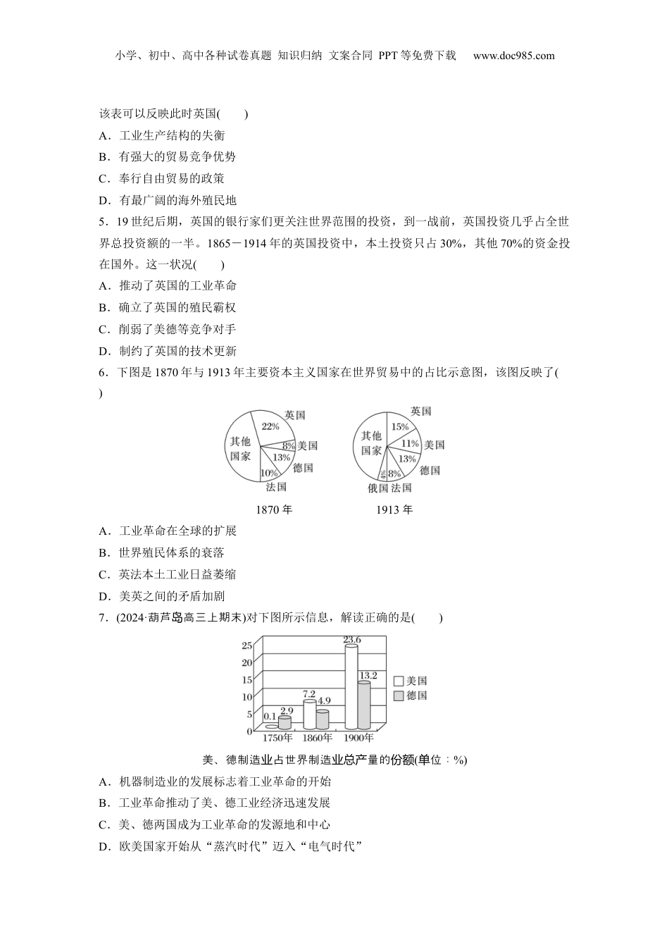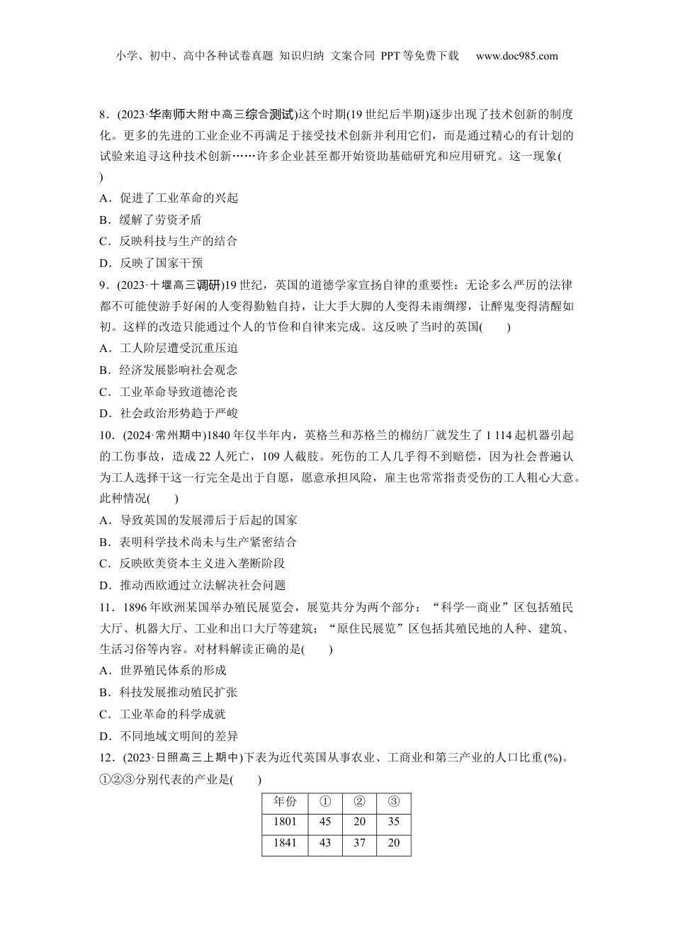 小学、初中、高中各种试卷真题知识归纳文案合同PPT等免费下载www.doc985.com一、选择题(每题3分,共45分)1.(2024·北京海淀高三上期末区)对下图所示现象解释正确的是()16世初和纪1800年洲部分家人口比例欧国纯农业(%)A.欧洲各国工业化发展程度不均衡B.圈地运动不利于英国农业的发展C.荷兰取得“海上马车夫”的地位D.海外殖民活动阻碍西班牙的发展2.(2023·广六校高三考东联)1701年,一位英国人在《东印度贸易观感》一文中写道:“当东印度贸易向我们提供比我们更为便宜的货物,它将迫使我们去发明加工工序和机器,使我们有可能以比较少的劳力和成本进行生产,从而把我们制成品的价格降下来。”以上史料()A.揭示了工业革命发生的根源B.证明印度生产技术先进C.丰富了工业革命研究的视角D.反映亚洲明显贸易优势3.有历史学家在考察19世纪欧洲运输革命与工业革命的关系时指出:“这种运输设施的开展,使先前未曾开发地区卷入世界经济活动内,更因其克服运输量、畜力、季节及移动速度等限制……工业革命成果得以扩大。”该历史学家所说的“运输革命”最有可能是()A.轮船的通航B.汽车的量产C.铁路的兴起D.运河的开通4.1854—1856年英出口易所占比例表国进贸份额原材料食品工业制造品出口贸易7%8%85%进口贸易61%33%6%小学、初中、高中各种试卷真题知识归纳文案合同PPT等免费下载www.doc985.com该表可以反映此时英国()A.工业生产结构的失衡B.有强大的贸易竞争优势C.奉行自由贸易的政策D.有最广阔的海外殖民地5.19世纪后期,英国的银行家们更关注世界范围的投资,到一战前,英国投资几乎占全世界总投资额的一半。1865-1914年的英国投资中,本土投资只占30%,其他70%的资金投在国外。这一状况()A.推动了英国的工业革命B.确立了英国的殖民霸权C.削弱了美德等竞争对手D.制约了英国的技术更新6.下图是1870年与1913年主要资本主义国家在世界贸易中的占比示意图,该图反映了()1870年1913年A.工业革命在全球的扩展B.世界殖民体系的衰落C.英法本土工业日益萎缩D.美英之间的矛盾加剧7.(2024·葫芦高三上期末岛)对下图所示信息,解读正确的是()美、德制造占世界制造量的业业总产份额(位:单%)A.机器制造业的发展标志着工业革命的开始B.工业革命推动了美、德工业经济迅速发展C.美、德两国成为工业革命的发源地和中心D.欧美国家开始从“蒸汽时代”迈入“电气时代”小学、初中、高中各种试卷真题知识归纳文案合同PPT等免费下载www.doc985.com8.(2023·南大附中高三合华师综测试)这个时期(19世纪后半期)逐步出现了技术创新的制度化。更多的先进的工业企业不再满足于接受技术创新并利用它们,而是通过精心的有计划的试验来追寻这种技术创新……许多企业甚至都开始资助基础研究和应用研究。这一现象()A.促进了工业革命的兴起B.缓解了劳资矛盾C.反映科技与生产的结合D.反映了国家干预9.(2023·十堰高三调研)19世纪,英国的道德学家宣扬自律的重要性:无论多么严厉的法律都不可能使游手好闲的人变得勤勉自持,让大手大脚的人变得未雨绸缪,让醉鬼变得清醒如初。这样的改造只能通过个人的节俭和自律来完成。这反映了当时的英国()A.工人阶层遭受沉重压迫B.经济发展影响社会观念C.工业革命导致道德沦丧D.社会政治形势趋于严峻10.(2024·常州期中)1840年仅半年内,英格兰和苏格兰的棉纺厂就发生了1114起机器引起的工伤事故,造成22人死亡,109人截肢。死伤的工人几乎得不到赔偿,因为社会普遍认为工人选择干这一行完全是出于自愿,愿意承担风险,雇主也常常指责受伤的工人粗心大意。此种情况()A.导致英国的发展滞后于后起的国家B.表明科学技术尚未与生产紧密结合C.反映欧美资本主义进入垄断阶段D.推动西欧通过立法解决社会问题11.1896年欧洲某国举办殖民展览会,展览共分为两个部分:“科学—商业”区包括殖民大厅、机器大厅、工业和出口大厅等建筑;“原住民展览”区包括其殖民地的人种、建筑、生活习俗等内容。对材料解读正确的是()A.世界殖民体系的形成B.科技发展推动殖民扩张C.工业革命的科学成就D.不同地域文明间的差异12.(2023·日照高三上期中)下...