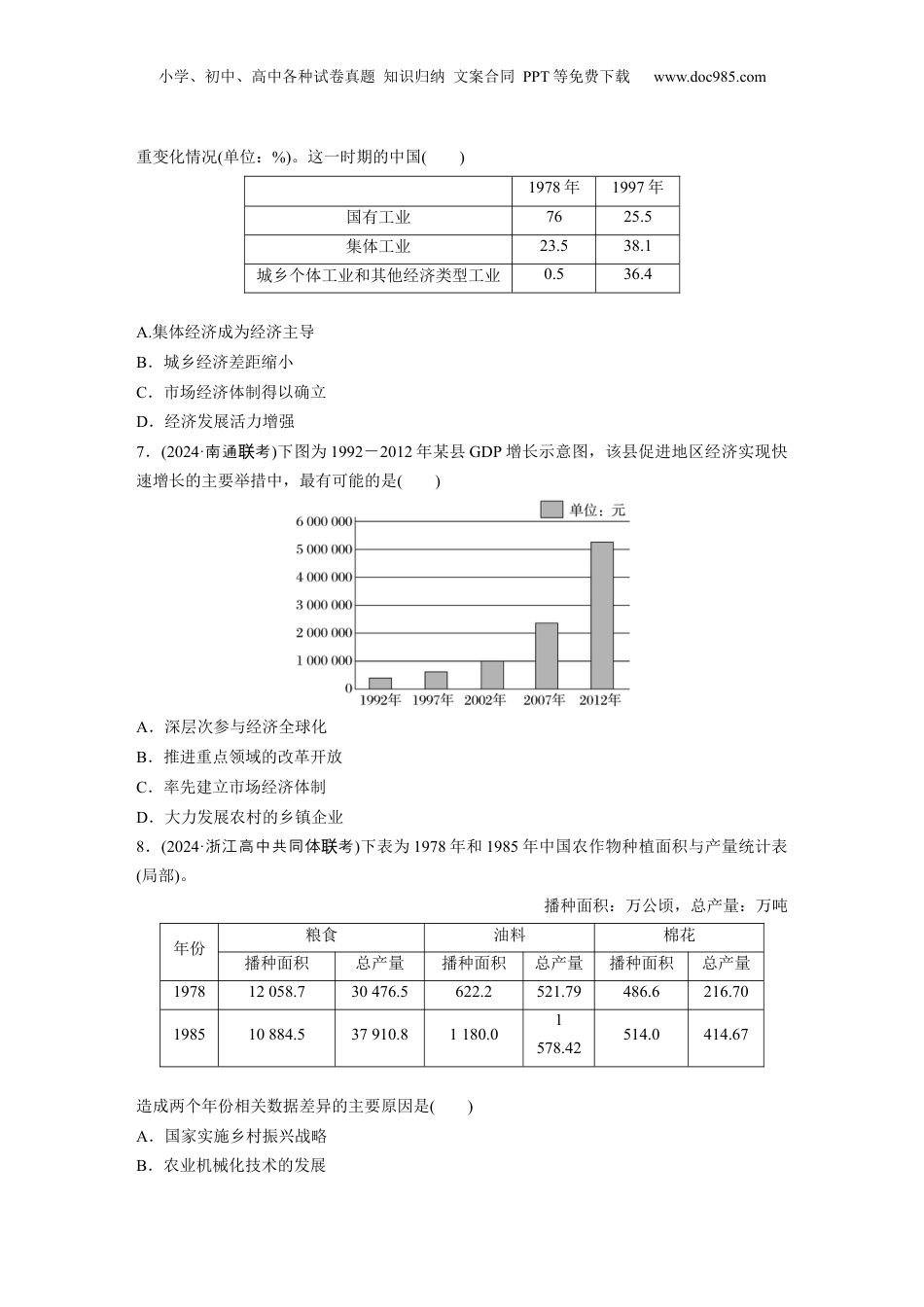 小学、初中、高中各种试卷真题知识归纳文案合同PPT等免费下载www.doc985.com一、选择题(每题3分,共48分)1.(2021·山卷,东9)《人民日报》新年社论的高频词汇反映当年中国社会发展的主题。1979年新年社论《把主要精力集中到生产建设上来》的高频词汇包括()A.中国人民侵略中国美帝国主义B.合作改造农业生产先进C.技术现代化先进科学D.开放稳定企业改革2.(2023·太原二模)1979年8月,邓小平在天津视察时说:“搞四化,搞合资经营,在过去帽子是很大的。什么‘洋奴哲学’‘卖国主义’都可以扣上。现在……关键是发展生产力,增加人民收入,这样社会主义制度的优越性就体现出来了。”邓小平意在强调()A.摆脱传统思想束缚B.坚持社会主义制度C.推广合资经营企业D.否定阶级斗争学说3.从中共十一届三中全会召开到1983年底,共有5040名归侨、侨眷知识分子被吸收入党;一批德才兼备的归侨、侨眷知识分子被选拔到各级领导岗位上;大批归侨、侨眷工程技术、教学、科研人员被授予各种技术职称。这些做法得益于()A.干部制度的变革B.拨乱反正政策的实施C.外交政策的调整D.市场经济体制的形成4.(2023·州高三考温选)从1980年3月到1981年6月,邓小平先后11次召集负责人谈话,反复对一份重要文件的起草和修改提出意见,“坚决顶住否定毛泽东同志和毛泽东思想的错误思潮,为党和国家发展确定了正确方向”。这份文件是()A.《党和国家领导制度的改革》B.《解放思想,实事求是,团结一致向前看》C.《关于建国以来党的若干历史问题的决议》D.《中国共产党第十一届中央委员会第三次全体会议公报》5.(2021·宁卷,辽10)1980年国家农委的一份农村调查报告中写道:“‘尖头户站,滑头户看,老实户气得不愿干’的现象没有了”“‘干到腊月二十九,吃了饺子就动手’的一年到头打疲劳战的现象也没有了”。这反映出()A.生产关系调整初见成效B.农村社会风俗的改变C.农村温饱问题得到解决D.人民公社制度的取消6.(2023·衡高三考阳统)下表所示为1978-1997年我国不同所有制类型工业占工业总产值比小学、初中、高中各种试卷真题知识归纳文案合同PPT等免费下载www.doc985.com重变化情况(单位:%)。这一时期的中国()1978年1997年国有工业7625.5集体工业23.538.1城乡个体工业和其他经济类型工业0.536.4A.集体经济成为经济主导B.城乡经济差距缩小C.市场经济体制得以确立D.经济发展活力增强7.(2024·南通考联)下图为1992-2012年某县GDP增长示意图,该县促进地区经济实现快速增长的主要举措中,最有可能的是()A.深层次参与经济全球化B.推进重点领域的改革开放C.率先建立市场经济体制D.大力发展农村的乡镇企业8.(2024·浙江高中共同体考联)下表为1978年和1985年中国农作物种植面积与产量统计表(局部)。播种面积:万公顷,总产量:万吨年份粮食油料棉花播种面积总产量播种面积总产量播种面积总产量197812058.730476.5622.2521.79486.6216.70198510884.537910.81180.01578.42514.0414.67造成两个年份相关数据差异的主要原因是()A.国家实施乡村振兴战略B.农业机械化技术的发展小学、初中、高中各种试卷真题知识归纳文案合同PPT等免费下载www.doc985.comC.农产品商品化程度提高D.农民经营自主权的扩大9.(2023·河南平汝名校模许拟)1990年,某国外连锁餐厅在深圳开业,屋顶上的招牌吉祥物成为深圳的经典地标。这可用来说明当时()A.中国更深层次地参与全球化进程B.深圳发展成对外开放的窗口C.海峡两岸的经济关系迈上新台阶D.中国的对外开放进一步发展10.(2023·一模抚顺)下表为2021年《中国统计年鉴》中的相关数据,由此可以推论出我国()第一、二、三人占比量表产业从业员数(%)年份第一产业第二产业第三产业构成(合计=100)1952年83.57.49.11965年81.68.4101979年69.817.612.61992年59.721.418.92020年23.628.747.7A.农村人口不断流失、经济衰退B.计划经济时期的重点是发展农业生产C.第三产业经济产值增长最快D.经济体制改革推动了社会结构新变化11.(2023·安徽“皖南八校”考联)下表是中国改革开放后经济领域所发生的巨大变化。发生巨大变化的主要原因是()项目1978年1985年1990...