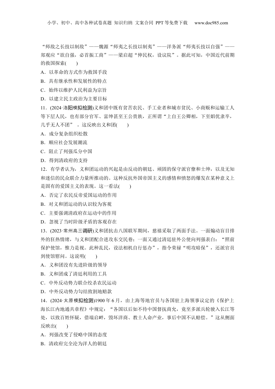 小学、初中、高中各种试卷真题知识归纳文案合同PPT等免费下载www.doc985.com一、选择题(每题3分,共48分)1.(2023·聊城三模)19世纪90年代初,康有为在广州创办万木草堂,至1897年已有求学者数百人。在课堂上,康有为纵论天下大事,每讲一学,必然上下古今,究其沿革得失,并举出欧洲的例子以资证明。康有为此举力图()A.培养近代新式变法人才B.揭开维新变法运动序幕C.开启经世致用治学路径D.增强国人民族民主意识2.(2023·大一模庆)张之洞评价《时务报》时说:“识见正大,议论切要,足以增广见闻,激发志气,凡所采录,皆系有关宏纲,无取琐闻……实为中国创始第一种有益之报。”他还饬令官销《时务报》。这可用来说明张之洞()A.赞赏维新派的救亡之举B.与维新派政见基本一致C.政治观念发生重大变化D.政治立场发生根本改变3.(2023·合肥一模)1896年,梁启超认为文化发达、科学普及,“必从眼前名物指点,不好难也”,“多为歌谣”“多为俗语”。他主张要用民间俗语写文著书,还可以用民间俗语介绍西方科学,学习先进文化。梁启超旨在()A.宣传科学知识B.推动戊戌维新运动C.倡导文学革命D.开启民智救亡图存4.(2023·州扬调研)有学者认为,戊戌变法期间,命督抚廷臣保举人才开始成为光绪帝择用小臣的特殊方法。“明定国是”诏书颁布后,被保举者超过百人,光绪帝几乎全部下令召见。由此可知,光绪帝此举意在()A.废除科举取士制度B.加强君权推行变法C.促使中央权力下移D.消除帝后两派矛盾5.(2022·二模菏泽)日本某学者认为,与“墨守祖法”不切实际一样,“全盘西化”也不可能成为现实,“中体西用”论也缺乏使两者有机结合的内在逻辑;康有为的尝试虽然失败了,但他所提出的问题却寓意深远。作者肯定的康有为“提出的问题”是()A.学习西方政治制度B.传统与近代的结合C.以皇帝的名义变法D.将传统儒学宗教化6.(2023·天津和平一模区)1898年,光绪皇帝下诏:“著自下科为始,乡会试及生童岁科各试,向用《四书》文者,一律改试策论。”这一诏令内容的实施()小学、初中、高中各种试卷真题知识归纳文案合同PPT等免费下载www.doc985.comA.标志着科举制走到了尽头B.有助于人才培养思想的解放C.使近代教育体制得以建立D.使统治者放弃中体西用思想7.下表是日本官员对中国维新变法运动的看法。日本驻北京公使馆武官泷川具和维新派“既缺从政经验,又少显官,仅有张荫桓、徐致靖等数人,从正面进行公然改革,势单力薄,障碍颇多,难以成事”;以康有为等为首的变法派对于外国情况“目不识丁”,在行政改革上无法参照欧美制度且孤独无援,“唯可所恃者乃皇帝之信任”日本内阁首相伊藤博文中国必须改革,但戊戌变法的顺序与方法不可取,中国作为大国要对延续数千年的文物制度进行有效改革,绝非在短期内能卓有成效上述材料()A.辩证分析了戊戌变法失败的原因B.说明日本对维新变法持反对态度C.指出维新派施政方针的内在缺陷D.反映出维新派改革策略的全面性8.(2023·南充二模)戊戌政变后,保守派官员陈夔龙认为慈禧“并无仇视新法之意,徒以利害切身”。英国人赫德相信改革只是被“拖延”,但不会就此断送。日本驻华公使矢野文雄则将政变视为改革的“渐进”与“激进”路线之争。这反映出当时()A.改革的条件不够成熟B.保守势力并未真正反对新法C.变法革新是大势所趋D.维新派的改良措施过于激进9.1899年,思想家宋恕在给友人的信中说:“近日各省志士通人无不奇窘,无论经史、时务,皆不敢谈,并孔教等极冠冕字样,今亦为极忌讳字样。有言《春秋》《孟子》者,大臣目为乱党,官场中有稍言及‘爱民’者,大臣目为汉奸,竟成大闭塞世界。”由此可推知,当时()A.传统观念得以颠覆B.政府坚守闭关锁国政策C.戊戌变法余音仍存D.公车上书请愿遭到镇压10.(2023·金高三模华拟)有同学对中国近代先进中国人救国探索之路做了如下梳理:林则徐小学、初中、高中各种试卷真题知识归纳文案合同PPT等免费下载www.doc985.com“师敌之长技以制敌”——魏源“师夷之长技以制夷”——洋务派“师夷长技以自强”——郑观应“欲自强,必首振工商”——梁启超“伸民权,设议院”。...