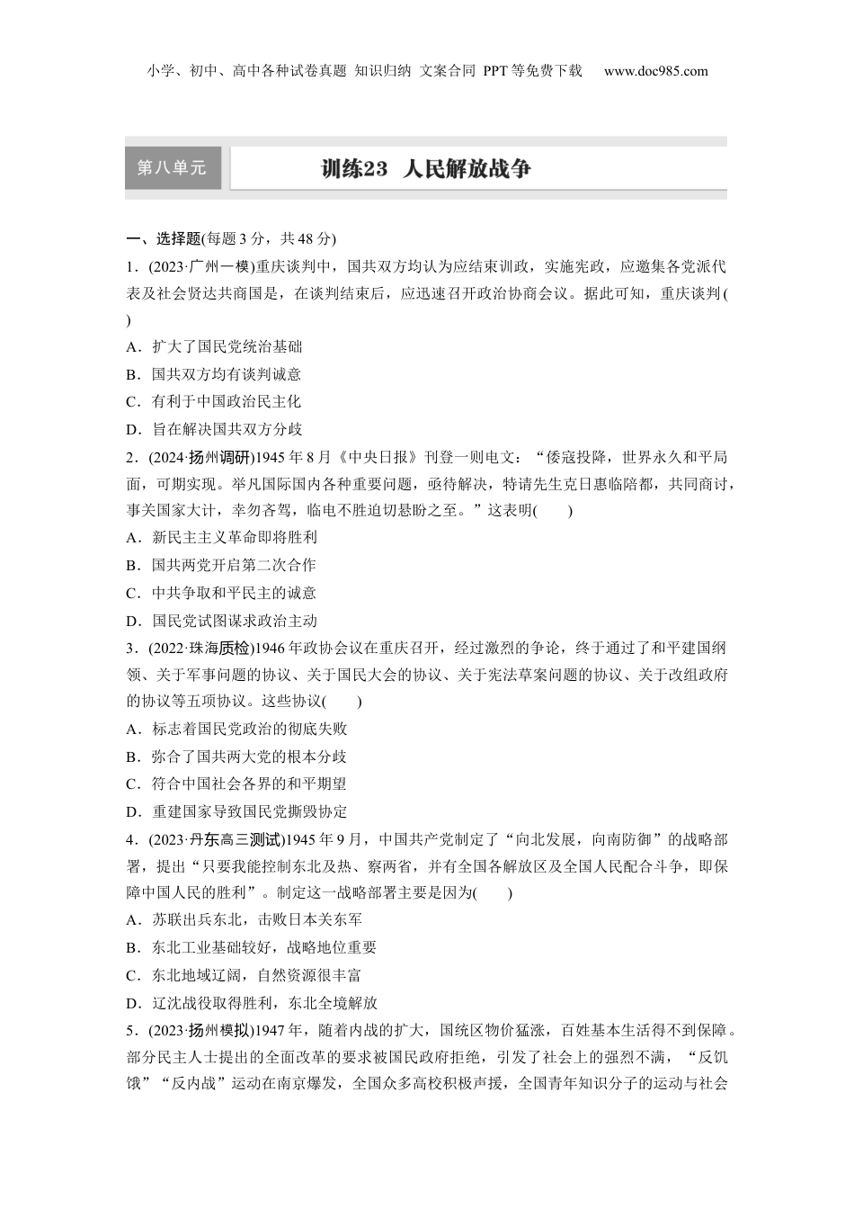 小学、初中、高中各种试卷真题知识归纳文案合同PPT等免费下载www.doc985.com一、选择题(每题3分,共48分)1.(2023·广州一模)重庆谈判中,国共双方均认为应结束训政,实施宪政,应邀集各党派代表及社会贤达共商国是,在谈判结束后,应迅速召开政治协商会议。据此可知,重庆谈判()A.扩大了国民党统治基础B.国共双方均有谈判诚意C.有利于中国政治民主化D.旨在解决国共双方分歧2.(2024·州扬调研)1945年8月《中央日报》刊登一则电文:“倭寇投降,世界永久和平局面,可期实现。举凡国际国内各种重要问题,亟待解决,特请先生克日惠临陪都,共同商讨,事关国家大计,幸勿吝驾,临电不胜迫切悬盼之至。”这表明()A.新民主主义革命即将胜利B.国共两党开启第二次合作C.中共争取和平民主的诚意D.国民党试图谋求政治主动3.(2022·珠海质检)1946年政协会议在重庆召开,经过激烈的争论,终于通过了和平建国纲领、关于军事问题的协议、关于国民大会的协议、关于宪法草案问题的协议、关于改组政府的协议等五项协议。这些协议()A.标志着国民党政治的彻底失败B.弥合了国共两大党的根本分歧C.符合中国社会各界的和平期望D.重建国家导致国民党撕毁协定4.(2023·丹高三东测试)1945年9月,中国共产党制定了“向北发展,向南防御”的战略部署,提出“只要我能控制东北及热、察两省,并有全国各解放区及全国人民配合斗争,即保障中国人民的胜利”。制定这一战略部署主要是因为()A.苏联出兵东北,击败日本关东军B.东北工业基础较好,战略地位重要C.东北地域辽阔,自然资源很丰富D.辽沈战役取得胜利,东北全境解放5.(2023·州模扬拟)1947年,随着内战的扩大,国统区物价猛涨,百姓基本生活得不到保障。部分民主人士提出的全面改革的要求被国民政府拒绝,引发了社会上的强烈不满,“反饥饿”“反内战”运动在南京爆发,全国众多高校积极声援,全国青年知识分子的运动与社会小学、初中、高中各种试卷真题知识归纳文案合同PPT等免费下载www.doc985.com各界群众联系起来。国统区民主运动的频发反映出()A.国民政府的消极抗战和独裁政策日趋反动B.实行民主政治是当时各派力量的共同要求C.社会各界不满社会现实和改变现状的呼声D.人民民主统一战线的政策方针的不断发展6.1947年5月,国民政府紧急颁布《戡乱期间维持社会秩序临时办法》,禁止10人以上的请愿、罢课、罢工和示威游行,并授权各地政府可采取“必要措施”和“紧急处置”办法。这些措施折射出()A.战略进攻对国统区的冲击B.国民党政权统治危机加深C.通货膨胀激化了社会矛盾D.蒋介石对战场指挥的失控7.(2023·春四模长)1947年10月3日,毛泽东致电华野陈毅、粟裕:“现应确定一个月至两个月内,只打小仗不打大仗。各纵应划定地境,每纵几个县……建立政权,实行土改……此种工作看似不甚重要,实则具有伟大战略意义。”这说明当时中国共产党()A.动员群众推进民主革命的进程B.积极推进工作重心向城市转移C.实行减租减息以扩大统一战线D.揭开解放战争战略进攻的序幕8.1946年5月4日,中共中央发出指示:各地党委必须明确认识解决解放区的土地问题,是我党目前最基本的历史任务,是目前一切工作的最基本环节。必须以最大决心和努力,放手发动与领导目前的群众来完成这一历史任务。这一指示()A.为建立农村革命根据地作准备B.巩固了国民革命的社会基础C.表明党的工作重心发生了转移D.利于壮大反抗国民党的力量9.(2024·泰州月考)中国近代史上某次战争期间,中原、华东等地区共出动支前民工543万支援前线作战,那时中国的老百姓说:“最后一粒米,拿去做军粮;最后一床被,盖在担架上;最后一个儿,送到咱队伍上。”这场战争()A.取得抗战以来最大胜利B.在华北地区破坏交通线C.基本解放长江以北地区D.推翻了国民党政府统治10.(2024·城模盐拟)下列文字为解放军战士袁志超在某次战斗期间写的一封家书(部分)。据此推断,当时()小学、初中、高中各种试卷真题知识归纳文案合同PPT等免费下载www.doc985.comA.战略进攻已取得重大突破B.国民党的主力已基本被摧毁C.国民党在大陆统治已覆灭D.党的工作重心已转移到城市11.(...