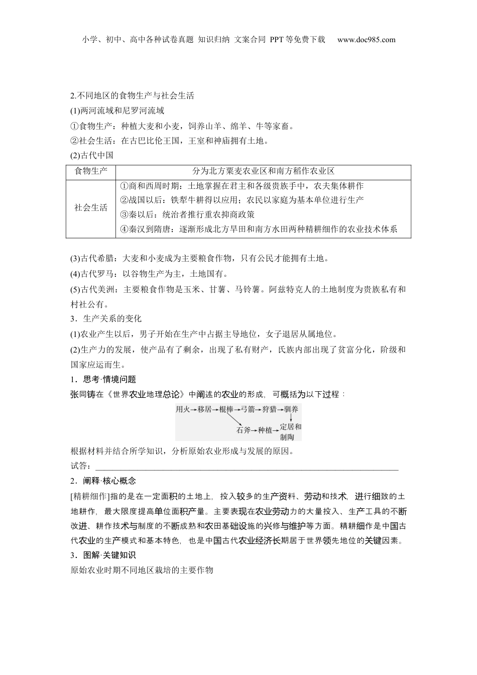 小学、初中、高中各种试卷真题知识归纳文案合同PPT等免费下载www.doc985.com第58讲食物生产与社会生活主题概览食物生产是人类重要的经济活动,也是人类得以延续的物质基础,深刻影响着人类历史发展的进程。1.食物生产的产生与发展:(1)在原始社会,人类由食物的采集者转变为食物的生产者,促进了人类走向文明时代。世界不同区域的原始农业各具特色,孕育出各自不同的古代文明。随着生产力的发展,产品有了剩余,私有制、阶级和国家出现,人类进入文明社会。(2)工业革命后,食物的生产、储备逐步实现了现代化。(3)当今世界保障粮食安全与食品安全仍是各国政府面临的首要任务。2.物种交流与社会生活:(1)新航路开辟前,物种交流多在大陆内部或相邻地区进行。随着新航路的开辟,食物物种的交流在全世界范围内频繁进行。(2)物种交流极大地丰富了人们的食物种类,改善了人类的日常生活,也推动了社会经济和贸易的发展,但也对生态环境产生了一定的消极影响。知识点一从食物采集到食物生产1.人类早期的生产与生活(1)采集和渔猎:人们使用木、骨和石等材料制作的工具从事采集和渔猎,过着迁徙的生活。(2)农耕和畜牧条件人类掌握了某些动植物的生长规律,学会了选择、驯化野生动植物出现大约1万年前意义①农业的出现是人类经济和社会生活的第一次革命,人类开始从食物采集者转变为食物生产者②促进了生活和生产方式的变化③推动了科学技术的发展小学、初中、高中各种试卷真题知识归纳文案合同PPT等免费下载www.doc985.com2.不同地区的食物生产与社会生活(1)两河流域和尼罗河流域①食物生产:种植大麦和小麦,饲养山羊、绵羊、牛等家畜。②社会生活:在古巴比伦王国,王室和神庙拥有土地。(2)古代中国食物生产分为北方粟麦农业区和南方稻作农业区社会生活①商和西周时期:土地掌握在君主和各级贵族手中,农夫集体耕作②战国以后:铁犁牛耕得以应用;农民以家庭为基本单位进行生产③秦以后:统治者推行重农抑商政策④秦汉到隋唐:逐渐形成北方旱田和南方水田两种精耕细作的农业技术体系(3)古代希腊:大麦和小麦成为主要粮食作物,只有公民才能拥有土地。(4)古代罗马:以谷物生产为主,土地国有。(5)古代美洲:主要粮食作物是玉米、甘薯、马铃薯。阿兹特克人的土地制度为贵族私有和村社公有。3.生产关系的变化(1)农业产生以后,男子开始在生产中占据主导地位,女子退居从属地位。(2)生产力的发展,使产品有了剩余,出现了私有财产,氏族内部出现了贫富分化,阶级和国家应运而生。1.思考·情境问题同在《世界地理》中述的的形成,可括以下程:张铸农业总论阐农业概为过根据材料并结合所学知识,分析原始农业形成与发展的原因。试答:________________________________________________________________________2.阐释·核心概念[精耕细作]指的是在一定面的土地上,投入多的生料、和技,行致的土积较产资劳动术进细地耕作,最大限度提高位面量。主要表在力的大量投入、生工具的不单积产现农业劳动产断改、耕作技制度的不成熟和田基施的修等方面。精耕作是中古进术与断农础设兴与维护细国代的生模式和基本特色,也是中古代期居于世界先地位的因素。农业产国农业经济长领关键3.图解·关键知识原始农业时期不同地区栽培的主要作物小学、初中、高中各种试卷真题知识归纳文案合同PPT等免费下载www.doc985.com知识点二新航路开辟后的食物物种交流1.美洲物种的外传物种欧洲中国玉米①16世纪中叶,在南欧地区广泛种植②17世纪,成为仅次于小麦的粮食作物,传遍欧洲①明朝时传入中国②清朝前期,在全国各地多有种植;乾隆、嘉庆年间,大规模推广;到鸦片战争前,遍布全国马铃薯16世纪末,作为食用作物开始在欧洲推广在中国的传播历程与玉米相似甘薯引入欧洲后,传播比较缓慢番茄①18世纪中叶在欧洲开始栽培②18世纪末,经过欧洲培育的番茄新品种传回美洲①明朝万历年间,引入中国,长期被当作观赏和药用植物②清朝光绪年间,开始作为食用蔬菜在菜园种植辣椒①15世纪末传入西班牙②16世纪传到英国等欧洲国家明朝时,传入中国2.其他地区物种在美洲的推广(1)欧亚作物传入美洲①物种:粮食类的小麦、...