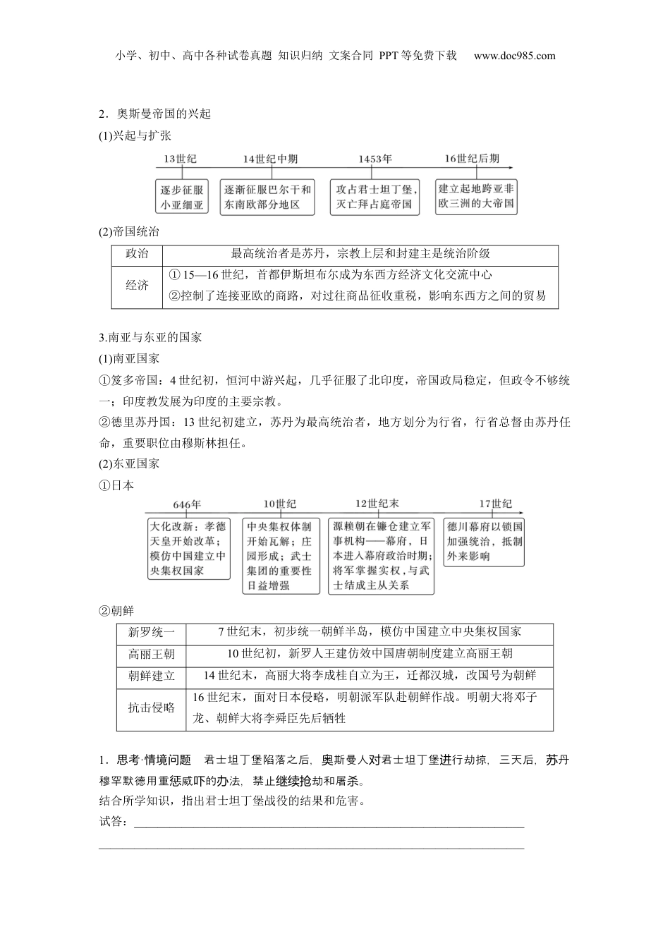 小学、初中、高中各种试卷真题知识归纳文案合同PPT等免费下载www.doc985.com第31讲中古时期的亚洲、非洲和美洲课程标准1.了解中古时期亚洲、非洲、美洲的不同国家、民族、宗教和社会变化,以及社会状况2.认识这一时期世界各区域文明的多元面貌考情分析1.频率题型:该部分是高考低频考点,主要以选择题为主2.情境设计:多利用文字、图片等多种形式创设新学习情境,注重培养学生获取和解读历史信息的能力。如(2023·湖南卷,12)日本土地制度;(2023·海南卷,10)非洲文化传统对法律的影响;(2023·6月浙江选考,11)阿兹特克文明;(2023·1月浙江选考,11)美洲印第安文化成就;(2021·福建卷,12)阿拉伯文化3.核心考向:阿拉伯帝国在东西方文化交流中的桥梁作用,奥斯曼帝国对东西方贸易的影响以及美洲印第安文明成就知识点一中古时期的亚洲1.阿拉伯帝国(1)建立与扩张(2)帝国统治政治最高统治者哈里发掌握政治、军事和宗教大权,下设各部大臣辅助经济①工商业:经济繁荣,手工业和商业得到很大发展②贸易:在东到东亚、西到西欧、南至非洲的广大地区从事着陆上和海上贸易③城市:帝国境内城市繁多,巴格达是当时世界上最大的城市之一(3)帝国文化①成就:吸收了被征服地区的文化,广泛翻译古代波斯、印度、希腊和罗马的文献,融合东西方文化,在诸多领域取得重要成就。②地位:阿拉伯商人和旅行家东西方文化交流的桥梁。③影响:中国的造纸术、印度的数字等先后经阿拉伯人传入欧洲,促进了西欧文化的发展。小学、初中、高中各种试卷真题知识归纳文案合同PPT等免费下载www.doc985.com2.奥斯曼帝国的兴起(1)兴起与扩张(2)帝国统治政治最高统治者是苏丹,宗教上层和封建主是统治阶级经济①15—16世纪,首都伊斯坦布尔成为东西方经济文化交流中心②控制了连接亚欧的商路,对过往商品征收重税,影响东西方之间的贸易3.南亚与东亚的国家(1)南亚国家①笈多帝国:4世纪初,恒河中游兴起,几乎征服了北印度,帝国政局稳定,但政令不够统一;印度教发展为印度的主要宗教。②德里苏丹国:13世纪初建立,苏丹为最高统治者,地方划分为行省,行省总督由苏丹任命,重要职位由穆斯林担任。(2)东亚国家①日本②朝鲜新罗统一7世纪末,初步统一朝鲜半岛,模仿中国建立中央集权国家高丽王朝10世纪初,新罗人王建仿效中国唐朝制度建立高丽王朝朝鲜建立14世纪末,高丽大将李成桂自立为王,迁都汉城,改国号为朝鲜抗击侵略16世纪末,面对日本侵略,明朝派军队赴朝鲜作战。明朝大将邓子龙、朝鲜大将李舜臣先后牺牲1.思考·情境问题君士坦丁堡陷落之后,斯曼人君士坦丁堡行劫掠,三天后,丹奥对进苏穆罕默德用重威的法,禁止劫和屠。惩吓办继续抢杀结合所学知识,指出君士坦丁堡战役的结果和危害。试答:__________________________________________________________________________________________________________________________________________小学、初中、高中各种试卷真题知识归纳文案合同PPT等免费下载www.doc985.com2.阐释·核心概念[印度教]着印度封建社形成,姓制度生新化而出的。印度广泛吸收婆随会种发变现教罗门教、佛和耆那以及民信仰、俗、哲思想等,把姓制度作核心,要求教教教义间风习惯学种为教义徒格遵守姓制度。教严种3.挖掘·教材信息阅读教材“问题探究”栏目,谈谈你对坂本太郎观念的看法,并说明理由。试答:__________________________________________________________________________________________________________________________________________4.思考·情境问题唐朝与新罗保持了长期、频繁的友好往来。结合所学,简述高丽王朝仿效唐朝制度的表现。试答:__________________________________________________________________________________________________________________________________________记一记:__________________________________________________________________________________________________________________________________________________________________________________________________________________________________________...