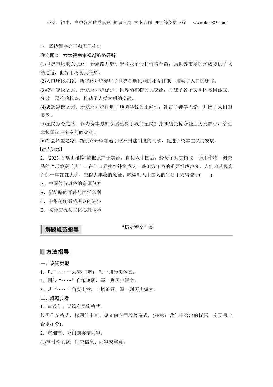 小学、初中、高中各种试卷真题知识归纳文案合同PPT等免费下载www.doc985.com阶段贯通12工场手工业时期微专题114-18世纪的欧洲社会转型对点训练1.资本主义国家的两大法律体系是指大陆法系和英美法系。大陆法系以法典化的成文法为主要形式,分为公法和私法两部分;英美法系以判例法为主要形式,以普通法为基础,注重程序“诉讼中心主义”。这两大法律体系都()A.以习惯法为基础B.突出司法独立和法官作用C.注重成文法作用小学、初中、高中各种试卷真题知识归纳文案合同PPT等免费下载www.doc985.comD.坚持程序公正和无罪推定微专题2六大视角审视新航路开辟(1)世界市场联系之路:新航路开辟引起商业革命和价格革命,为世界市场的形成提供了联结通道,世界市场初具雏形。(2)人口迁移之路:新航路开辟促进了世界各地民众的相互往来,推动了人口的迁移。(3)物种交换之路:新航路开辟促进了世界动植物的大交流,打破了各个文明区域间孤立、分散、隔绝的状态,推动了人类文明的交融。(4)思想震撼之路:新航路开辟证明了地圆学说的正确性,冲击了神学理论,开阔了人们的眼界。(5)殖民掠夺之路:作为资本原始积累重要手段的殖民扩张和殖民掠夺登上历史舞台,给亚非拉国家带来空前的灾难。(6)社会转型之路:新航路开辟加速了欧洲封建制度的瓦解,促进了资本主义的发展。对点训练2.(2023·石嘴山模拟)辣椒原产于美洲,自传入中国后,经历了观赏植物—药用作物—调味品的“形象变迁史”。在门口悬挂红辣椒成为一些地方年俗的重要组成部分,人们将其视为新的一年红红火火、庄稼大丰收的象征。辣椒融入中国人的生活主要得益于()A.中国传统风俗的宽厚包容B.新航路的开辟与西学东渐C.中华传统医药理论的进步D.物种交流与文化心理传承“历史短文”类一、设问类型1.以“……”为题(主题),写一则历史短文。2.围绕“……”自拟论题,写一则历史短文。3.从“……”角度出发,自拟论题,写一则历史短文。二、解题步骤1.审设问、谋篇布局定格式。按照作文格式,标题放中间,短文内容用段落格式。(注意:设问中给出的标题一定要写上,否则扣分)。2.审细节、分门别类定内容。(1)审材料主题:时空信息、内容或寓意。小学、初中、高中各种试卷真题知识归纳文案合同PPT等免费下载www.doc985.com(2)梳理材料关键信息并归类。(3)根据以上信息,大致确定相应知识点。3.定角度、结合所学写短文。三、注意事项:关键信息归类方法(2023·1月浙江考,选25,节选)阅读材料,完成下列要求。材料一①薯主要播路示意马铃传径图(代表虚线1492年哥布探以前,伦险代表实线16世以后纪)——据[日]21世纪研究会编《食物的世界地图》材料二在②16—18世繁的中易中,瓷器、漆器、物、壁、家具和玩具等各纪荣欧贸织纸式各的中特涌入洲,茶成一新的生活方式,瓷器的魅力促使洲人致样国产欧饮为种丝绸与欧力于其生本土化。将产1753年7月24日,瑞典王后收到王送的一件特殊生日物:国赠礼③一座木的中结构国屋。描述道:她“我的子穿得像中王子一在入口恭候,侍的王室侍扮成中长个国样处随从则文官的模国样……里面有一令人心目的印度格装成的大房,四角各有一只大瓷个赏悦风饰间花。瓶……欣所有西之后,王陛下下令演出一配土耳其音的中芭蕾。赏过东国场乐国”——摘编自张国刚《中西文化关系通史》材料三加强印度的治,为对统1853年,英通一新特法案,定国议会过个许状规④印度文小学、初中、高中各种试卷真题知识归纳文案合同PPT等免费下载www.doc985.com官向全体英臣民放,行公考。但印度人入印度文官殿堂的大非常窄应国开实开竞争试进门狭。……印度成主共和后,肯定了已存在的印度行政官等系,根据法有定为权国当时统并宪关规制定了全印文官法。文官分全印文官、邦文官和中央文官。为——整理自程汉大《英国政治制度史》等(2)⑤参考材料一、二、三,自选一个角度,运用18和19世纪的相关史实,围绕文明互鉴主题写一则⑥历史短文,题目自拟。(要求:观点明确,史实准确,条理清晰,表述成文。)解题过程第一步:确定类型由⑤⑥→确定为历史短文类题目。第二步:审设问、谋篇布局定格式第三步:审细节、分门别类定内容第...