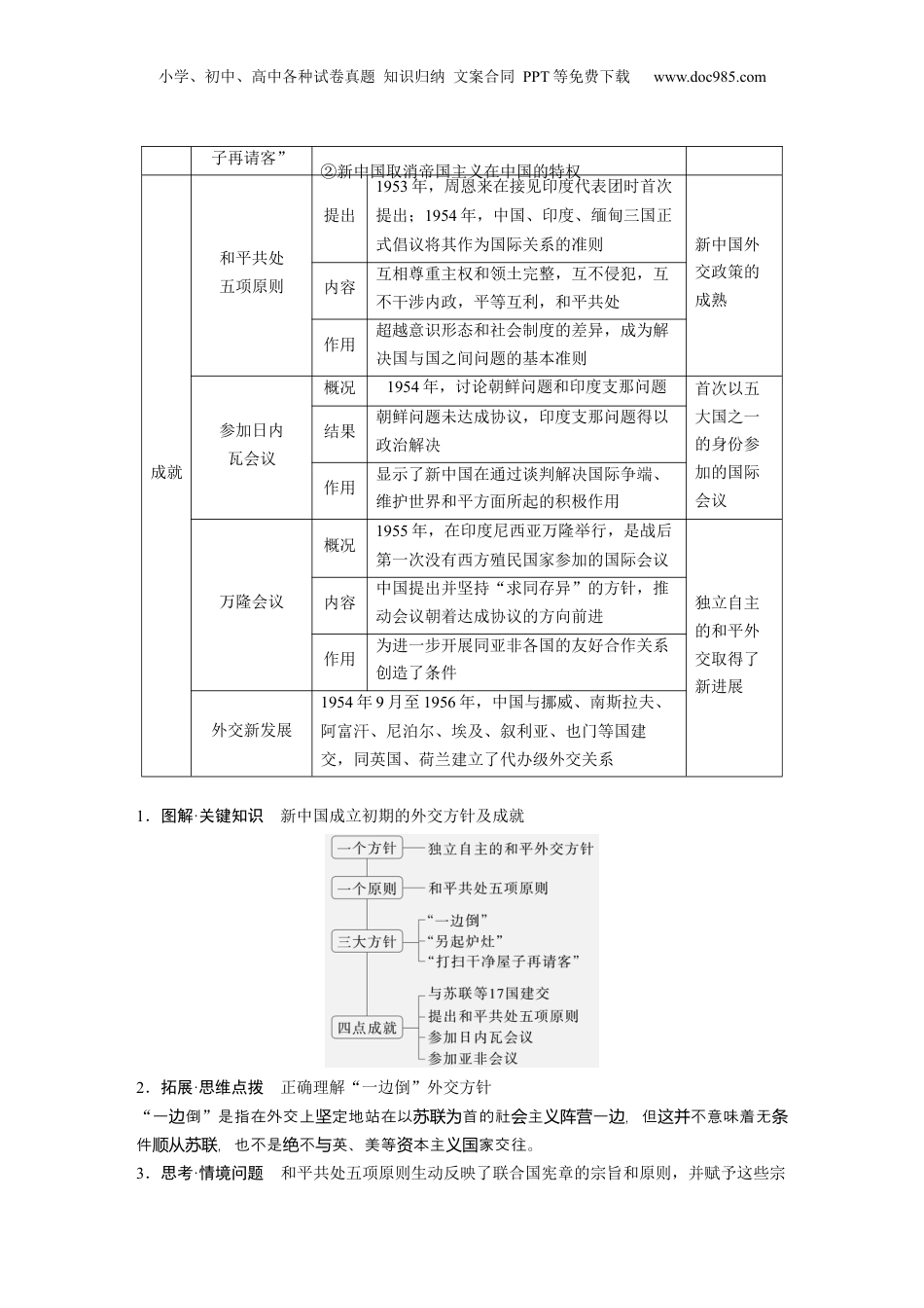 小学、初中、高中各种试卷真题知识归纳文案合同PPT等免费下载www.doc985.com第25讲中华人民共和国成立初期的外交与社会主义基本制度的建立课程标准1.认识新中国为民主政治建设和向社会主义过渡所作出的努力2.理解外交领域所取得的成就在新中国历史上所具有的开创性、奠基性意义考情分析1.频率题型:该部分是高考高频考点,选择题与非选择题都有所涉及,选择题考查较多2.情境设计:多利用文献、图表、漫画等形式,创设新情境,注重培养学生批判性思维,注重考查学生选择、组织、运用材料的能力,突出考查必备知识。如(2023·山东卷,8)国家与工厂的关系;(2022·广东卷,10)新中国的对外关系;(2022·天津卷,14)国际局势影响下中国国际地位的变化;(2021·湖北卷,9)新中国经济建设的成就;(2021·辽宁卷,9)工业化建设激发劳动者生产热情3.核心考向:三大外交方针;和平共处五项原则;万隆会议;社会主义工业化;三大改造;我国社会主义政治制度体系知识点一开创独立自主的和平外交背景旧外交帝国主义与旧中国建立的不平等的外交关系继续存在国内因素国家实力中华人民共和国成立初期,百废待兴,经济基础薄弱,综合国力不强国际格局美苏争霸,两极格局,世界分裂为社会主义阵营和资本主义阵营国际因素封锁孤立以美国为首的西方国家对中国采取政治孤立、经济封锁、军事威胁等手段三条方针“一边倒”先后与苏联以及保加利亚、朝鲜、越南等十个人民民主国家建交新中国迎来第一次建交高潮“另起炉灶”①先谈判再建交,同印度、印度尼西亚、缅甸、巴基斯坦以及瑞典、丹麦、瑞士、芬兰建交“打扫干净屋小学、初中、高中各种试卷真题知识归纳文案合同PPT等免费下载www.doc985.com子再请客”②新中国取消帝国主义在中国的特权成就和平共处五项原则提出1953年,周恩来在接见印度代表团时首次提出;1954年,中国、印度、缅甸三国正式倡议将其作为国际关系的准则新中国外交政策的成熟内容互相尊重主权和领土完整,互不侵犯,互不干涉内政,平等互利,和平共处作用超越意识形态和社会制度的差异,成为解决国与国之间问题的基本准则参加日内瓦会议概况1954年,讨论朝鲜问题和印度支那问题首次以五大国之一的身份参加的国际会议结果朝鲜问题未达成协议,印度支那问题得以政治解决作用显示了新中国在通过谈判解决国际争端、维护世界和平方面所起的积极作用万隆会议概况1955年,在印度尼西亚万隆举行,是战后第一次没有西方殖民国家参加的国际会议独立自主的和平外交取得了新进展内容中国提出并坚持“求同存异”的方针,推动会议朝着达成协议的方向前进作用为进一步开展同亚非各国的友好合作关系创造了条件外交新发展1954年9月至1956年,中国与挪威、南斯拉夫、阿富汗、尼泊尔、埃及、叙利亚、也门等国建交,同英国、荷兰建立了代办级外交关系1.图解·关键知识新中国成立初期的外交方针及成就2.拓展·思维点拨正确理解“一边倒”外交方针“一倒边”是指在外交上定地站在以首的社主一,但不意味着无坚苏联为会义阵营边这并条件,也不是不英、美等本主家交往。顺从苏联绝与资义国3.思考·情境问题和平共处五项原则生动反映了联合国宪章的宗旨和原则,并赋予这些宗小学、初中、高中各种试卷真题知识归纳文案合同PPT等免费下载www.doc985.com旨和原则以可见、可行、可依循的内涵。结合历史与现实,谈谈你对这句话的理解。试答:__________________________________________________________________________________________________________________________________________________________________________________________________________________4.挖掘·教材信息阅读教材“史料阅读”,周恩来在亚非会议的补充发言中说:中国代表团参加会议的目的“是来求同而不是来立异的”。“同”和“异”的含义是什么?试答:__________________________________________________________________________________________________________________________________________________________________________________________________________________知识点二社会主义基本制度建立1.建立社会主义经济...