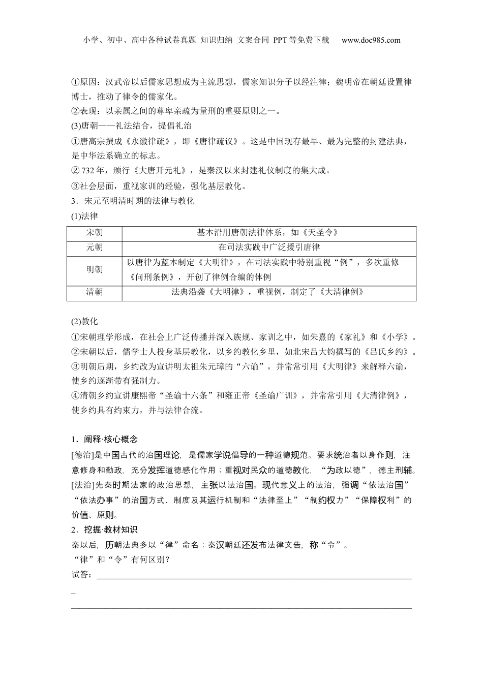 小学、初中、高中各种试卷真题知识归纳文案合同PPT等免费下载www.doc985.com第53讲中西方的法律与教化主题概览法律是统治阶级意志的体现,是国家的统治工具,着眼于防范与惩处。教化是社会治理的重要工具,着眼于教育和引导。两者相辅相成。1.中国的法律与教化:(1)中国古代成文法出现于春秋时期,确立于秦朝,成熟于隋唐,形成了以礼法结合为特征的中华法系。(2)中华人民共和国成立后,逐步形成以宪法为核心的中国特色社会主义法律体系,重视法治建设与精神文明建设,形成了社会主义核心价值观。2.西方的法律与教化:(1)近代西方法律制度起源于罗马法,中古时期在罗马法基础上,形成日耳曼法和英国普通法。(2)近代以来,随着资本主义制度的日益完善,形成以英美为中心的“英美法系”和以法国为中心的“大陆法系”。(3)基督教宗教伦理与教化在欧美社会具有重要地位,深刻影响了人们的思想意识和日常行为。知识点一中国古代的法治与教化1.先秦时期的德治与法治(1)德治①背景:夏商时期,君王及奴隶主贵族可以随意残害奴隶。②起源:西周建立了以宗法为核心的礼制,提出“敬天保民”的思想。③发展:东周时期,礼崩乐坏,诸侯国君们寻找治国新思想。(2)法治①早期国家可能已有法律。夏朝有《禹刑》,商朝有《汤刑》,周朝有《九刑》。②郑国的子产“铸刑书”,制定了中国历史上最早的成文法。德治与法治之争开启。(3)德治与法治之争①儒家认为人性善,主张德治。孔子提出,统治者要“为政以德”“节用而爱人”。孟子建议统治者“施仁政于民,省刑罚,薄税敛”。②法家认为人性恶,主张法治。商鞅在秦国颁行一系列法令,保护新兴地主阶级的权益;韩非主张法、术、势相结合,“以法为教”“以吏为师”。③儒家仁政与德治的思想不合时宜,在当时备受冷落。法家思想适应了当时建立统一的专制集权国家的需要,受到重用。2.秦汉至隋唐时期的法律与教化(1)秦汉的法治①秦以法家思想治国,推动了律的编纂。②汉朝沿袭秦律,制成《九章律》。秦汉朝廷还发布“令”,律和令都具有法律效力。(2)魏晋时期——律令儒家化(引礼入律)小学、初中、高中各种试卷真题知识归纳文案合同PPT等免费下载www.doc985.com①原因:汉武帝以后儒家思想成为主流思想,儒家知识分子以经注律;魏明帝在朝廷设置律博士,推动了律令的儒家化。②表现:以亲属之间的尊卑亲疏为量刑的重要原则之一。(3)唐朝——礼法结合,提倡礼治①唐高宗撰成《永徽律疏》,即《唐律疏议》。这是中国现存最早、最为完整的封建法典,是中华法系确立的标志。②732年,颁行《大唐开元礼》,是秦汉以来封建礼仪制度的集大成。③社会层面,重视家训的经验,强化基层教化。3.宋元至明清时期的法律与教化(1)法律宋朝基本沿用唐朝法律体系,如《天圣令》元朝在司法实践中广泛援引唐律明朝以唐律为蓝本制定《大明律》,在司法实践中特别重视“例”,多次重修《问刑条例》,开创了律例合编的体例清朝法典沿袭《大明律》,重视例,制定了《大清律例》(2)教化①宋朝理学形成,在社会上广泛传播并深入族规、家训之中,如朱熹的《家礼》和《小学》。②宋朝以后,儒学士人投身基层教化,以乡约教化乡里,如北宋吕大钧撰写的《吕氏乡约》。③明朝后期,乡约改为宣讲明太祖朱元璋的“六谕”,并常常引用《大明律》来解释六谕,使乡约逐渐带有强制力。④清朝乡约宣讲康熙帝“圣谕十六条”和雍正帝《圣谕广训》,并常常引用《大清律例》,使乡约具有约束力,并与法律合流。1.阐释·核心概念[德治]是中古代的治理,是儒家倡的一道德范。要求治者以身作,注国国论学说导种规统则意修身和勤政,充分道德感化作用;重民的道德化,发挥视对众教“政以德为”,德主刑辅。[法治]先秦期法家的政治思想,主以法治。代意上的法治,强时张国现义调“依法治国”“依法事办”的治方式、制度及其行机制和国运“法律至上”“制力约权”“保障利权”的价、原。值则2.挖掘·教材知识秦以后,朝法典多以历“律”命名;秦朝廷布法律文告,汉还发称“令”。“律”和“令”有何区别?试答:_____________________________________________________________________________...