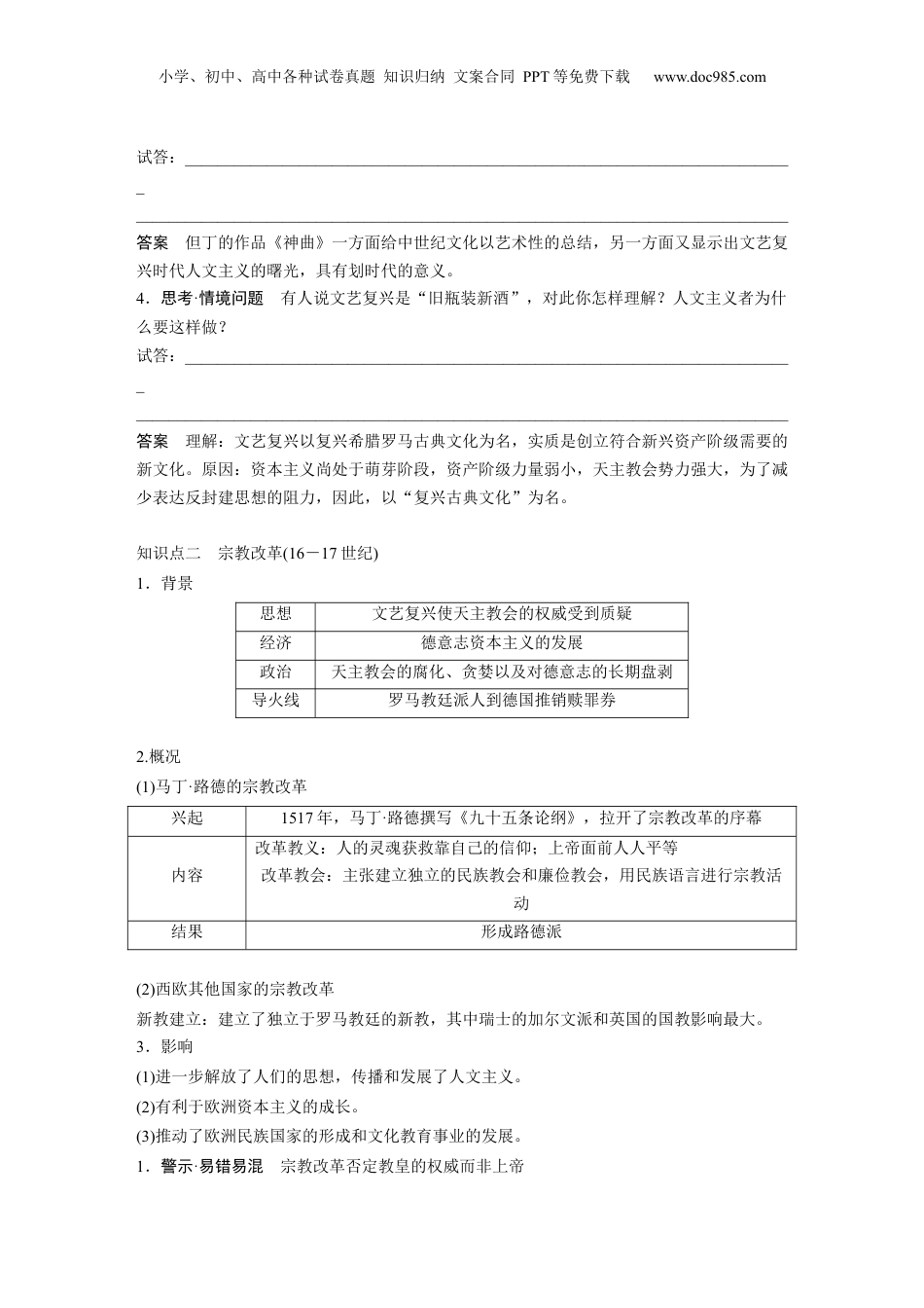 小学、初中、高中各种试卷真题知识归纳文案合同PPT等免费下载www.doc985.com第33讲文艺复兴与宗教改革课程标准了解文艺复兴、宗教改革与资产阶级革命的历史渊源。考情分析1.频率题型:该部分是高考中频考点,侧重于与这一时期的政治、经济、文化相联系,突出阶段特征2.情境设计:多利用文献资料,例如以当时思想家的思想为载体,考查人文主义的含义、思想主张的背景及其影响,一般创设学术情境,培养学生历史解释、史料实证的核心素养,如(2023·湖南卷,13)文艺复兴;(2023·1月浙江选考,13)文艺复兴;(2022·全国乙卷,33)人文主义的传播;(2022·湖北卷,12)人文主义的传播;(2022·江苏卷,13)人文主义的内涵;(2021·山东卷,11)文艺复兴和宗教改革;(2021·辽宁卷,12)文艺复兴的影响3.核心考向:人文主义的内涵;文艺复兴、宗教改革的背景、概况、影响整体感知知识点一文艺复兴(14-17世纪)1.背景与性质根本原因西欧中世纪晚期资本主义生产关系的萌芽文化基础西欧文化自身的传承与发展,意大利拥有丰厚的古希腊罗马文化积淀,从东方汲取了大量文化养料人才优势聚集了一批具有新思想的学者文人性质14世纪到17世纪初发生在欧洲的宣扬新思想的新文化运动2.内容小学、初中、高中各种试卷真题知识归纳文案合同PPT等免费下载www.doc985.com3.成就阶段时间代表人物作品特色兴起14世纪但丁、彼特拉克、薄伽丘(“文学三杰”)讽刺教会的封建腐朽,宣扬人性的自由发展15世纪达·芬奇、米开朗琪罗和拉斐尔(“美术三杰”)突破了中世纪呆板僵硬的风格,描绘现世生活,展现人物的内心世界扩展15世纪后期莎士比亚体现了人文主义的政治理想和道德观念4.影响积极经济促进资本主义经济的发展,推动新航路的开辟政治天主教会权威受到质疑,推动宗教改革的开展思想是一次深刻的思想解放运动,冲破封建神学对人们的束缚,为启蒙运动打下思想基础文化推动文学艺术、社会科学的繁荣和近代科学的兴起消极个人对人的自然本性和原始欲望过分推崇,造成个人私欲膨胀和社会混乱阶层局限于资产阶级和少数知识分子群体中,没有广泛发动群众1.阐释·核心概念[人文主义]是洲文期文化的主要思潮,有方面含:一方面是指以欧艺复兴时资产阶级它两义人自然象的世俗文化的究;另一方面是指的人性和人道主。其强以与为对研资产阶级论义调人主体和中心,尊重人的本、利益、需要及多造和展的可能性。上是市民为质种创发实质阶反封建、反中世神和禁欲主的新文化。级纪学义运动2.警示·易错易混抨击教会≠反对宗教文期的代表人物斗的矛指向天主,但不反宗信仰。他也是信仰艺复兴时将争头教会并对教们宗的,只是反宣的禁欲苦行,抨的腐。教对教会扬击教会败3.挖掘·教材信息阅读纲要下第8课第一目“学思之窗”栏目,分析马克思、恩格斯这样说的理由是什么?小学、初中、高中各种试卷真题知识归纳文案合同PPT等免费下载www.doc985.com试答:___________________________________________________________________________________________________________________________________________________________答案但丁的作品《神曲》一方面给中世纪文化以艺术性的总结,另一方面又显示出文艺复兴时代人文主义的曙光,具有划时代的意义。4.思考·情境问题有人说文艺复兴是“旧瓶装新酒”,对此你怎样理解?人文主义者为什么要这样做?试答:___________________________________________________________________________________________________________________________________________________________答案理解:文艺复兴以复兴希腊罗马古典文化为名,实质是创立符合新兴资产阶级需要的新文化。原因:资本主义尚处于萌芽阶段,资产阶级力量弱小,天主教会势力强大,为了减少表达反封建思想的阻力,因此,以“复兴古典文化”为名。知识点二宗教改革(16-17世纪)1.背景思想文艺复兴使天主教会的权威受到质疑经济德意志资本主义的发展政治天主教会的腐化、贪婪以及对德意志的长期盘剥导火线罗马教廷派人到德国推销赎罪券2.概况(1)马丁·路德的宗教改革兴起1517年,马丁·路德撰写《九十五条论纲》,拉开了宗教改革...