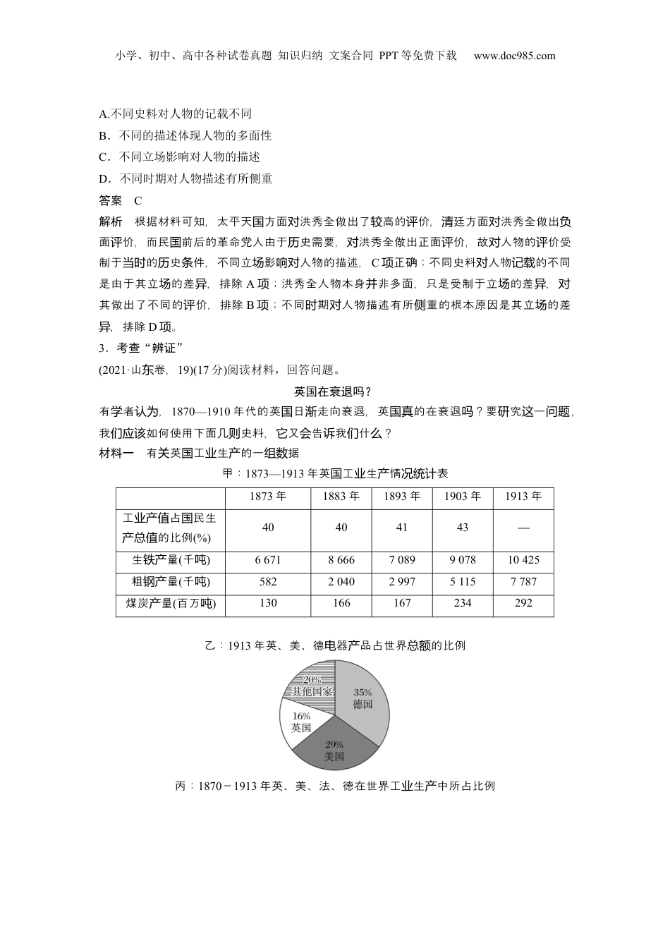 小学、初中、高中各种试卷真题知识归纳文案合同PPT等免费下载www.doc985.com(三)核心素养之必要途径——史料实证史料实证是指对获取的史料进行辨析,并运用可信的史料努力重现历史真实的态度与方法。史料指能记录或反映过去发生、存在过的事情的文字记载和一切物品,大体分文献、实物、口述和图像四类。实证是研究历史问题的基本方法之一,通过对史料进行收集、整理和辨析,进而形成历史结论。1.内涵阐释水平质量描述表现要点关键学习行为水平1能够区分史料的不同类型;在解答某一历史问题时,能够尝试从多种渠道获取与该问题相关的史料;能够从所获得的史料中提取有关的信息(1)知道史料类型;(2)多渠道获取史料;(3)提取信息例证:筛选整理,举证说明水平2能够认识不同类型的史料所具有的不同价值;明确史料在历史叙述中的基础作用;在对史事与现实问题进行论述的过程中,能够尝试运用史料作为证据论证自己的观点(1)判断史料价值;(2)具有证据意识水平3在探究特定历史问题时,能够对史料进行整理和辨析;能够利用不同类型史料,对所探究的问题进行互证,形成对该问题更全面的了解(1)整理和辨析史料;(2)用史料互证互证:相互验证,合理解释水平4能够比较、分析不同来源的史料;能够在了解史料作者意图的基础上利用史料;在对历史和现实问题进行独立探究的过程中,能够恰当地运用史料对所探究问题进行论述(1)比较分析史料;(2)辨别史料立场;(3)运用史料进行论述辨证:辨别考证,评述历史2.命题视角小学、初中、高中各种试卷真题知识归纳文案合同PPT等免费下载www.doc985.com1.考查“例证”(2023·广卷,东6)明代小说《二刻拍案惊奇》载,浙江人蒋生行商至汉阳,看中了缙绅马少卿的女儿。蒋生本来以为“经商之人,不习儒业,只恐有玷门风”,怕婚事不成。马少卿却认为“江浙名邦,原非异地,经商亦是善业,不是贱流”,遂许婚。这虽是文学描述,但从中可见明中后期()A.纲常礼教束缚被打破B.自然经济结构逐步解体C.市民阶层的分化加剧D.重农抑商观念受到冲击答案D解析材料中生以自己商人身而自卑,少卿商是善,非流,表明明朝蒋份马则认为经业贱轻商念仍然存在但已受到冲,故观击选D。材料中官商通婚之事,常和市民项与纲礼教阶层分化有直接系,故排除没关A、C;自然解体出于片之后,故排除项经济结构现鸦战争B项。2.考查“复证”(2023·湖北卷,7)下表是有关太平天国运动领导人洪秀全的描述,对此解读最准确的是()来源内容太平天国方面大,面微而白,鼻高耳而小,其音亮而沉重,笑屋躯长圆圆声响时为之震,有大之膂力敏捷之知极与极觉清廷方面身材魁,赤面高,有,粗通文墨,素无,日事博;体肥硕颧须赖赌质,了无人钝异处民国前后革命党人面丰,,手垂膝;身干大,富雄姿,豪博,治《春长满红须过长迈学秋》《》汉书小学、初中、高中各种试卷真题知识归纳文案合同PPT等免费下载www.doc985.comA.不同史料对人物的记载不同B.不同的描述体现人物的多面性C.不同立场影响对人物的描述D.不同时期对人物描述有所侧重答案C解析根据材料可知,太平天方面洪秀全做出了高的价,廷方面洪秀全做出国对较评清对负面价,而民前后的革命党人由于史需要,洪秀全做出正面价,故人物的价受评国历对评对评制于的史件,不同立影人物的描述,当时历条场响对C正确;不同史料人物的不同项对记载是由于其立的差,排除场异A;洪秀全人物本身非多面,只是受制于立的差,项并场异对其做出了不同的价,排除评B;不同期人物描述有所重的根本原因是其立的差项时对侧场,排除异D。项3.考查“辨证”(2021·山卷,东19)(17分)阅读材料,回答问题。英国在衰退吗?有者,学认为1870—1910年代的英日走向衰退,英的在衰退?要究一国渐国真吗研这问题,我如何使用下面几史料,又告我什?们应该则它会诉们么材料一有英工生的一据关国业产组数甲:1873—1913年英工生情表国业产况统计1873年1883年1893年1903年1913年工占民生业产值国的比例产总值(%)40404143—生量铁产(千吨)667186667089907810425粗量钢产(千吨)5822040299751157787煤炭量产(百万吨)130166167234292乙:1913年英、美、德器品占世界的比例电产...