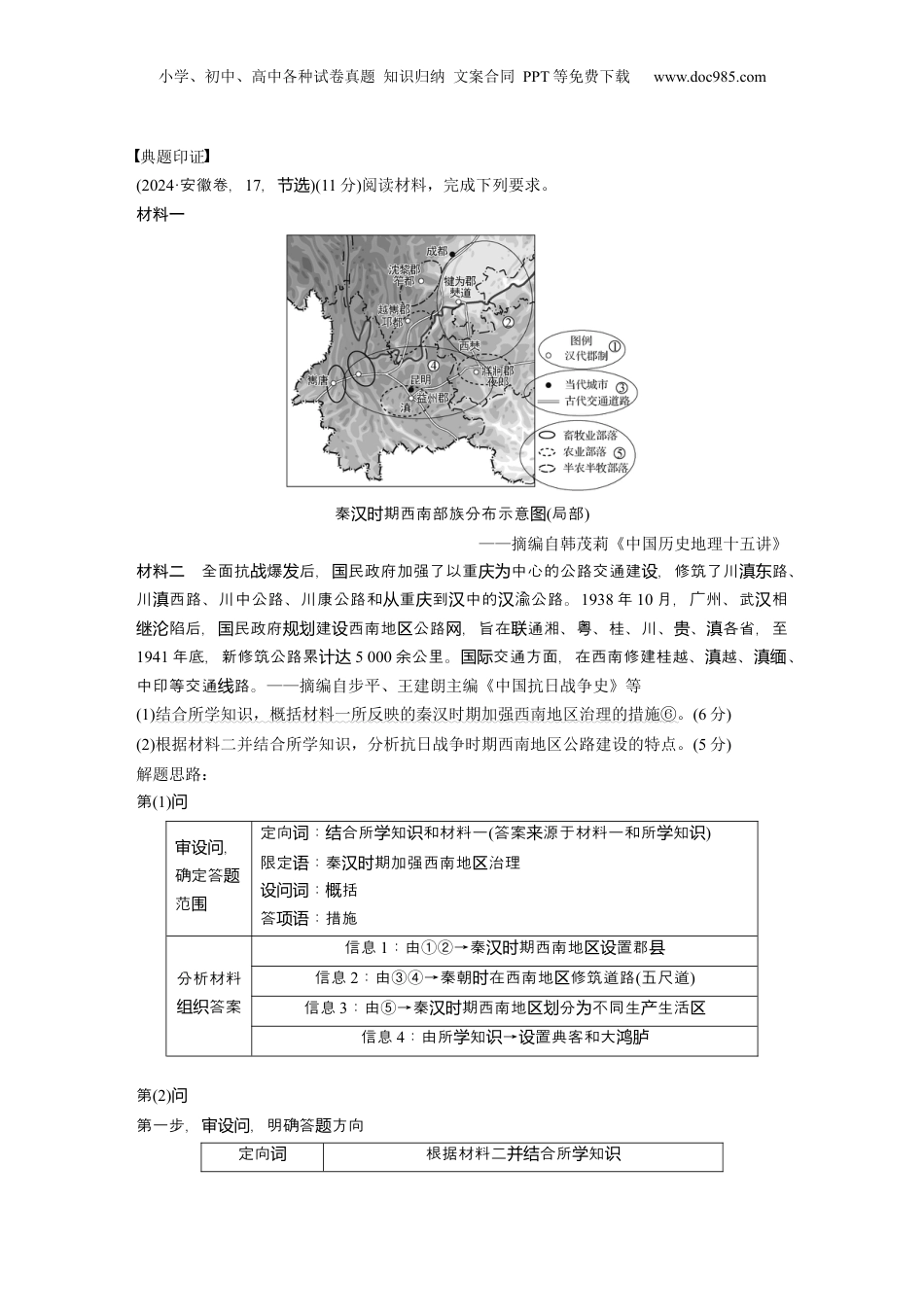小学、初中、高中各种试卷真题知识归纳文案合同PPT等免费下载www.doc985.com(三)突破“答项语”,组织答题语言题型1内容、特点类思维模型注意事项:特点类需要考虑的要素特点=背景+时间+空间+过程(方式+主导+动力+新发展、新变化)+内容+程度+目的+实质+结果+影响+……要素回答角度背景某事件发生前是否产生了新的经济因素、阶级力量,是否采用特殊的方式做准备,是否受外部因素的影响等时间发生时间的早晚;经历时间的长短;事件发展的阶段性、持续性特点目的为某个阶级或某部分人服务;具有多重目的;根本目的;从现实出发等过程历史事物的新发展和新变化,往往能够明显地体现出其自身出现的新特点,抓住其新变化的特征,也是认识特点的有效方法措施产生依据、体现某种思想、最突出的特点、包括的方面、侧重的方面、实行的办法等程度发展的情况、是不是彻底、局限性等范围包括地域、领域;分布是否均衡等行为主体政府、民间、个人等属性具有什么样的属性,本质是什么等影响影响的广度、深度,积极影响和消极影响等小学、初中、高中各种试卷真题知识归纳文案合同PPT等免费下载www.doc985.com典题印证(2024·安徽卷,17,节选)(11分)阅读材料,完成下列要求。材料一秦期西南部族分布示意汉时图(局部)——摘编自韩茂莉《中国历史地理十五讲》材料二全面抗爆后,民政府加强了以重中心的公路交通建,修筑了川路战发国庆为设滇东、川西路、川中公路、川康公路和重到中的渝公路。滇从庆汉汉1938年10月,广州、武相汉陷后,民政府建西南地公路,旨在通湘、粤、桂、川、、各省,至继沦国规划设区网联贵滇1941年底,新修筑公路累计达5000余公里。交通方面,在西南修建桂越、越、国际滇滇缅、中印等交通路。线——摘编自步平、王建朗主编《中国抗日战争史》等(1)结合所学知识,概括材料一所反映的秦汉时期加强西南地区治理的措施⑥。(6分)(2)根据材料二并结合所学知识,分析抗日战争时期西南地区公路建设的特点。(5分)解题思路:第(1)问,审设问确定答题范围定向:合所知和材料一词结学识(答案源于材料一和所知来学识)限定:秦期加强西南地治理语汉时区:括设问词概答:措施项语分析材料答案组织信息1:由①②→秦期西南地置郡汉时区设县信息2:由③④→秦朝在西南地修筑道路时区(五尺道)信息3:由⑤→秦期西南地分不同生生活汉时区划为产区信息4:由所知学识→置典客和大设鸿胪第(2)问第一步,,明确答方向审设问题定向词根据材料二合所知并结学识小学、初中、高中各种试卷真题知识归纳文案合同PPT等免费下载www.doc985.com限定语抗日期西南地公路建战争时区设设问词分析答项语特点第二步,分析材料,答案组织要素材料容内特点背景全面抗爆后战发抗日服为战争务行主体为民政府加强国……公路交通建设政府推动范围以重中心的公路交通建;建西南地公路庆为设设区;在西南修建桂越、越、、中印等交通网滇滇缅线路以重中心;庆为国修内国际并程度通湘、粤、桂、川、、各省;累联贵滇计达5000余公里射范广、里辐围较程较长答案(1)措施:设置郡县;修筑道路(五尺道);划分不同生产生活区;设置典客和大鸿胪。(任意三点6分)(2)特点:以重庆为中心;政府推动;服务于抗战需要;国内国际并修;辐射范围较广、里程较长。(任意三点5分)题型2比较类思维模型一、设问类型二、解题步骤第一步:明确设问类型,即设问要求回答相同点还是不同点,或者是异同点。第二步:明确比较对象,即明确对什么进行比较。第三步:找准比较角度。(1)依据题目要求的比较角度,进行比较;(2)没有明确比较角度的,根据材料的叙述角度、设问指向等确定答题角度,具体类型如下:①历史事件类:背景、过程、结果三部分;②历史现象类:背景、性质、方式、特点、积极小学、初中、高中各种试卷真题知识归纳文案合同PPT等免费下载www.doc985.com作用、历史局限性等;③历史人物类:所处时代、所属阶级或者阶层、主要活动、历史地位、影响等;④政治、经济制度类:时代背景、目的、性质、内容、结果、影响及地位等。第四步:组织答案。典题印证(2024·湖南卷,18,节选)(10分)阅读材料,完成下列要求。材料1949—1950年...