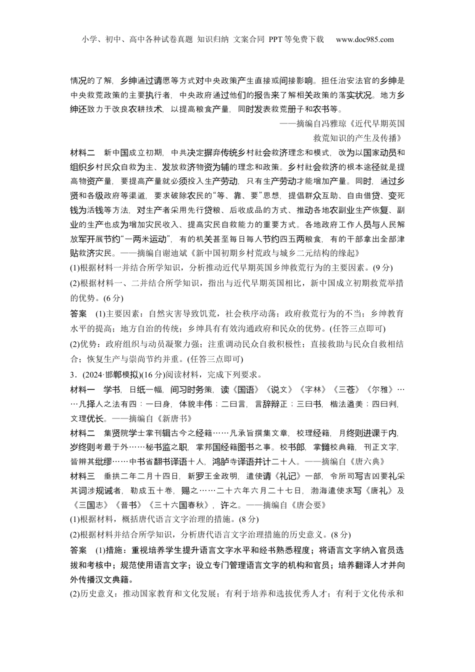 小学、初中、高中各种试卷真题知识归纳文案合同PPT等免费下载www.doc985.com训练11非选择题之突破“答项语”,组织答题语言[分值:40分]1.(2024·北京卷,20)(9分)端午故事材料一端午由已久,其起源有念屈原、越民族祭、月日避毒除害等法节来纪吴图腾恶恶说。古代各地的端午俗包括,习“以五彩系臂丝”祈求“不病瘟”“采艾以人为(人形),上,悬门户以攘毒气”,以竹筒米,投水以祭屈原,贮“百草蹋”“斗百草”“舟渡龙竞”,出嫁女“宁归(回娘家)”等。材料二20世以中端午大事表纪来国节1912年,南京政府布新法,定新二存,俗要存,吉凶神宿一律除临时颁历规旧历并旧习择录删1922年,《杭州年》表《整青发洁节(端午)生大宣言》卫运动“利用里端午除毒的社旧习惯节心理会”,行生大举卫运动1928年,民政府止,禁机、校、体循俗放假国废阴历严关学团旧历习1940年,抗文念屈原,端午定敌协为纪将节为“人诗节”“向推广行国内实”1941年《屈原》新上演,念剧纪国殇民年,各地志多有于端午俗的,如山西国间县关当时习记载“艾,食角黍插(粽子),雄酒饮黄……游郊”;广东“各家裹角黍,各舟乡竞龙”1984年,家体委在广首国东举办届“屈原杯”舟;后日本、新加坡、澳大利等也始龙赛随亚国开舟举办龙赛2006年,端午成首批家非物文化节为国级质遗产2007年,端午成家法定假日节为国节2009年,端午俗申成功,中日首次身世界非名习遗国传统节跻遗录阅读材料,结合所学,阐释端午节蕴含的中华优秀传统文化的内涵及特点。答案内涵:爱国情怀与献身国家的牺牲精神;倡导健康生活与人与自然的和谐共生;重视家庭和睦以及社会团结。特点:源远流长;多元融合,因时而变;民族认同。2.(2024·桂林高三段阶练习)(15分)阅读材料,完成下列要求。材料一17世以,英平均每四五年就生一次灾荒,致粮价上,活纪来国会发导涨骚乱动频。此,都王朝和斯特王朝早期的中央政府通王室公告、敕令和法令等限制发为铎图亚过议会乃至禁止粮食出口免除粮食口,同在全范搜余粮以供市。而部分并进关税时国围内查应场乡都政府用绅认为铎试图“粗糙的地方行政管理机器”取代中商,适得其反。基于地方来间会对小学、初中、高中各种试卷真题知识归纳文案合同PPT等免费下载www.doc985.com情的了解,通愿等方式中央政策生直接或接影。担任治安法官的是况乡绅过请对产间响乡绅中央救荒政策的主要行者,中央政府通他的告了解相政策的落。地方执过们报来关实状况乡致力于改良耕技,以提高粮食量,同表救荒子和等。绅还农术产时发册农书——摘编自冯雅琼《近代早期英国救荒知识的产生及传播》材料二新中成立初期,中共定弃村社救理念和模式,改以家和国决摒传统乡会济为国动员村民自救主、放救物的理念和政策。村社救的根本途就是提组织乡众为发济资为辅乡会济径高物量,要提高量就必投入生,只有生才能增加量。同,通资产产须产劳动产劳动产时过乡和各政府等渠道,要求破除民的贤级农“等、靠、要”思想,提倡群互助、自由借、死众贷变活等方法,生者采用先行粮、后收成品的方式、推各地副生恢、副钱为钱对产贷动农业产复的生也成增加灾民收入、提高灾民自救能力的重要方式。各地政府工作人人民解业产为员与放展军开节约“一米两运动”,有的机甚至每日每人四五粮食,有的干部拿出全部津关节约两救灾民。贴济——摘编自谢迪斌《新中国初期乡村荒政与城乡二元结构的缘起》(1)根据材料一并结合所学知识,分析推动近代早期英国乡绅救荒行为的主要因素。(9分)(2)根据材料一、二并结合所学知识,指出与近代早期英国相比,新中国成立初期救荒举措的优势。(6分)答案(1)主要因素:自然灾害导致饥荒,社会秩序动荡;政府救荒行为的不当;乡绅教育水平的提高;地方自治的传统;乡绅具有有效沟通政府和民众的优势。(任答三点即可)(2)优势:政府组织与动员凝聚力强;注重调动民众自救积极性;直接救助与民众自救相结合;恢复生产与崇尚节约并重。(任答三点即可)3.(2024·邯模郸拟)(16分)阅读材料,完成下列要求。材料一,日一幅,策,《》《文》《字林》《三》《尔雅》学书纸间习时务读国语说苍……凡人之法有四:一曰身,体貌丰;二曰言...