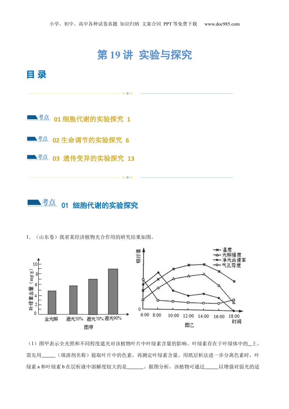 小学、初中、高中各种试卷真题知识归纳文案合同PPT等免费下载www.doc985.com第19讲实验与探究目录01细胞代谢的实验探究102生命调节的实验探究603遗传变异的实验探究1301细胞代谢的实验探究1.(山东卷)我省某经济植物光合作用的研究结果如图。(1)图甲表示全光照和不同程度遮光对该植物叶片中叶绿素含量的影响。叶绿素存在于叶绿体中的上。需先用(填溶剂名称)提取叶片中的色素,再测定叶绿素含量。用纸层析法进一步分离色素时,叶绿素a和叶绿素b在层析液中溶解度较大的是。据图分析,该植物可通过以增强对弱光的适小学、初中、高中各种试卷真题知识归纳文案合同PPT等免费下载www.doc985.com应能力。(2)图乙表示初夏某天在遮光50%条件下,温度、光照强度、该植物净光合速率和气孔导度(气孔张开的程度)的日变化趋势。8:00到12:00光照强度增强而净光合速率降低,主要原因是。18:00点时叶肉细胞内产生ATP的细胞器是。(3)实验过程中,若去除遮光物,短时间内叶肉细胞的叶绿体中C3化合物含量。2.科研人员对猕猴桃果肉的光合色素、光合放氧特性进行了系列研究。图甲为光合放氧测定装置示意图,图乙为不同光照条件下果肉随时间变化的光合放氧曲线。请回答下列问题:(1)取果肉薄片放入含乙醇的试管,并加入适量,以防止叶绿素降解。长时间浸泡在乙醇中的果肉薄片会变成白色,原因是。(2)若图1中装置在适宜温度下进行试验,则影响光合放氧速率的主要环境因素有(回答出两种主要因素)等。氧电极可以检测反应液中氧气的浓度,测定前应排除反应液中的干扰。(3)图1在反应室中加入NaHCO3的主要作用是。若提高反应液中NaHCO3浓度,果肉放氧速率的变化是(填“增大”、“减小”、“增大后稳定”或“稳定后减小”)。(4)图2中不同时间段曲线的斜率代表光合放氧的速率,对15~20min曲线的斜率几乎不变的合理解释是;若在20min后停止光照,则短时间内叶绿体中含量减少的物质有(填序号:①C5②ATP③[H]④C3),可推测20~25min曲线的斜率为(填“正值”、“负值”或“零”)。3.(2022·浙江高考真题)通过研究遮阴对花生光合作用的影响,为花生的合理间种提供依据。研究人员从开花至果实成熟,每天定时对花生植株进行遮阴处理。实验结果如表所示。处理指标光饱和点(klx)光补偿点(lx)低于5klx光合曲线的斜率(mgCO2.dm-2.hr-1.klx-1)叶绿素含量(mg·dm-2)单株光合产量(g干重)单株叶光合产量(g干单株果实光合产量(g干小学、初中、高中各种试卷真题知识归纳文案合同PPT等免费下载www.doc985.com重)重)不遮阴405501.222.0918.923.258.25遮阴2小时355151.232.6618.843.058.21遮阴4小时305001.463.0316.643.056.13注:光补偿点指当光合速率等于呼吸速率时的光强度。光合曲线指光强度与光合速率关系的曲线。回答下列问题:(1)从实验结果可知,花生可适应弱光环境,原因是在遮阴条件下,植株通过增加,提高吸收光的能力;结合光饱和点的变化趋势,说明植株在较低光强度下也能达到最大的;结合光补偿点的变化趋势,说明植株通过降低,使其在较低的光强度下就开始了有机物的积累。根据表中的指标可以判断,实验范围内,遮阴时间越长,植株利用弱光的效率越高。(2)植物的光合产物主要以形式提供给各器官。根据相关指标的分析,表明较长遮阴处理下,植株优先将光合产物分配至中。(3)与不遮阴相比,两种遮阴处理的光合产量均。根据实验结果推测,在花生与其他高秆作物进行间种时,高秆作物一天内对花生的遮阴时间为(A.<2小时B.2小时C.4小时D.>4小时),才能获得较高的花生产量。4.(2021·湖北高考真题)使酶的活性下降或丧失的物质称为酶的抑制剂。酶的抑制剂主要有两种类型:一类是可逆抑制剂(与酶可逆结合,酶的活性能恢复);另一类是不可逆抑制剂(与酶不可逆结合,酶的活性不能恢复)。已知甲、乙两种物质(能通过透析袋)对酶A的活性有抑制作用。实验材料和用具:蒸馏水,酶A溶液,甲物质溶液,乙物质溶液,透析袋(人工合成半透膜),试管,烧小学、初中、高中各种试卷真题知识归纳文案合同PPT等免费下载www.doc985.com杯等为了探究甲、乙两种物质对酶A的抑制作用类型,提...