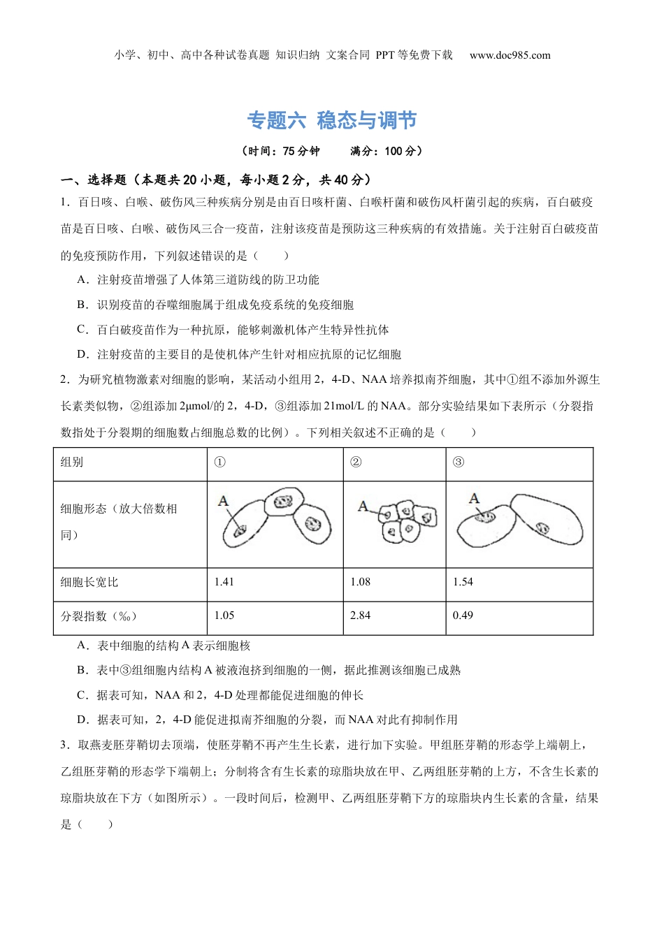 小学、初中、高中各种试卷真题知识归纳文案合同PPT等免费下载www.doc985.com专题六稳态与调节(时间:75分钟满分:100分)一、选择题(本题共20小题,每小题2分,共40分)1.百日咳、白喉、破伤风三种疾病分别是由百日咳杆菌、白喉杆菌和破伤风杆菌引起的疾病,百白破疫苗是百日咳、白喉、破伤风三合一疫苗,注射该疫苗是预防这三种疾病的有效措施。关于注射百白破疫苗的免疫预防作用,下列叙述错误的是()A.注射疫苗增强了人体第三道防线的防卫功能B.识别疫苗的吞噬细胞属于组成免疫系统的免疫细胞C.百白破疫苗作为一种抗原,能够刺激机体产生特异性抗体D.注射疫苗的主要目的是使机体产生针对相应抗原的记忆细胞2.为研究植物激素对细胞的影响,某活动小组用2,4-D、NAA培养拟南芥细胞,其中①组不添加外源生长素类似物,②组添加2μmol/的2,4-D,③组添加21mol/L的NAA。部分实验结果如下表所示(分裂指数指处于分裂期的细胞数占细胞总数的比例)。下列相关叙述不正确的是()组别①②③细胞形态(放大倍数相同)细胞长宽比1.411.081.54分裂指数(‰)1.052.840.49A.表中细胞的结构A表示细胞核B.表中③组细胞内结构A被液泡挤到细胞的一侧,据此推测该细胞已成熟C.据表可知,NAA和2,4-D处理都能促进细胞的伸长D.据表可知,2,4-D能促进拟南芥细胞的分裂,而NAA对此有抑制作用3.取燕麦胚芽鞘切去顶端,使胚芽鞘不再产生生长素,进行加下实验。甲组胚芽鞘的形态学上端朝上,乙组胚芽鞘的形态学下端朝上;分制将含有生长素的琼脂块放在甲、乙两组胚芽鞘的上方,不含生长素的琼脂块放在下方(如图所示)。一段时间后,检测甲、乙两组胚芽鞘下方的琼脂块内生长素的含量,结果是()小学、初中、高中各种试卷真题知识归纳文案合同PPT等免费下载www.doc985.comA.甲、乙都含生长素B.甲、乙都不含生长素C.甲不含生长素,乙含生长素D.甲含生长素,乙不含生长素4.如图表示动物体温调节过程的部分示意图,图中①、②、③代表激素,当某健康人走出温暖房间进入非常寒冷的环境时,下列叙述不正确的是()A.进入寒冷环境后,机体通过皮肤毛细血管收缩,汗液分泌减少等各种途径减少散热B.血液中激素②会增加,可促进骨骼肌与内脏代谢活动增强,使产热量增加C.激素①、②对垂体的作用效应分别为促进、抑制D.下丘脑是人体体温平衡的调节中枢,是形成冷觉、热觉的部位5.2020年诺贝尔生理学或医学奖揭晓,三位科学家因发现丙肝病毒而获奖。丙肝病毒所含的核酸为单链RNA,下列相关叙述正确的是()A.丙肝病毒进入人体后,吞噬细胞可以对其进行识别和吞噬消灭,这属于特异性免疫B.丙肝病毒的遗传物质被彻底水解后得到的产物一共有6种C.可以通过吡罗红染色的方法,鉴别肝脏细胞是否被丙肝病毒感染D.当病毒感染人体,引发机体发生特异性免疫时,浆细胞增殖分化产生抗体6.在2022年国际泳联世锦赛中,中国跳水队喜摘跳水比赛的13个项目的全部金牌,再一次捍卫了“梦之队”的荣耀。跳水运动员在跳水过程中体内会发生一系列的生命活动,下列叙述正确的是()A.肌肉酸痛与内环境中进行无氧呼吸产生的乳酸有关小学、初中、高中各种试卷真题知识归纳文案合同PPT等免费下载www.doc985.comB.跳水过程中通过副交感神经传出信息导致心跳加快C.跳水过程中体温能够维持稳定与位于脑干的体温调节中枢有关D.跳水过程中的一系列动作需要大脑和小脑的共同调控7.尼古丁是烟草烟雾中的活性成分,具有刺激性气味和辛辣的味道,它是一种高度成瘾的物质,可作用于神经系统,如下图所示。下列相关叙述,错误的是()A.尼古丁受体可以为Na+提供通道B.戒烟后,体重可能会增加C.戒烟前,POMC神经元的兴奋性上升,肾上腺素的释放增多D.尼古丁经过体液运输作用于神经细胞,属于神经调节8.研究发现,睡眠主要依靠脑部多个脑区产生的胞外腺苷来调节,胞外腺苷与突触后膜上的受体结合可促进睡眠。咖啡、茶、可乐等饮料中均含有咖啡因,咖啡因是腺苷类似物,能与受体结合,但并不引起胞外腺苷相应的效应。下列叙述错误的是()A.与动物激素类似,胞外腺苷与细胞膜上受体结合并发挥作用后会被降解灭活...