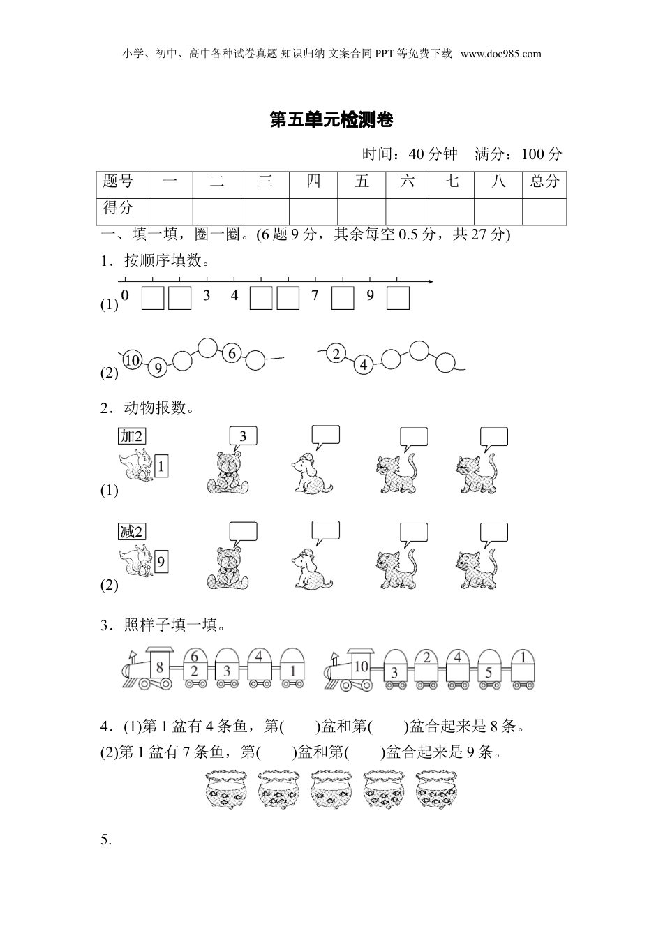 小学、初中、高中各种试卷真题知识归纳文案合同PPT等免费下载www.doc985.com第五元卷单检测时间:40分钟满分:100分题号一二三四五六七八总分得分一、填一填,圈一圈。(6题9分,其余每空0.5分,共27分)1.按顺序填数。(1)(2)2.动物报数。(1)(2)3.照样子填一填。4.(1)第1盆有4条鱼,第()盆和第()盆合起来是8条。(2)第1盆有7条鱼,第()盆和第()盆合起来是9条。5.小学、初中、高中各种试卷真题知识归纳文案合同PPT等免费下载www.doc985.com()个()个6.(1)图中一共有()个水果,其中有()个,有()个。(2)从右边数,第()个、第()个、第()个和第()个都是。(3)把左边的3个水果圈起来。二、算一算。(1题6分,2题8分,3题10分,共24分)1.3+6=10-2=2+8=9-4=9+1=8-4=7-3=6+4=10-3=7-2=10-6=8-2=2.4+4-1=10-6+5=9-3-2=7-0+3=2+6+1=9-2+3=6-2+3=3+4+2=3.三、遮住的数是几?请填一填。(每空1分,共6分)6+=10-2=79-=9+3=99-=58+=10小学、初中、高中各种试卷真题知识归纳文案合同PPT等免费下载www.doc985.com四、在里填上“>”“<”或“=”。(每空1分,共6分)48-57-25+14+36910-18-610-875+3五、用下面的数写算式。(4分)+=+=+=+=-=-=-=-=六、画一画,填一填。(每题2分,共6分)1.○○○○______________________4+=102.☆______________________1+=73.□□□□□______________________5+=10七、看图列式。(每题2分,共10分)1.+=+=-=-=小学、初中、高中各种试卷真题知识归纳文案合同PPT等免费下载www.doc985.com2.--=(个)3.=(人)4.8-+=(只)5.--=(个)八、解决问题。(3题9分,其余每题4分,共17分)1.女孩踢了下,男孩踢了下,两人一共踢了几下?=(下)2.一共有9个。小学、初中、高中各种试卷真题知识归纳文案合同PPT等免费下载www.doc985.com还剩几个?=(个)3.(1)还剩多少盆花?=(盆)(2)左边有()棵树,右边有()棵树。一共有多少棵树?=(棵)(3)再提一个数学问题并解答。小学、初中、高中各种试卷真题知识归纳文案合同PPT等免费下载www.doc985.com答案一、1.(1)1256810(2)87568102.(1)579(2)75313.547786594.(1)23(2)45(或23)5.989>86.(1)1046(2)47810(3)略二、1.9810510441075462.79410910793.6463781947三、490642四、><>==<五、2+4=64+5=92+7=92+6=89-7=27-2=58-2=69-5=4(答案不唯一)六、1.○○○○○○4+6=102.☆☆☆☆☆☆1+6=73.□□□□□5+5=10七、1.6+3=93+6=99-3=69-6=32.7-2-1=4(个)3.6-2-2=2(人)4.8-5+3=6(只)5.10-1-3=6(个)八、1.373+7=10(下)2.9-3=6(个)3.(1)9-2=7(盆)(2)424+2=6(棵)小学、初中、高中各种试卷真题知识归纳文案合同PPT等免费下载www.doc985.com(3)一共有多少只小鸡?3+4=7(只)(答案不唯一)