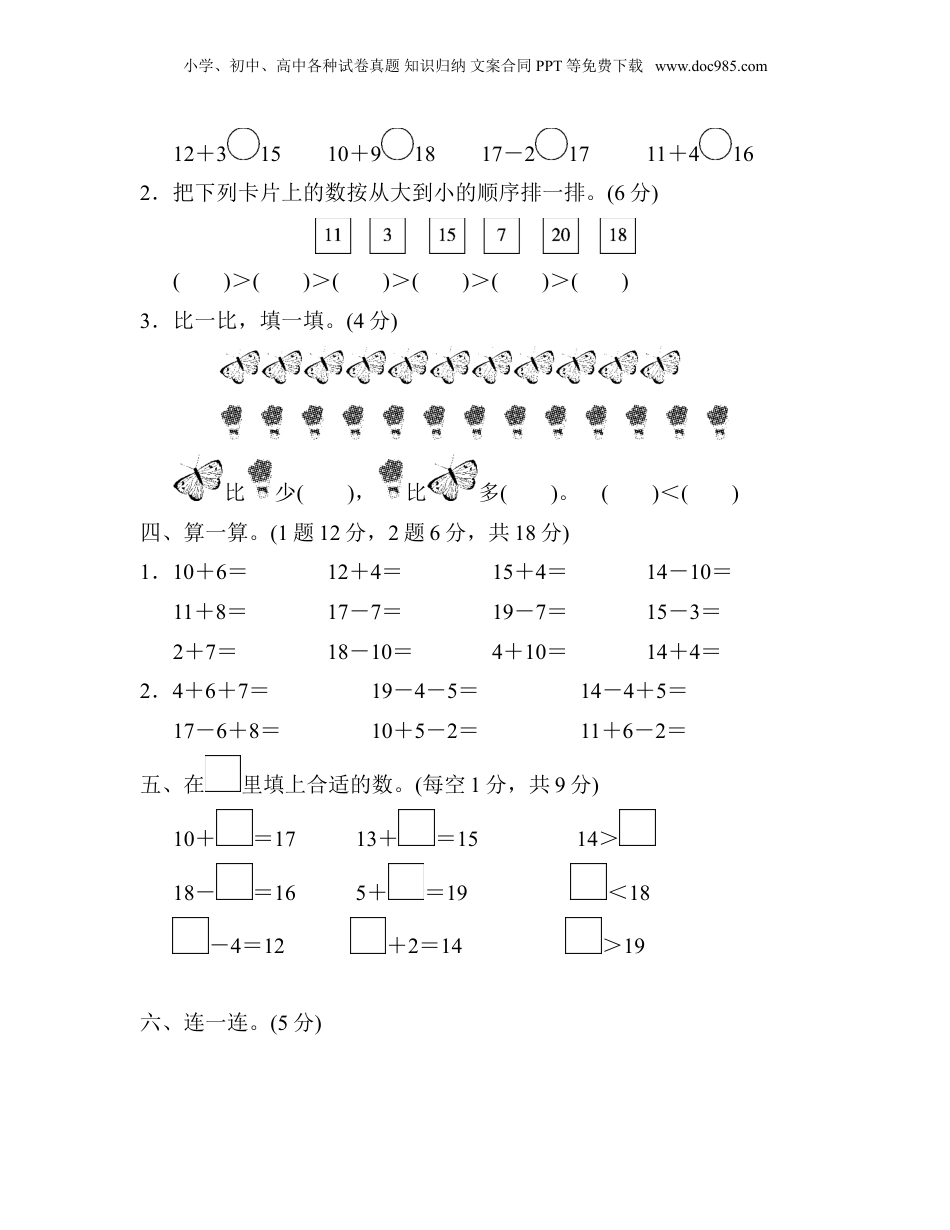 小学、初中、高中各种试卷真题知识归纳文案合同PPT等免费下载www.doc985.com第六元卷单检测时间:40分钟满分:100分题号一二三四五六七八总分得分一、填一填,圈一圈。(6题3分,其余每空1分,共16分)1.16的个位是(),十位是()。2.和19相邻的两个数是()和()。3.16由()个十和()个一组成,它后面的一个数是()。4.20里面有()个一,()个十是20。5.看图写数。6.一共有()只小猴,把左边的五只小猴圈起来,从右边数,把第4只圈起来。二、我会画一画。(8分)三、比一比,排一排。(18分)1.在里填上“>”“<”或“=”。(每空1分,共8分)121317-21414+52016-610小学、初中、高中各种试卷真题知识归纳文案合同PPT等免费下载www.doc985.com12+31510+91817-21711+4162.把下列卡片上的数按从大到小的顺序排一排。(6分)()>()>()>()>()>()3.比一比,填一填。(4分)比少(),比多()。()<()四、算一算。(1题12分,2题6分,共18分)1.10+6=12+4=15+4=14-10=11+8=17-7=19-7=15-3=2+7=18-10=4+10=14+4=2.4+6+7=19-4-5=14-4+5=17-6+8=10+5-2=11+6-2=五、在里填上合适的数。(每空1分,共9分)10+=1713+=1514>18-=165+=19<18-4=12+2=14>19六、连一连。(5分)小学、初中、高中各种试卷真题知识归纳文案合同PPT等免费下载www.doc985.com七、看图列式计算。(1题4分,其余每题2分,共10分)1.====2.=(块)3.=(个)4.=(人)八、解决问题。(每题4分,共16分)1.王明和李晓之间有人。2.小丽在看《西游记》。你知道她今天看了多少页吗?小学、初中、高中各种试卷真题知识归纳文案合同PPT等免费下载www.doc985.com=(页)小丽今天看了页。3.=(个)盒子里有个●。4.聪聪的生日是()月()日星期()。小学、初中、高中各种试卷真题知识归纳文案合同PPT等免费下载www.doc985.com答案一、1.612.18203.16174.2025.121614196.11二、略三、1.<><==><<2.20>18>15>11>7>33.221113四、1.1616194191012129814182.171015191315五、721221416161220(个别空答案不唯一)六、七、1.10+5=155+10=1515-5=1015-10=52.11+3=14(块)3.17-5=12(个)4.2+4+3=9(人)八、1.42.16-10+1=7(页)73.18-10-1=7(个)7小学、初中、高中各种试卷真题知识归纳文案合同PPT等免费下载www.doc985.com4.1217五