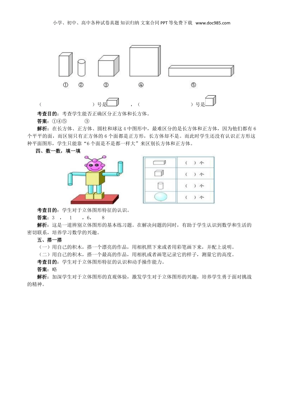 小学、初中、高中各种试卷真题知识归纳文案合同PPT等免费下载www.doc985.com《认识图形(一)》同步试题一、连一连考查目的:考查学生能否辨认长方体、正方体、圆柱和球等立体图形。答案:解析:学生能够通过实物辨认长方体、正方体、圆柱和球等立体图形。说明学生已经基本了解长方体、正方体、圆柱和球等立体图形的特征。二、数一数有()个,有()个,有()个,有()个。考查目的:考查学生是否能够根据图形的特征正确辨认长方体、正方体、圆柱和球等立体图形,并准确数出每种图形的数量。答案:5362解析:将图形的认识和数数结合起来,学生既要正确辨认出图形,还要将这种图形都找到病准确数出它们的数量。本题中的扁长方体容易被忽视,引导学生养成仔细观察的好习惯。三、选一选小学、初中、高中各种试卷真题知识归纳文案合同PPT等免费下载www.doc985.com()号是,()号是考查目的:考查学生能否正确区分正方体和长方体。答案:①④⑤③解析:在长方体、正方体、圆柱和球这4中图形中,最难区分的是长方体和正方体,因为他们都有6个平平的面,而区别只有正方体的6个面都是正方形,长方体却不是。而此时学生还没有认识正方形这种平面图形,学生只能靠“6个面是不是都一样大”来区别长方体和正方体。四、数一数,填一填om考查目的:学生对于立体图形特征的认识。答案:3,1,6,8解析:这是一道辨别立体图形的基本练习题。在解决问题的同时,有助于学生认识到数学和生活的密切联系,培养学习数学的兴趣。五、搭一搭(一)用自己的积木,搭一个漂亮的作品,用相机照下来或者用彩笔画下来,并配上说明。(二)用自己的积木,搭一个最高的作品,用相机或者画笔记录它的样子,测量它的高度。考查目的:学生对于立体图形特征的认识和动手操作能力。答案:略解析:加深学生对于立体图形的直观体验,激发学生对于立体图形的兴趣,培养学生勇于面对挑战的精神。