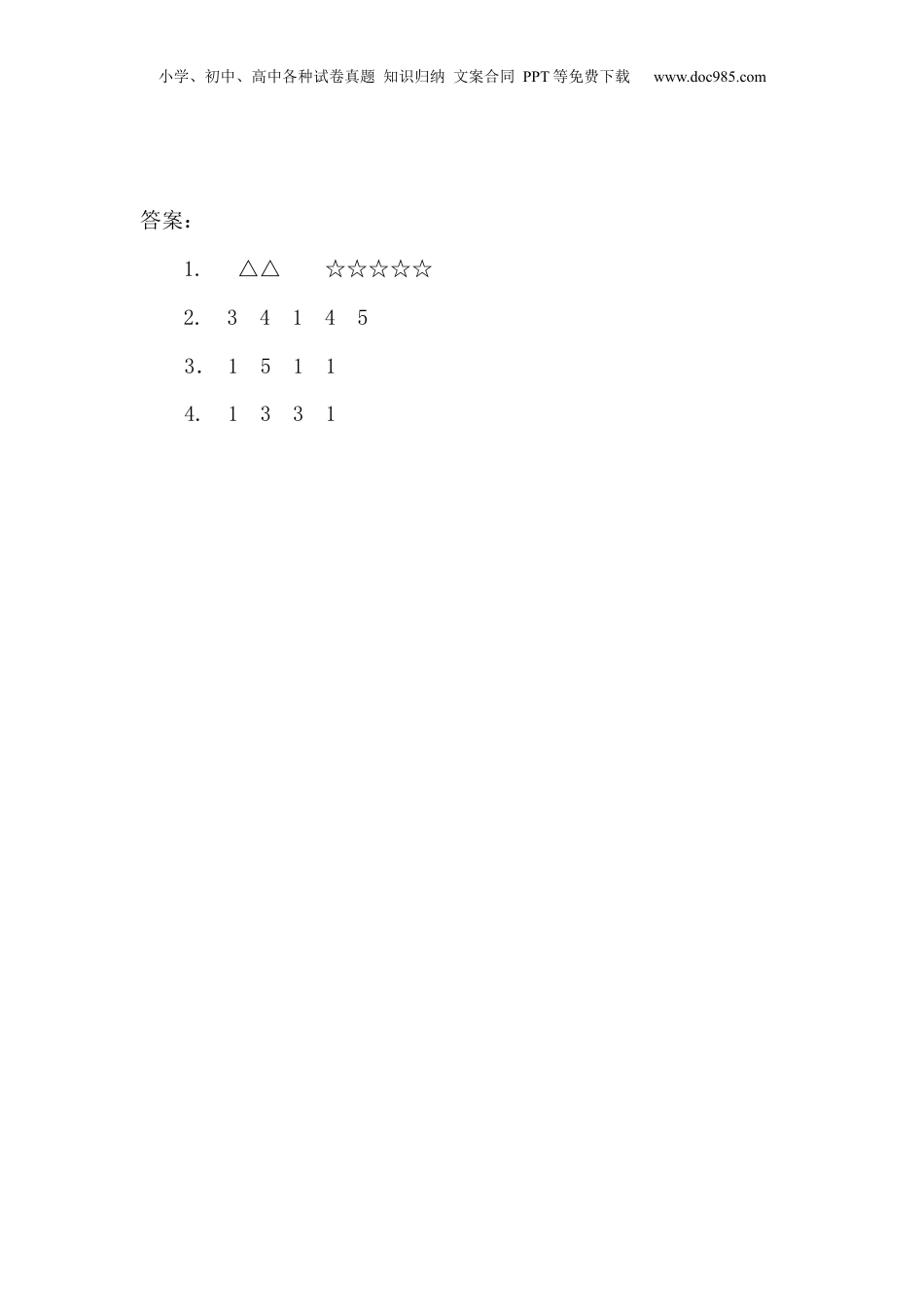 小学、初中、高中各种试卷真题知识归纳文案合同PPT等免费下载www.doc985.com3.4分与合1.画一画。2.填一填。3.4.开火车。小学、初中、高中各种试卷真题知识归纳文案合同PPT等免费下载www.doc985.com答案:1.△△☆☆☆☆☆2.341453.15114.1331