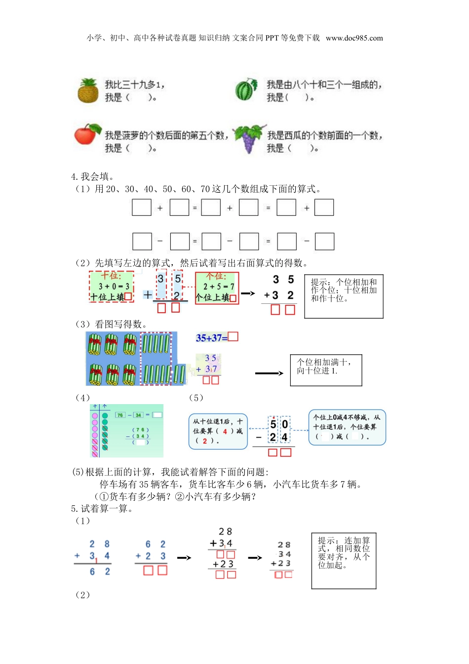 小学、初中、高中各种试卷真题知识归纳文案合同PPT等免费下载www.doc985.com一走进图形世界1.数一数。2.用6个完全相同的可以拼成一个什么图形?自己试一试。3.把三角形的一条边去掉,是什么图形呢?(提示:这样的图形我们把它叫做角,如下图。)(1)下面图形,是角的在()里打∨,不是角的打×。(2)认识下面的角吗?我能在下面拼成的角中找到直角、锐角和钝角。(3)试着在下面的方格纸上用三角尺画出两个不同的直角。(4)拿一张长方形纸,先上下对折,再()对折可以得到直角。4.哪个图是小兰看到的?在正确的下面打“∨”。小学、初中、高中各种试卷真题知识归纳文案合同PPT等免费下载www.doc985.com5.它们看到的数字分别是几?【答案】1.464322.3.角(1)∨××∨(2)锐钝锐钝直(3)(4)44.5.245二数与加减法1.填一填。2.想一想,□里填几。3.下面的水果代表的是哪个数呢?小学、初中、高中各种试卷真题知识归纳文案合同PPT等免费下载www.doc985.com4.我会填。(1)用20、30、40、50、60、70这几个数组成下面的算式。(2)先填写左边的算式,然后试着写出右面算式的得数。(3)看图写得数。(4)(5)(5)根据上面的计算,我能试着解答下面的问题:停车场有35辆客车,货车比客车少6辆,小汽车比货车多7辆。(①货车有多少辆?②小汽车有多少辆?5.试着算一算。(1)(2)个位相加满十,向十位进1.提示:个位相加和作个位;十位相加和作十位。提示:连加算式,相同数位要对齐,从个位加起。小学、初中、高中各种试卷真题知识归纳文案合同PPT等免费下载www.doc985.com(3)【答案】1.456102.50、80、1003.408345824.(1)20+70=30+60=40+5070-60=50-40=30-2070-50=60-40=50-3070-40=60-30=50-20(2)373767(3)7272(4)424226104(5)35-6=29(辆)29+7=36(辆)5.(1)85628585(2)194519(3)704242704270三分类、量与计量1.分一分。(1)按形状分并涂一涂。(2)按点数分。2.填一填。50角=()元25角=()元()角4元+1元2角=()元()角6角+5角=()角=()元()角3.我会填。(1)很久以前,人们常用身体的一部分作为测量长度的单位。提示:连减算式,相同数位要对齐,从个位减起。提示:加减混合算式写成一个竖式时,也是把相同数位对齐。小学、初中、高中各种试卷真题知识归纳文案合同PPT等免费下载www.doc985.com(2)用尺子测量比较短的物体,常用“厘米”作单位。(厘米用“cm”表示)在直尺上,从0到1的长度是1厘米,从()到()也是1厘米,从()到()还是1厘米。(3)你知道下面的长度是几厘米吗?(4)测量比较长的物体,常用“米”作单位(米用“m”表示),观察下面的米尺,看看1米里有多少个1厘米?1米=()厘米或1m=()cm(5)我认识线段并会画线段。(6)画3厘米长的线段的方法:我也试着画出一条4厘米长的线段。(7)数一数,下面的图形各有几条线段。提示:线段是直的,有两个端点。小学、初中、高中各种试卷真题知识归纳文案合同PPT等免费下载www.doc985.com(8)1食指的宽度大约是1厘米,米尺的长度是1米,请你选择合适的单位“厘米”、“米”填空。4.我会看时间。(1)分针走1个小格,就是1分钟,走5个小格就是()分钟,也就是1个大格。填出右图中分针走过的时间。(2)分针走半圈(6个大格)就是30分钟,也就是()半小时;走1整圈也就是走12个大格是()小时,也就是60分钟,所以1小时=()分钟。(3)我会写出下面的时刻。(4)试着写出下面钟面上的时刻。5.新闻联播晚上()时整开始,要播放30分,()时()分结束。提示:走几个大格就是走几个5分钟。小学、初中、高中各种试卷真题知识归纳文案合同PPT等免费下载www.doc985.com【答案】1.4454452.5255265653.(2)12334(答案不唯一)(3)457(4)100100(6)略(7)434(8)厘米米厘米4.(1)51020354555(2)半160(3)4:054:304:45(4)7:307:408:005.77时30分四表内乘法1.小火车里共有多少个人?每节小火车有()人,坐了()节,求一共有多少人,就是求6个()连加的和,列式是()。思考:这几个算式的加数都()。这种加数相同的加法,还可以用乘法表示。乘法算式:4×6=24读作:4乘6等于24或6×4=...