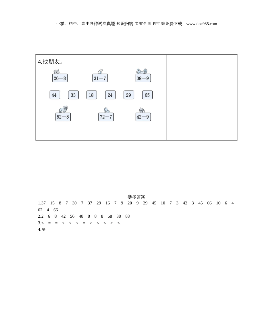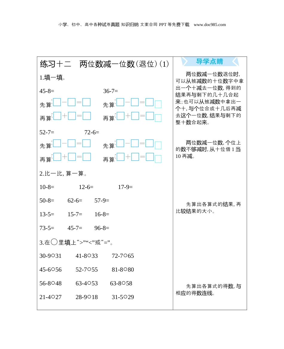小、初中、高中各卷知文案合同学种试真题识归纳PPT等免下费载www.doc985.com十二练习位一位两数减数(退位)(1)1.一。填填45-8=36-7=先算先算再算再算52-7=72-6=先算先算再算再算2.比一比,算一算。10-8=12-6=17-9=50-8=62-6=57-9=13-5=15-7=16-8=73-5=45-7=96-8=3.在○里上“填>”“<”或“=”。30-9○3141-8○3372-7○6545-6○5652-7○5581-8○8056-8○4863-4○5363-8○5821-4○2728-9○1831-5○29位一位退位两数减数时,可以被的十位字中拿从减数数出一十去一位个减数,得到的果再剩下的几十几合起结与来;也可以被中拿出一从减数十个,位合成十几后再与个减去一位这个数,果剩下的结与整十合起。数来位一位两数减数,位上个的不数够减时,十位借从1当10再。减先算出各算式的果结,再比果的大小。较结先算出各算式的得数,与相的得。应数连线小、初中、高中各卷知文案合同学种试真题识归纳PPT等免下费载www.doc985.com4.找朋友。考答案参1.371587307372916792092945107342345661064624662.2684256488886838883.<==<<<=><<><4.略