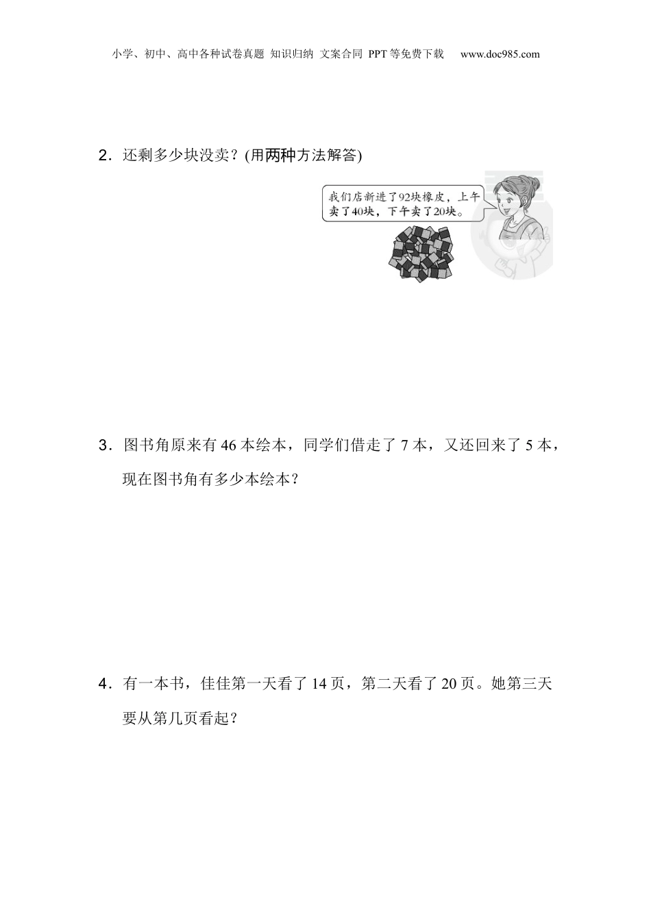 小学、初中、高中各种试卷真题知识归纳文案合同PPT等免费下载www.doc985.com重难点突破卷2一、我会填。(每题4分,共20分)1.一个数,从右边起,第一位是3,第二位是4,这个数是(),读作()。2.55是()位数,高位上的“5”表示5个(),低位上的“5”表示5个()。3.在22和30这两个数中,()更接近27。4.在12、70、23这三个数中,16比()少得多。5.10元=()角12角=()元()角60角=()元1元8角=()角二、我会算。(每题2分,共18分)20+6+9=60-20-30=45+40-10=93-60+8=76-(25+5)=38+(42+8)=82-30-7=92-(54-50)=24+(49-9)=三、走进生活,解决问题。(1、2每题题9分,其余每题11分,共62分)1.原来有26个气球。现在还有多少个气球没有被踩爆?小学、初中、高中各种试卷真题知识归纳文案合同PPT等免费下载www.doc985.com2.还剩多少块没卖?(用方法解答两种)3.图书角原来有46本绘本,同学们借走了7本,又还回来了5本,现在图书角有多少本绘本?4.有一本书,佳佳第一天看了14页,第二天看了20页。她第三天要从第几页看起?小学、初中、高中各种试卷真题知识归纳文案合同PPT等免费下载www.doc985.com5.全班有32人参加跳绳比赛。剩下的都参加集体跳绳,参加集体跳绳的有多少人?6.它们一共摘了多少根玉米?小学、初中、高中各种试卷真题知识归纳文案合同PPT等免费下载www.doc985.com答案一、1.43四十三2.两十一3.304.705.10012618二、351075414688458864三、1.26-8-2=16(个)口答:现在还有16个气球没有被踩爆。2.方法一:92-40-20=32(块)方法二:92-(40+20)=32(块)口答:还剩32块没卖。3.46-7+5=44(本)口答:现在图书角有44本绘本。[点拨]第3个条件是“又还回来了5本”,所以要加上5。4.14+20+1=35(页)口答:她第三天要从第35页看起。5.32-10-4=18(人)口答:参加集体跳绳的有18人。6.40+(40+8)=88(根)口答:它们一共摘了88根玉米。