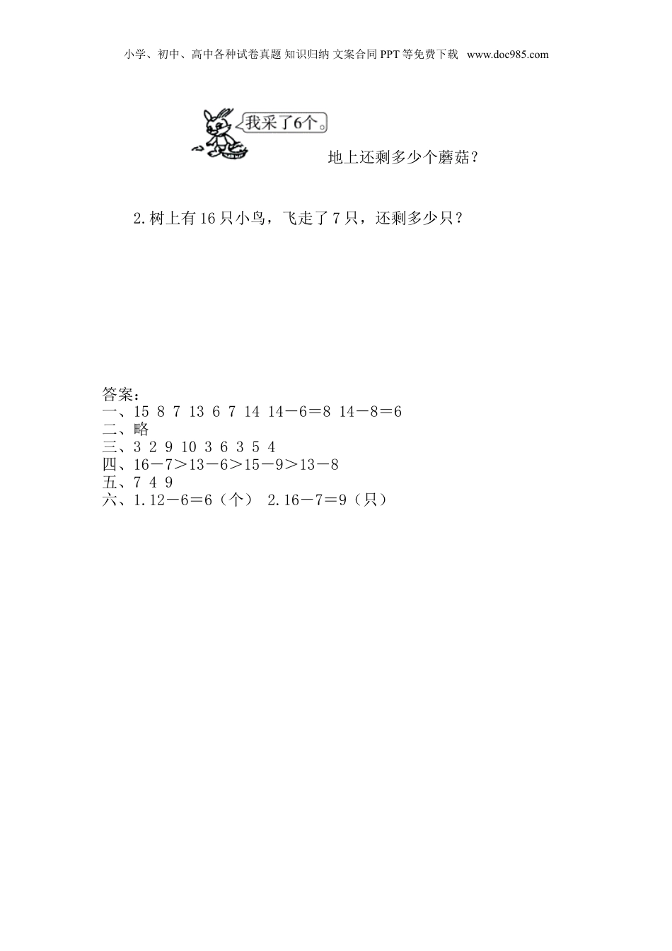 小学、初中、高中各种试卷真题知识归纳文案合同PPT等免费下载www.doc985.com2.22十几减7、6一、算一算,照样子写一写。158713671414-6=8二、连一连。三、算一算。13-6-4=14-7-5=12+5-8=12-8+6=13-8-2=9+4-7=15-7-3=8+4-7=6+6-8=四、我会排。()>()>()>()五、小小体育用品店。六、解决问题。1.地上原来有12个蘑菇。原有15个11个15个卖出8个7个6个还剩()个()个()个7+8=15-7=15-8=6+7=13-7=13-6=6+8=□○□=□□○□=□小学、初中、高中各种试卷真题知识归纳文案合同PPT等免费下载www.doc985.com地上还剩多少个蘑菇?2.树上有16只小鸟,飞走了7只,还剩多少只?答案:一、158713671414-6=814-8=6二、略三、3291036354四、16-7>13-6>15-9>13-8五、749六、1.12-6=6(个)2.16-7=9(只)