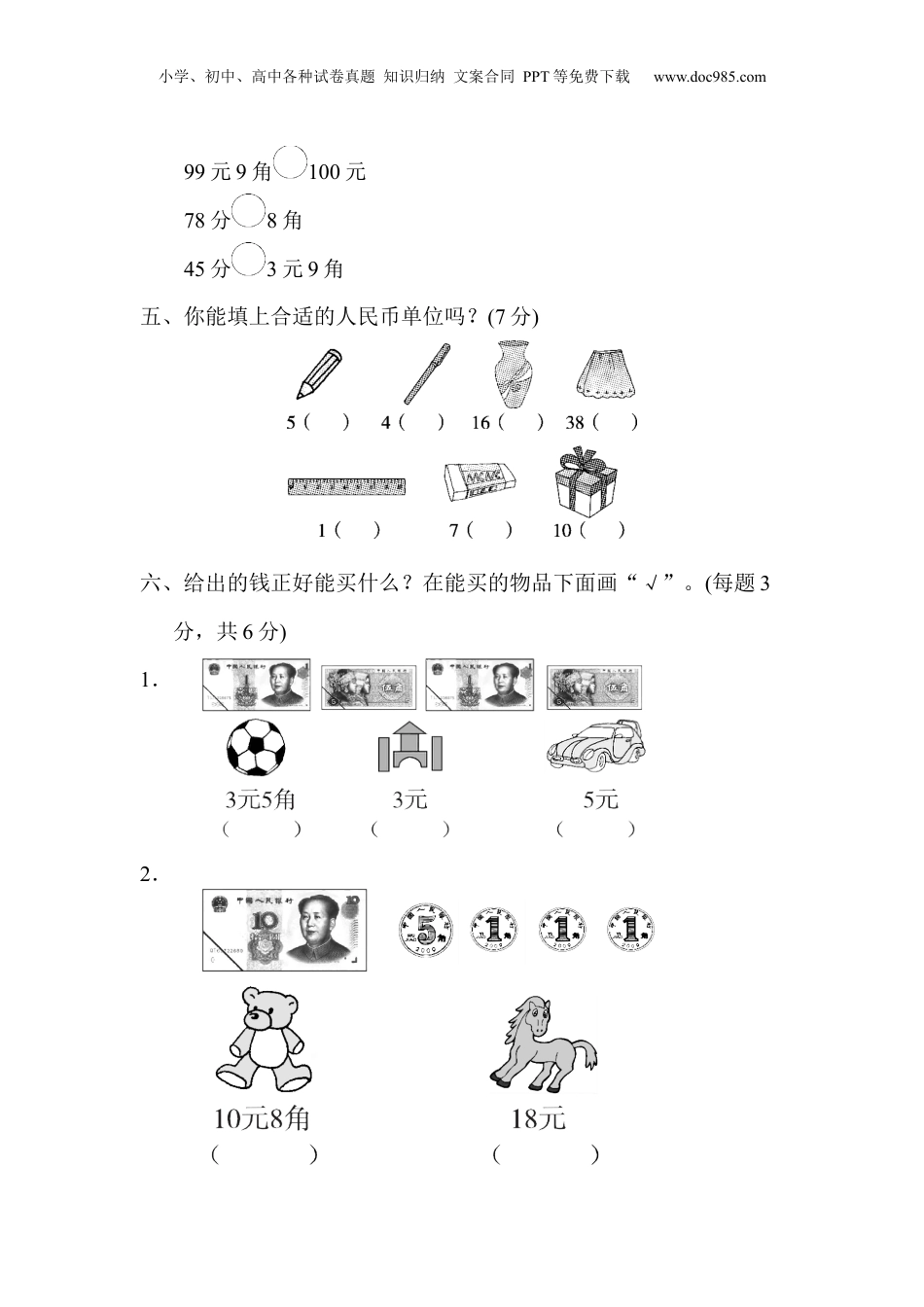 小学、初中、高中各种试卷真题知识归纳文案合同PPT等免费下载www.doc985.com第五单元过关检测卷一、认真填一填。(每空1分,共25分)1.人民币的单位有()、()、(),其中最大的单位是()。2.1张可以换()张,还可以换()张。3.1张可以换()张和()张。4.()元()角如果用这些钱去买一个8元的卷笔器,还差()钱。5.写出下面人民币的面值。6.60角=()元9元=()角4角5分=()分70分=()角8角=()分小学、初中、高中各种试卷真题知识归纳文案合同PPT等免费下载www.doc985.com1元6角=()角二、智慧辨一辨。(对的画“√”,错的画“×”)(每题1分,共4分)1.元、角、分相邻单位之间的进率是100。()2.2个5角和10个1角相等。()3.一块橡皮5角,一支钢笔6元5角,橡皮比钢笔便宜1元。()4.从6张1元钱、1张5元钱中拿6元钱,可以有两种不同的拿法。()三、快乐算一算。(9分)6角+8角=()元()角18元-9元=()元6角+4元=()元()角1元8角-4角=()元()角1元-2角=()角1元2角+8角=()元四、在里填上“>”“<”或“=”。(8分)8元1角8元8元7元9角90分9角20元7角27角48元4元8角小学、初中、高中各种试卷真题知识归纳文案合同PPT等免费下载www.doc985.com99元9角100元78分8角45分3元9角五、你能填上合适的人民币单位吗?(7分)六、给出的钱正好能买什么?在能买的物品下面画“√”。(每题3分,共6分)1.2.小学、初中、高中各种试卷真题知识归纳文案合同PPT等免费下载www.doc985.com七、解决问题。(1,3题每题6分,2题12分,4题17分,共41分)1.买下面的物品各一件该怎样付钱?请圈一圈。2.我来当收银员。(算一算,填一填)小学、初中、高中各种试卷真题知识归纳文案合同PPT等免费下载www.doc985.com3.如果你有10元钱,在正好花完的情况下,可以买哪两件不同的物品?将序号写在横线上。可以买:方法一:__________________;方法二:__________________;方法三:__________________。小学、初中、高中各种试卷真题知识归纳文案合同PPT等免费下载www.doc985.com4.去文具店买文具。(1)买一本笔记本和一副三角尺要花多少钱?(2)一个转笔刀比一个计算器便宜多少钱?(3)你还能提出什么数学问题?并解答。小学、初中、高中各种试卷真题知识归纳文案合同PPT等免费下载www.doc985.com答案一、1.元角分元2.2103.22(答案不唯一)4.764角5.1分1角5角1元1元5元20元1角6.6904578016二、1.×2.√3.×4.√三、149461482四、>>=>><<<五、角元元元元角元六、1.()(√)()2.(√)()七、1.略2.要付的钱数:5元8角1元4角7元2角应找回的钱数:2角6角2元8角3.①③②⑥④⑤4.(1)1元2角+8角=2元(2)12元6角-2元=10元6角(3)略