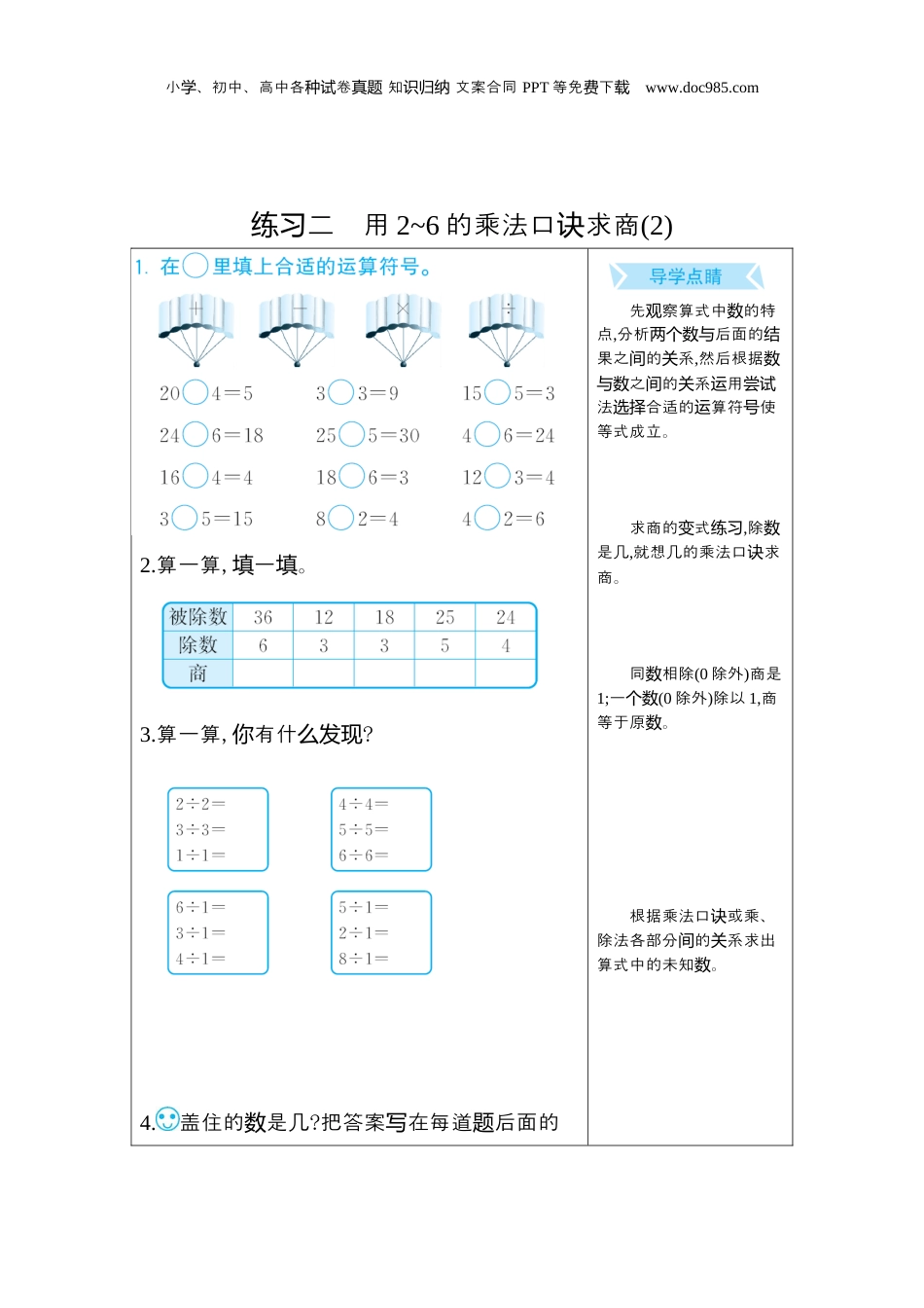 小、初中、高中各卷知文案合同学种试真题识归纳PPT等免下费载www.doc985.com二用练习2~6的乘法口求商诀(2)2.算一算,一。填填3.算一算,有什你么发现?4.盖住的是几数?把答案在每道后面的写题先察算式中的特观数点,分析后面的两个数与结果之的系间关,然后根据数之的系用与数间关运尝试法合适的算符使选择运号等式成立。求商的式变练习,除数是几,就想几的乘法口求诀商。同相除数(0除外)商是1;一个数(0除外)除以1,商等于原。数根据乘法口或乘、诀除法各部分的系求出间关算式中的未知。数小、初中、高中各卷知文案合同学种试真题识归纳PPT等免下费载www.doc985.com括里。号÷6=4()8÷=4()÷6=5()×3=12()÷3=6()×6=30()÷4=5()2×=10()考答案参1.÷×÷-+×÷÷÷×÷+2.646563.1111116345284.242304185205