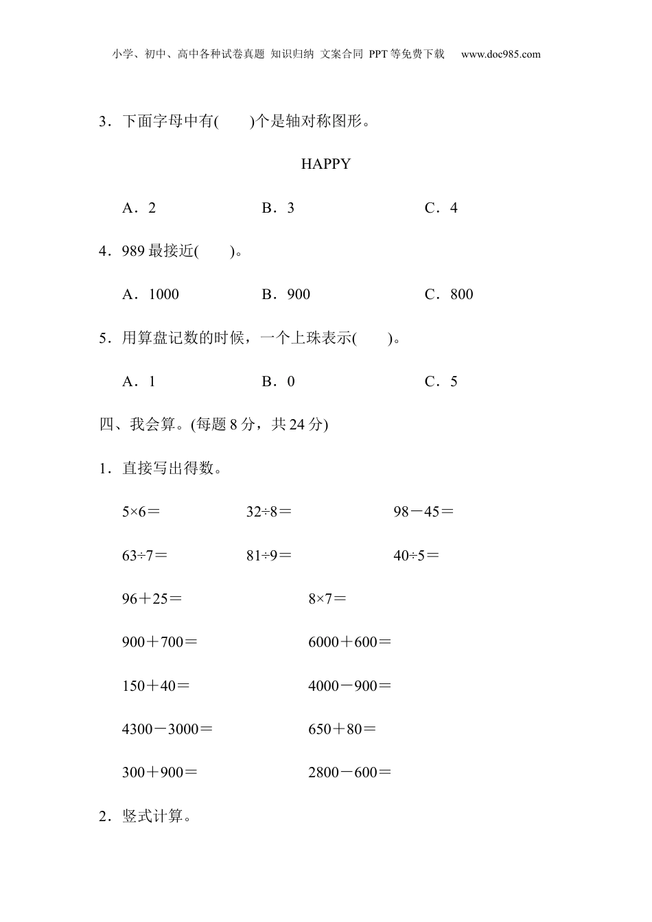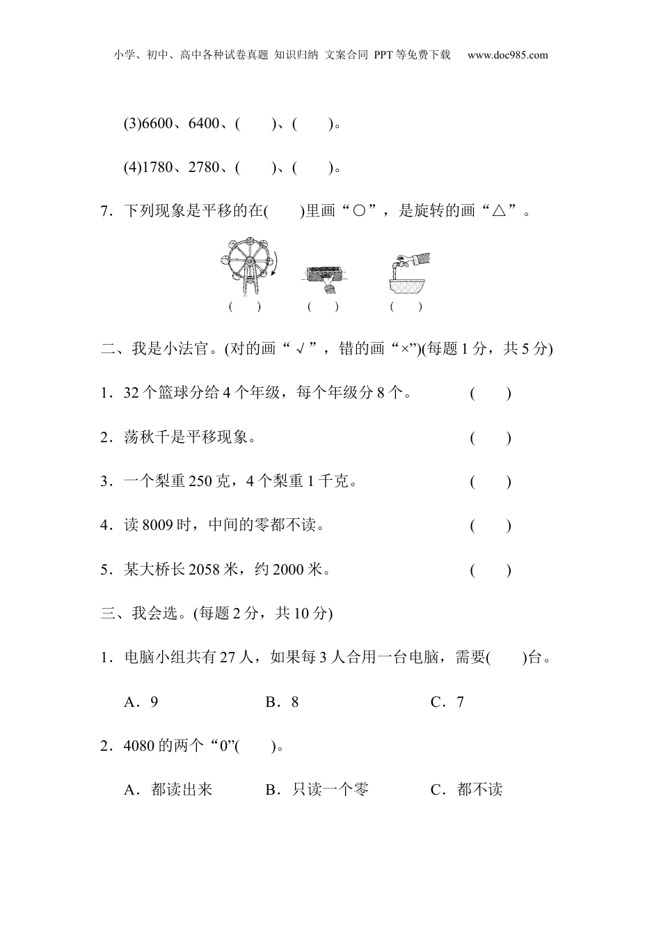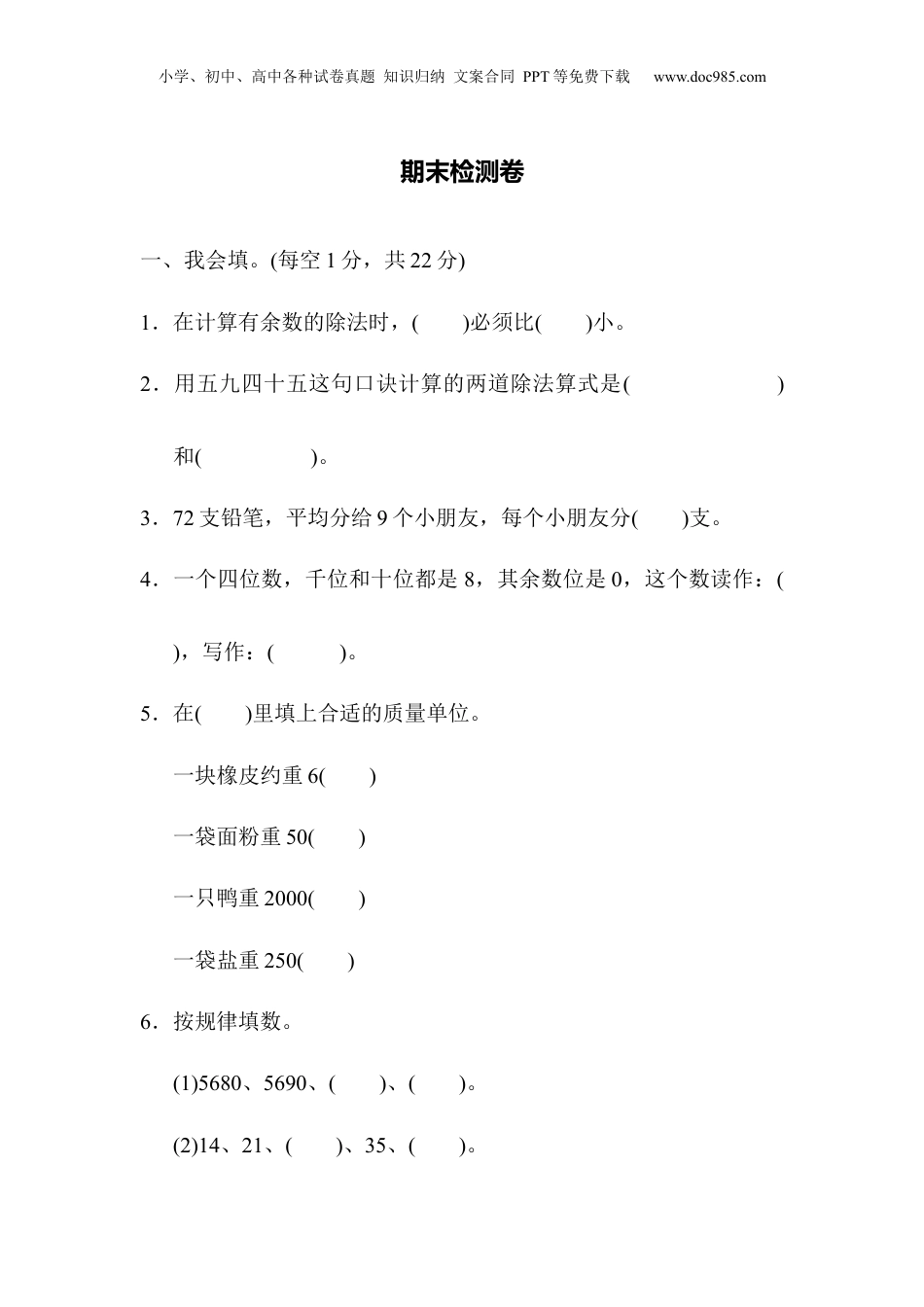 小学、初中、高中各种试卷真题知识归纳文案合同PPT等免费下载www.doc985.com期末检测卷一、我会填。(每空1分,共22分)1.在计算有余数的除法时,()必须比()小。2.用五九四十五这句口诀计算的两道除法算式是()和()。3.72支铅笔,平均分给9个小朋友,每个小朋友分()支。4.一个四位数,千位和十位都是8,其余数位是0,这个数读作:(),写作:()。5.在()里填上合适的质量单位。一块橡皮约重6()一袋面粉重50()一只鸭重2000()一袋盐重250()6.按规律填数。(1)5680、5690、()、()。(2)14、21、()、35、()。小学、初中、高中各种试卷真题知识归纳文案合同PPT等免费下载www.doc985.com(3)6600、6400、()、()。(4)1780、2780、()、()。7.下列现象是平移的在()里画“○”,是旋转的画“△”。二、我是小法官。(对的画“√”,错的画“×”)(每题1分,共5分)1.32个篮球分给4个年级,每个年级分8个。()2.荡秋千是平移现象。()3.一个梨重250克,4个梨重1千克。()4.读8009时,中间的零都不读。()5.某大桥长2058米,约2000米。()三、我会选。(每题2分,共10分)1.电脑小组共有27人,如果每3人合用一台电脑,需要()台。A.9B.8C.72.4080的两个“0”()。A.都读出来B.只读一个零C.都不读小学、初中、高中各种试卷真题知识归纳文案合同PPT等免费下载www.doc985.com3.下面字母中有()个是轴对称图形。HAPPYA.2B.3C.44.989最接近()。A.1000B.900C.8005.用算盘记数的时候,一个上珠表示()。A.1B.0C.5四、我会算。(每题8分,共24分)1.直接写出得数。5×6=32÷8=98-45=63÷7=81÷9=40÷5=96+25=8×7=900+700=6000+600=150+40=4000-900=4300-3000=650+80=300+900=2800-600=2.竖式计算。小学、初中、高中各种试卷真题知识归纳文案合同PPT等免费下载www.doc985.com45÷9=76÷8=35÷6=56÷8=3.计算下列各题。68+5×598-27÷3====(16+38)÷68×(24÷3)====五、下面是二(1)班同学喜欢的运动项目统计情况。(1题4分,其余每题3分,共13分)小学、初中、高中各种试卷真题知识归纳文案合同PPT等免费下载www.doc985.com足球正篮球正正排球正正踢毽子正正正正正正1.把上面的统计结果填入下表中。项目足球篮球排球踢毽子人数2.喜欢哪种运动项目的人最多?喜欢哪种运动项目的人最少?3.如果让你给学校买体育器材,你会多买什么器材?为什么?4.你还能提出其他数学问题吗?六、解决问题。(4题6分,其余每题5分,共26分)1.哪一种袜子较便宜?小学、初中、高中各种试卷真题知识归纳文案合同PPT等免费下载www.doc985.com2.买一辆自行车和一个电饭锅,爸爸带600元够吗?3.有68千克苹果,如果每筐苹果9千克,至少需要装多少筐?4.灯笼按下面的方式排列。(1)第19个灯笼是什么颜色的?小学、初中、高中各种试卷真题知识归纳文案合同PPT等免费下载www.doc985.com(2)第36个灯笼是什么颜色的?5.小松鼠采了43个松果,他准备吃9天,还要采几个才够它每天吃5个?小学、初中、高中各种试卷真题知识归纳文案合同PPT等免费下载www.doc985.com答案一、1.余数除数2.45÷5=945÷9=53.84.八千零八十80805.克千克克克6.(1)57005710(2)2842(3)62006000(4)378047807.△○△二、1.×2.×3.√4.×5.√三、1.A2.B3.B4.A5.C四、1.30453998121561600660019031001300730120022002.45÷9=576÷8=9……435÷6=5……556÷8=7小学、初中、高中各种试卷真题知识归纳文案合同PPT等免费下载www.doc985.com3.68+5×598-27÷3=68+25=98-9=93=89(16+38)÷68×(24÷3)=54÷6=8×8=9=64五、1.81012302.喜欢踢毽子的人最多,喜欢足球的人最少。3.我会多买毽子,因为喜欢踢毽子的人最多。4.略。六、1.25÷5=5(元)36÷9=4(元)5>4答:9双装便宜。2.413元超过400元,208元超过200元,200+400=600(元)413+208大于600小学、初中、高中各种试卷真题知识归纳文案合同PPT等免费下载www.doc985.com答:爸爸带600元不够。3.68÷9=7(筐)……5(千克)7+1=8(筐)答:至少需要装8筐。4.(1)19÷5=3(次)……4(个)答:第19个灯笼是红色的。(2)36÷5=7(次)……1(个)答:第36个灯笼是黄色的。5.5×9-43=2(个)答:还要采2个才够它每天吃5个。