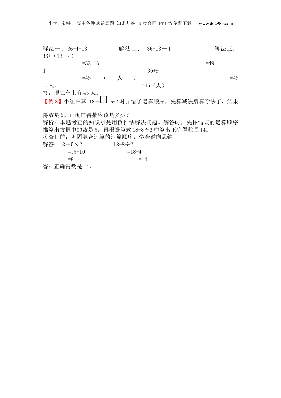 小学、初中、高中各种试卷真题知识归纳文案合同PPT等免费下载www.doc985.com第五单元混合运算【例1】简算。(1)22-11+68(2)65+23-15解析:本题考查的知识点是用“凑整”的方法进行加减混合的简算。混合运算,一般按从左往右的顺序计算,但是仔细观察算式就会发现,第(1)题中,22与68相加的和是90,所以先算出22与68的和得出90,然后再减去11;第(2)题中,65与15的差正好是50,这样相减得都整十数,然后再加上23。解答:(1)22-11+68(2)65+23-15=22+68-11=65-15+23=90-11=50+23=79=73【例2】爸爸今年28岁,红红比爸爸小21岁,去年红红几岁?解析:本题考查的知识点是用“抓不变量”的方法解答稍复杂的年龄问题。解答时,可以先根据二人的年龄差不变“红红比爸爸小21岁”,求出今年红红的年龄,再求出去年的年龄。解答:28-21=7(岁)7-1=6(岁)答:红红去年6岁。【例3】简算。(1)87-22-38(2)97-(37+41)解析:本题考查的知识点是利用添加小括号或去掉小括号的方法来解进行简算。计算时,先仔细观察第(1)题会发现:连续减去的两个数22和38的和是60,计算时,如果先求出它们的和再计算与87的差计算简单。第(2)题,一个数减去两个数的和,可以用这个数分别减去这两个数,这样计算97-37简单些。解答:(1)87-22-38(2)97-(37+41)=87-(22+38)=97-37-41=87-60=60-41=17=19【例4】把下面的分步算式改写成综合算式。(1)2×3=6(2)32+16=4824÷6=448÷6=8解析:本题考查的知识点是用“整体代换”的方法把分步算式改写成综合算式。解答此类问题的关键是找到一道算式中的哪个数据是由另一个算式计算得出的。(1)2×3=624÷6=4需要把6换成算式2×3,这样得到算式:24÷2×3,因为先计算2×3,所以添加小括号,算式为:24÷(2×3)。(2)32+16=4848÷6=8,需要把48换成算式32+16,这样得到算式:32+16÷6,因为先计算加法,所以添加小括号,算式为:(32+16)÷6。解答:(1)24÷(2×3)=4(2)(32+16)÷6=8【例5】算一算,每种图形各代表多少?小学、初中、高中各种试卷真题知识归纳文案合同PPT等免费下载www.doc985.com解析:本题考查的知识点是利用整体思想解答符号所代表的未知数类问题。解答时,先把含有符号的算式部分看成一个整体,然后结合算式中的已知数,从而求出符号所代表的数。(1)已知,我们可以先计算出3×7的积是21,这样算式变为+21=26,所以=26-21=5.(2)已知,先把看成一个整体,想谁减去6得30得出=36,再接着想谁与4的积是36,所以=9.解答:(1)5(2)9【例6】添上小括号,使下面的算式成立。(1)15-6÷3=3(2)2×5+3=16解析:本题考查的知识点是利用分析推理逆推等方法解答添加括号使等式成立类问题。解答时,先要整体观察算式,看含有哪些运算,最后结果是多少。(1)15-6÷3=3,想,结果是3,后面的运算是除以3,这样可以得出3×3=9,正好15与6的差也是9,所以只要先计算15与6的差即可,所以用小括号先计算15与6的差。(2)2×5+3=16,想,结果是16,后面的运算是+3,16与3的差是13,而2×5的积是10,不符合题意;看前面的运算符号是乘法,想,2与谁的积是16,得出2与8的积是16,正好5+3=8,所以把5+3看成整体,添加小括号。解答:(1)(15-6)÷3=3(2)2×(5+3)=16【例7】公共汽车上原有36人,到中山路站时有4人下车,有13人上车。解析:本题考查的知识点是从不同角度思考问题得到不同的解决问题的方法,体会解决问题策略多样性。解答此问题时,理解“下车”用减法,“上车”用加法是关键。方法一:先求出到达中山站下车后的人数,再加上上车的人数。方法二:先求出到达中山站后原有的人数加上上车的人数和再减去下车的人数。方法三:用原有的人数36加上到达中山站后上车与下车人数的差。解答:小学、初中、高中各种试卷真题知识归纳文案合同PPT等免费下载www.doc985.com解法一:36-4+13解法二:36+13-4解法三:36+(13-4)=32+13=49-4=36+9=45(人)=45(人)=45(人)答:现在车上有45人。【例8】小红在算18-÷2时弄错了运算顺序,先算减法后算除法了,结果得数是5。正确的得数应该是多少?解析:本题考查的知识点是用倒推法解决问题。解答时,先按错误的运算顺序推算出方框中的数是8,再根据算式18-8÷2中算出正确得数是14。考查目的:巩固混合运算的运算顺序,学会逆向思维。解答:18-5×218-8÷2=18-10=18-4=8=14答:正确得数是14。