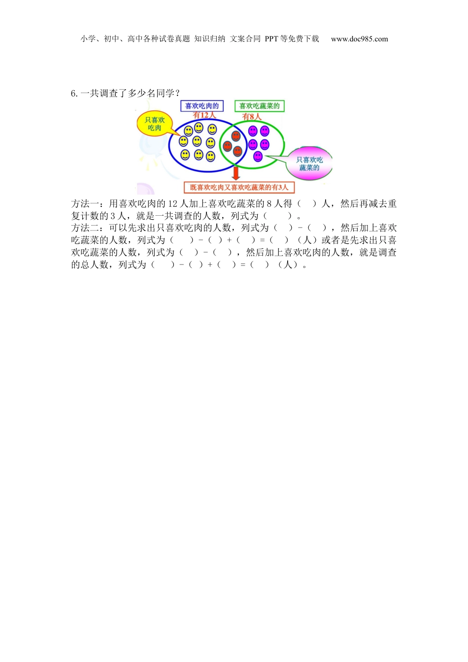 小学、初中、高中各种试卷真题知识归纳文案合同PPT等免费下载www.doc985.com七推理与集合1.期中考试数学成绩出来了,三个好朋友分别考了88分,92分,95分。他们分别考了多少分?小红说:我不是最低的静静说:我考了95分乐乐()分,静静()分小红()分2.勤劳的黑兔、白兔和灰兔,一个种萝卜,一个种白菜,一个种南瓜。白兔和黑兔收到了好朋友送的南瓜,黑兔帮助好朋友去萝卜地里施肥。黑兔、白兔和灰兔分别种的是什么?3.在下面的方格中,每行、每列都有1—4这四个数,并且每个数在每行、每列都只出现一次。B、C各是几?4.两个爸爸和两个儿子一起去看电影,每人买了一张票,可是他们只要坐三个坐位啊,这是怎么回事?5.我会分(填序号)。既会飞又会游泳的小学、初中、高中各种试卷真题知识归纳文案合同PPT等免费下载www.doc985.com6.一共调查了多少名同学?方法一:用喜欢吃肉的12人加上喜欢吃蔬菜的8人得()人,然后再减去重复计数的3人,就是一共调查的人数,列式为()。方法二:可以先求出只喜欢吃肉的人数,列式为()-(),然后加上喜欢吃蔬菜的人数,列式为()-()+()=()(人)或者是先求出只喜欢吃蔬菜的人数,列式为()-(),然后加上喜欢吃肉的人数,就是调查的总人数,列式为()-()+()=()(人)。小学、初中、高中各种试卷真题知识归纳文案合同PPT等免费下载www.doc985.com【答案】1.8895922.灰兔种的南瓜,白兔种的萝卜,黑兔种的白菜。3.B是1C是34.爷子孙三代人:两个爸爸是爷和子,两个儿子是子和孙5.6.2012+8-3=1712-3=998178-3=5831217