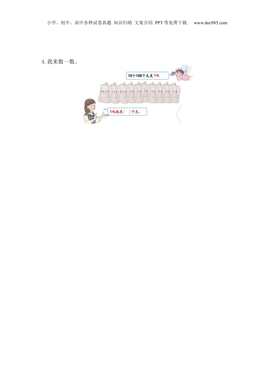 小学、初中、高中各种试卷真题知识归纳文案合同PPT等免费下载www.doc985.com五量与测量1.读图填一填。(1)1号杯重()克。(2)2号杯中的水重()克。(3)估一估,3号杯中的水大约重()克,这时如果将3号杯放到台秤上,台秤指针所指的重量大约是()克。2.填空。(1)(2)秒针走1小格是1秒,走一圈是()秒,也就是()分。(一圈有60个小格,12个大格)(3)2分=()秒180秒=()分(提示:1分钟=60秒)3.探究中熟悉。(1)仔细观察尺子,数一数1厘米的长度里有()小格。(2)数一数,1分米=()厘米。(3)我会对应填。小学、初中、高中各种试卷真题知识归纳文案合同PPT等免费下载www.doc985.com4.我来数一数。小学、初中、高中各种试卷真题知识归纳文案合同PPT等免费下载www.doc985.com【答案】1.(1)20(2)50(3)1001002.秒分时(1)601(2)12033.(1)1010(2)10(3)2300034.1000