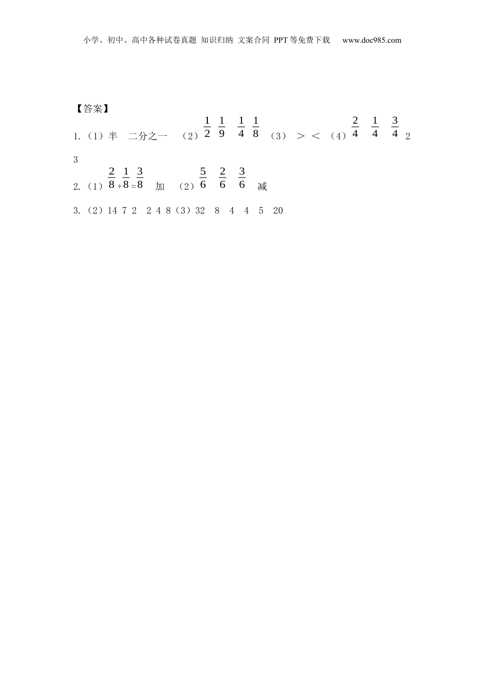 小学、初中、高中各种试卷真题知识归纳文案合同PPT等免费下载www.doc985.com六认识分数1.看图填空。(1)把1块月饼平均分给2个同学,每人分()块,就是把一个月饼平均分成两块,每块是一半,也就是它的12,读作()(提示:读分数时,先读分母,接着读分数线,最后读分子),写分数时,先写中间的横线,即分数线,再写分数线下的“2”,即分母,最后写分数线上面的“1”,即分子。(2)我会用分数表示下面的涂色部分。(3)我会比较大小。(填“>”或“<”(4)把一个圆,平均分成4份,其中的一份是,两份是2个14,也就是(),3份就是3个(),也就是()2.看图写算式。(1)()+()=()我发现:同分母分数相加,分母不变,分子相()。(2)()-()=()41小学、初中、高中各种试卷真题知识归纳文案合同PPT等免费下载www.doc985.com我发现:同分母分数相减,分母不变,分子相()。3.我会照着样子写算式。(1)青椒的是多少个?(2)桃的是多少个?6÷6=1(个)()÷()=()(个)1×5=5(个)()×()=()(个)(3)王叔叔种了32棵果树,其中梨树占,梨树有多少棵?()÷()=()(棵)()×()=()(棵)657485小学、初中、高中各种试卷真题知识归纳文案合同PPT等免费下载www.doc985.com【答案】1.(1)半二分之一(2)12191418(3)><(4)241434232.(1)28+18=38加(2)562636减3.(2)1472248(3)32844520