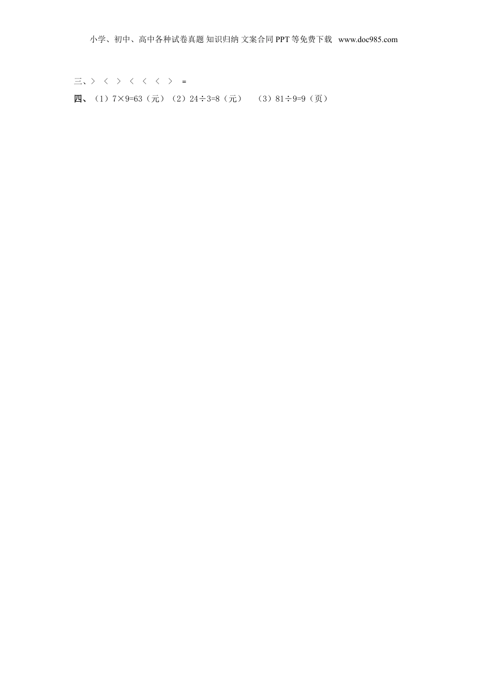 小学、初中、高中各种试卷真题知识归纳文案合同PPT等免费下载www.doc985.com第三课时解决问题一、看口诀,写算式。二八十六五九四十五()×()=()()×()=()()÷()=()()÷()=()二、算一算。24÷6=49÷7=56÷8=48÷8=24÷8=72÷9=44+7=36÷9=34-13=18÷2=36÷4=8×8=三、在()填“>”“<”或“=”。27÷3()896-40()578×9()81÷99+9()9×947()8×78×7-8()7×725()3×88÷8()6÷6四、生活运用。(1)一个计算器9元,买7个这样的计算器要多少元?(2)老师有24支铅笔,平均分给3个小朋友,每个小朋友可以分得几支铅笔?(3)小红看81页的故事书,看了9天才看完。平均每天看多少页?答案:一、2×8=1616÷8=25×9=4545÷9=5二、477638514219964小学、初中、高中各种试卷真题知识归纳文案合同PPT等免费下载www.doc985.com三、><><<<>﹦四、(1)7×9=63(元)(2)24÷3=8(元)(3)81÷9=9(页)