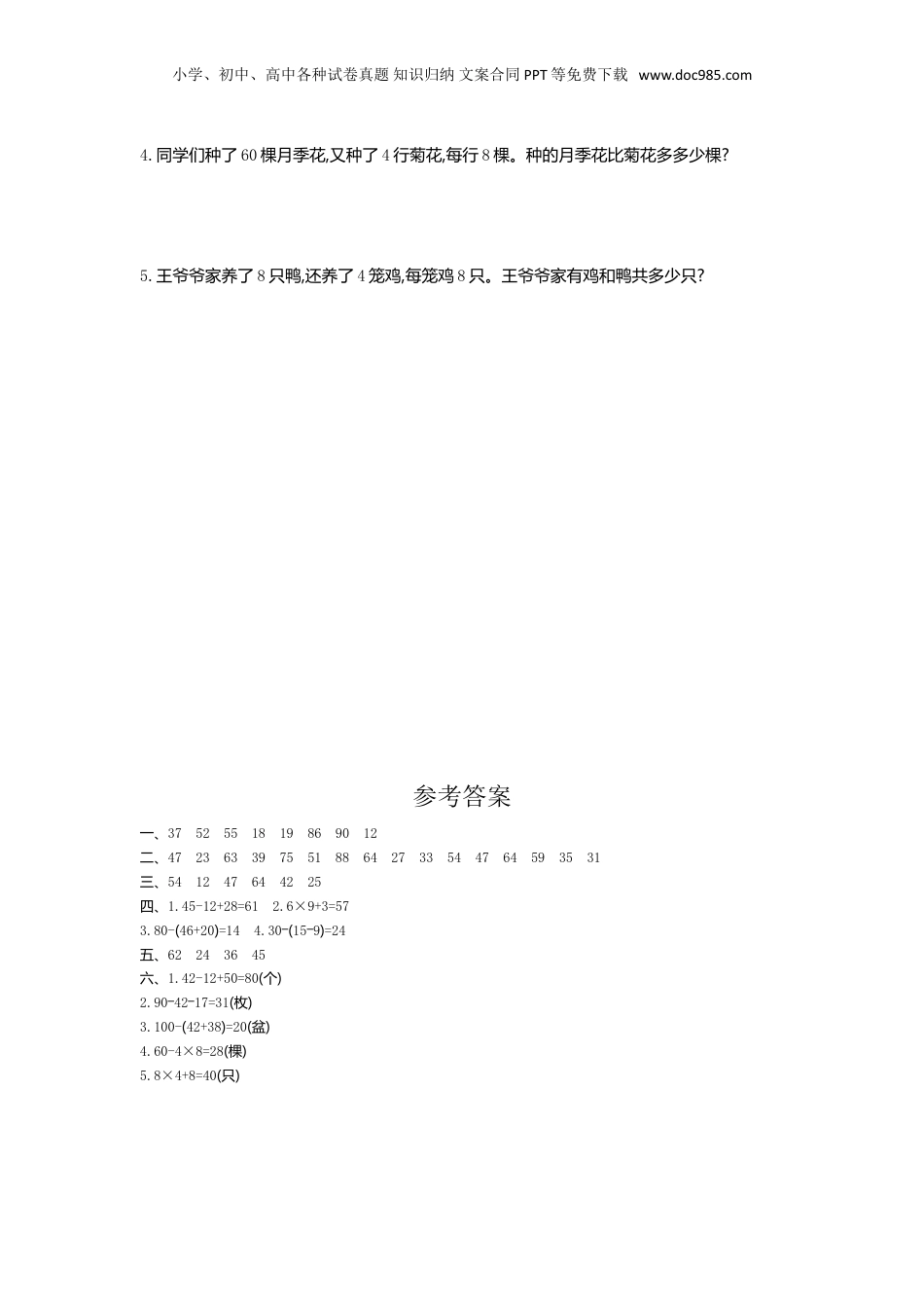 小学、初中、高中各种试卷真题知识归纳文案合同PPT等免费下载www.doc985.com第五单元检测一、直接写出得数。28+9=12+40=9+46=25-7=12+7=24+62=80+10=52-40=二、算一算。三、计算下面各题。25+68-3960-(33+15)78-(18+13)95-(12+19)4×9+65×(30÷6)四、把两个算式合并成一个算式。1.45-12=3333+28=612.6×9=5454+3=573.46+20=6680―66=14小学、初中、高中各种试卷真题知识归纳文案合同PPT等免费下载www.doc985.com4.15-9=630-6=24五、下面是二年级4个班在运动会上的得分情况,请把表格填写完整。二(1)班二(2)班二(3)班二(4)班男生得分25分比二(2)班女生多得8分比二(1)班男生少得5分18分女生得分比二(1)班男生多得12分8分16分比二(1)班女生少得10分总分()分()分()分()分六、解决问题。1.水果店原来有42个柚子,上午卖了12个,下午又进了50个,现在有多少个?2.东东、月月和童童三人一共收集了90枚邮票。东东收集了42枚,月月收集了17枚,童童收集了多少枚邮票?3.国庆节到了,学校要搬100盆花布置喷水池。他们还要搬多少盆?小学、初中、高中各种试卷真题知识归纳文案合同PPT等免费下载www.doc985.com4.同学们种了60棵月季花,又种了4行菊花,每行8棵。种的月季花比菊花多多少棵?5.王爷爷家养了8只鸭,还养了4笼鸡,每笼鸡8只。王爷爷家有鸡和鸭共多少只?参考答案一、3752551819869012二、47236339755188642733544764593531三、541247644225四、1.45-12+28=612.6×9+3=573.80-(46+20)=144.30―(15―9)=24五、62243645六、1.42-12+50=80(个)2.90―42―17=31(枚)3.100-(42+38)=20(盆)4.60-4×8=28(棵)5.8×4+8=40(只)