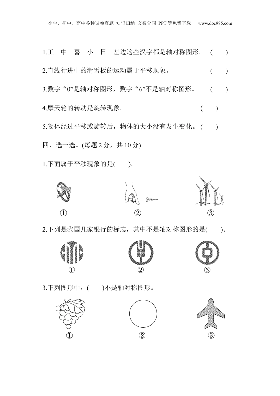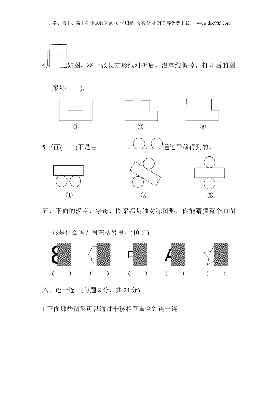 小学、初中、高中各种试卷真题知识归纳文案合同PPT等免费下载www.doc985.com第三单元达标测试卷一、画一画。(1题10分,2题16分,共26分)1.下面的图形是轴对称图形的画“√”。2.下列现象中是平移的画“△”,是旋转的画“○”。二、请在()里写出分针从12旋转到下面各个位置所经过的时间。(8分)三、判断。(每题2分,共10分)小学、初中、高中各种试卷真题知识归纳文案合同PPT等免费下载www.doc985.com1.工中喜小日左边这些汉字都是轴对称图形。()2.直线行进中的滑雪板的运动属于平移现象。()3.数字“0”是轴对称图形,数字“6”不是轴对称图形。()4.摩天轮的转动是旋转现象。()5.物体经过平移或旋转后,物体的大小没有发生变化。()四、选一选。(每题2分,共10分)1.下面属于平移现象的是()。2.下列是我国几家银行的标志,其中不是轴对称图形的是()。3.下列图形中,()不是轴对称图形。小学、初中、高中各种试卷真题知识归纳文案合同PPT等免费下载www.doc985.com4.如图,将一张长方形纸对折后,沿虚线剪掉,打开后的图案是()。5.下面()不是由、、通过平移得到的。五、下面的汉字、字母、图案都是轴对称图形,你能猜猜整个的图形是什么吗?写在括号里。(10分)六、连一连。(每题8分,共24分)1.下面哪些图形可以通过平移相互重合?连一连。小学、初中、高中各种试卷真题知识归纳文案合同PPT等免费下载www.doc985.com2.(变式题)下面的图案各是从哪张纸上剪下来的?请连一连。3.(变式题)下面的图形分别是从哪张纸上剪下来的?请连一连。七、圈一圈。(每题4分,共12分)小学、初中、高中各种试卷真题知识归纳文案合同PPT等免费下载www.doc985.com1.下面哪棵树是通过左边的图形平移得到的?2.下面哪架飞机可以通过左边的图形旋转得到?3.按照下面的方式折、画、剪(并描出眼睛),得到的是哪幅图?请圈一圈。小学、初中、高中各种试卷真题知识归纳文案合同PPT等免费下载www.doc985.com答案一、1.(√)()(√)(√)()2.(○)(△)(△)(△)(△)(○)(△)(○)二、20255540三、1.×2.√3.√4.√5.√四、1.②2.①3.①4.①5.②五、易错点拨:根据轴对称图形的性质画出完整图形再判断。六、1.2.3.小学、初中、高中各种试卷真题知识归纳文案合同PPT等免费下载www.doc985.com六、1.圈第3个图形2.圈第2个图形3.圈第1个图形