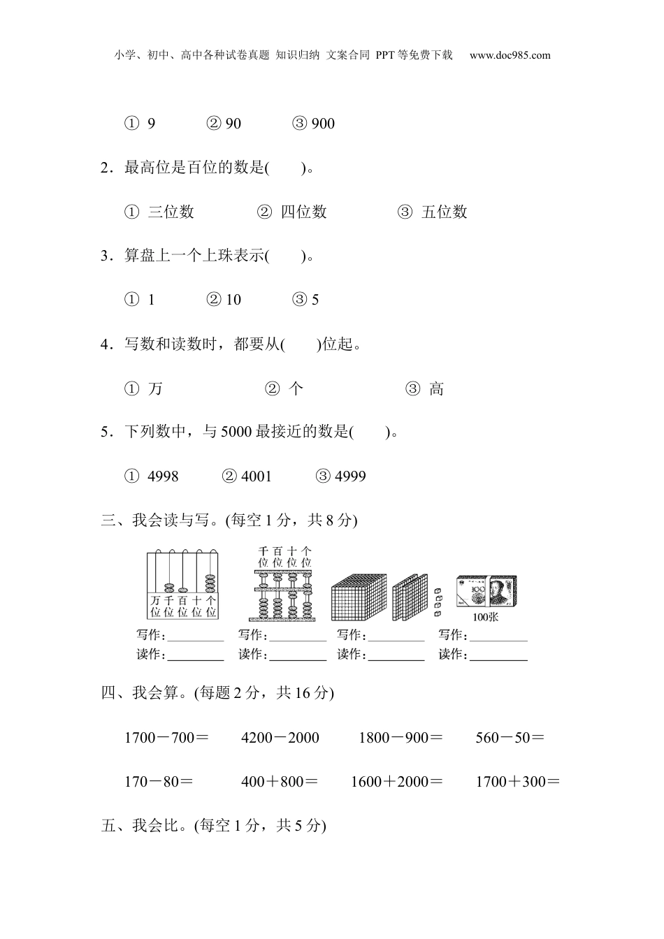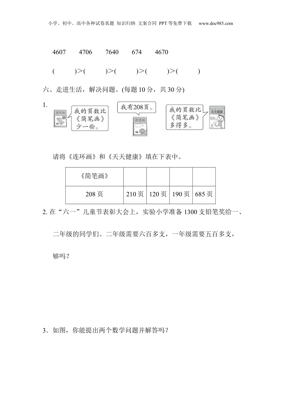 小学、初中、高中各种试卷真题知识归纳文案合同PPT等免费下载www.doc985.com周测培优卷9一、我会填。(6题6分,其余每空2分,共26分)1.在6060中,右起第二位上的“6”表示(),第四位上的“6”表示()。2.用4、0、8可以组成()个不同的三位数,最大的是(),最小的是()。3.北岳恒山主峰海拔二千零一十六米,横线上的数写作(),约是()。4.68个百是(),5400里面有()个一。5.7个千、5个十和8个一组成的数是()。6.按规律填数。(1)3000、4000、5000、()、()、8000。(2)2080、2090、()、2110、()。(3)450、()、550、()、650。二、我会选。(把正确答案的序号填在括号里)(每题3分,共15分)1.9000里面有()个100。小学、初中、高中各种试卷真题知识归纳文案合同PPT等免费下载www.doc985.com①9②90③9002.最高位是百位的数是()。①三位数②四位数③五位数3.算盘上一个上珠表示()。①1②10③54.写数和读数时,都要从()位起。①万②个③高5.下列数中,与5000最接近的数是()。①4998②4001③4999三、我会读与写。(每空1分,共8分)四、我会算。(每题2分,共16分)1700-700=4200-20001800-900=560-50=170-80=400+800=1600+2000=1700+300=五、我会比。(每空1分,共5分)小学、初中、高中各种试卷真题知识归纳文案合同PPT等免费下载www.doc985.com4607470676406744670()>()>()>()>()六、走进生活,解决问题。(每题10分,共30分)1.请将《连环画》和《天天健康》填在下表中。《简笔画》208页210页120页190页685页2.在“六一”儿童节表彰大会上,实验小学准备1300支铅笔奖给一、二年级的同学们。二年级需要六百多支,一年级需要五百多支,够吗?3.如图,你能提出两个数学问题并解答吗?小学、初中、高中各种试卷真题知识归纳文案合同PPT等免费下载www.doc985.com小学、初中、高中各种试卷真题知识归纳文案合同PPT等免费下载www.doc985.com答案一、1.6个十6个千2.48404083.201620004.680054005.70586.(1)60007000(2)21002120(3)500600二、三、2104二千一百零四5026五千零二十六1204一千二百零四10000一万四、1000220090051090120036002000五、7640470646704607674六、1.《简笔画》《连环画》《天天健康》208页210页120页190页685页2.六百多支与五百多支合起来最多是一千二百多支。1300>一千二百多口答:够。3.(1)小明从家出发经过小丽家到书店要走多少米?小学、初中、高中各种试卷真题知识归纳文案合同PPT等免费下载www.doc985.com700+800=1500(米)口答:小明从家出发经过小丽家到书店要走1500米。(2)小丽放学回家走哪条路近?要走多少米?200+700=900(米)1000+800=1800(米)900米<1800米口答:小丽放学回家经过小明家这条路近要走900米。[点拨]此题答案不唯一。