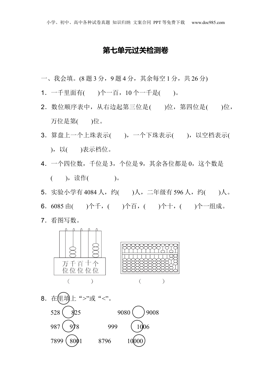 小学、初中、高中各种试卷真题知识归纳文案合同PPT等免费下载www.doc985.com第七单元过关检测卷一、我会填。(8题3分,9题4分,其余每空1分,共26分)1.一千里面有()个一百,10个一千是()。2.数位顺序表中,从右边起第三位是()位,第四位是()位,万位是第()位。3.算盘上一个上珠表示(),一个下珠表示(),以空档表示(),以()表示档位。4.一个四位数,千位是3,个位是9,其余各位都是0,这个数是(),读作()。5.实验小学有4084人,约()人,二年级有596人,约()人。6.6085由()个千,()个百,()个十,()个一组成。7.看图写数。8.在里填上“>”或“<”。52882590809008987978999100678998001879610000小学、初中、高中各种试卷真题知识归纳文案合同PPT等免费下载www.doc985.com9.按顺序排列下列各数。(1)75445710097842080()<()<()<()<()(2)30293092392093003900()>()>()>()>()二、判断。(对的画“√”,错的画“×”)(每题1分,共5分)1.三位数一定比四位数小。()2.近似数一定比准确数大。()3.8888中每个8表示的意义一样。()4.读数和写数都从高位起。()5.用算盘记数时一个珠子表示1个一。()三、我会选。(每题2分,共10分)1.由6个千,5个十和4个一组成的数是()。A.6504B.654C.60542.5470中的5表示()。A.5个百B.5个千C.5个十3.下面的数中只读一个零的是()。A.6008B.6800C.46804.下列各数最接近6000的是()。A.6008B.6900C.59995.和3999相邻的数是()。小学、初中、高中各种试卷真题知识归纳文案合同PPT等免费下载www.doc985.comA.4000和4001B.4000和3998C.4000和3989四、我会算。(8分)300+600=800-400=1600-700=2700-900=250+80=980-230=8000-5000=4000+6000=五、我会照样子写一写。(8分)7850=7000+800+504095=()+()+()7001=()+()5060=()+()()=2000+500+40+7六、里最大能填几?(6分)634<65167000>6995897>589752<7583300<43004048>407七、按规律填数。(每题2分,共8分)1.6068、6078、6088、()、()。2.7800、7700、()、7500、()。小学、初中、高中各种试卷真题知识归纳文案合同PPT等免费下载www.doc985.com3.4435、4440、4445、()、()。4.10000、9999、9998、()、()。八、填一填。(1题1分,其余每题2分,共5分)梨树有793棵。桃树比苹果树多得多,苹果树比梨树少一些。1.梨树大约有()棵。2.苹果树和桃树各有多少棵?把它们的名称写在表格里。783棵804棵345棵1209棵3.苹果树比桃树大约少多少棵?九、连一连。(3分)十、解决问题。(2题5分,其余每题8分,共21分)小学、初中、高中各种试卷真题知识归纳文案合同PPT等免费下载www.doc985.com1.下面是某家电城六月份销售的家电的台数。(1)每种家电各接近几千台?家电名称电视机冰箱空调台数108928783809(2)销售量最多的家电比销售量最少的家电大约多销售多少台?2.某工人师傅要在两个月内生产1800个零件。实际工人师傅每个月能生产988个,估一估他能按时完成任务吗?3.(1)从小红家到小明家最近的路有多远?小学、初中、高中各种试卷真题知识归纳文案合同PPT等免费下载www.doc985.com(2)从小红家到书店最近的路有多远?小学、初中、高中各种试卷真题知识归纳文案合同PPT等免费下载www.doc985.com答案一、1.10100002.百千五3.510横梁4.3009三千零九5.40006006.60857.300450748.<>><<<9.(1)457<754<784<1009<2080(2)9300>3920>3900>3092>3029二、1.√2.×3.×4.√5.×三、1.C2.B3.A4.C5.B四、9004009001800330750300010000五、4095=4000+90+57001=7000+15060=5000+602547=2000+500+40+7六、496834七、1.609861082.760074003.445044554.99979996八、1.800小学、初中、高中各种试卷真题知识归纳文案合同PPT等免费下载www.doc985.com2.783棵804棵345棵1209棵苹果树桃树3.1200-800=400(棵)答:苹果树比桃树大约少400棵。九、十、1.(1)电视机:1000台冰箱:3000台空调:4000台(2)4000-1000=3000(台)答:空调比电视机大约多销售3000台。2.988≈10001000+1000=2000(个)2000>1800答:他能按时完成任务。3.(1)300+500=800(米)答:从小红家到小明家最近的路有800米远。(2)300+1500=1800(米)答:从小红家到书店最近的路有1800米远。