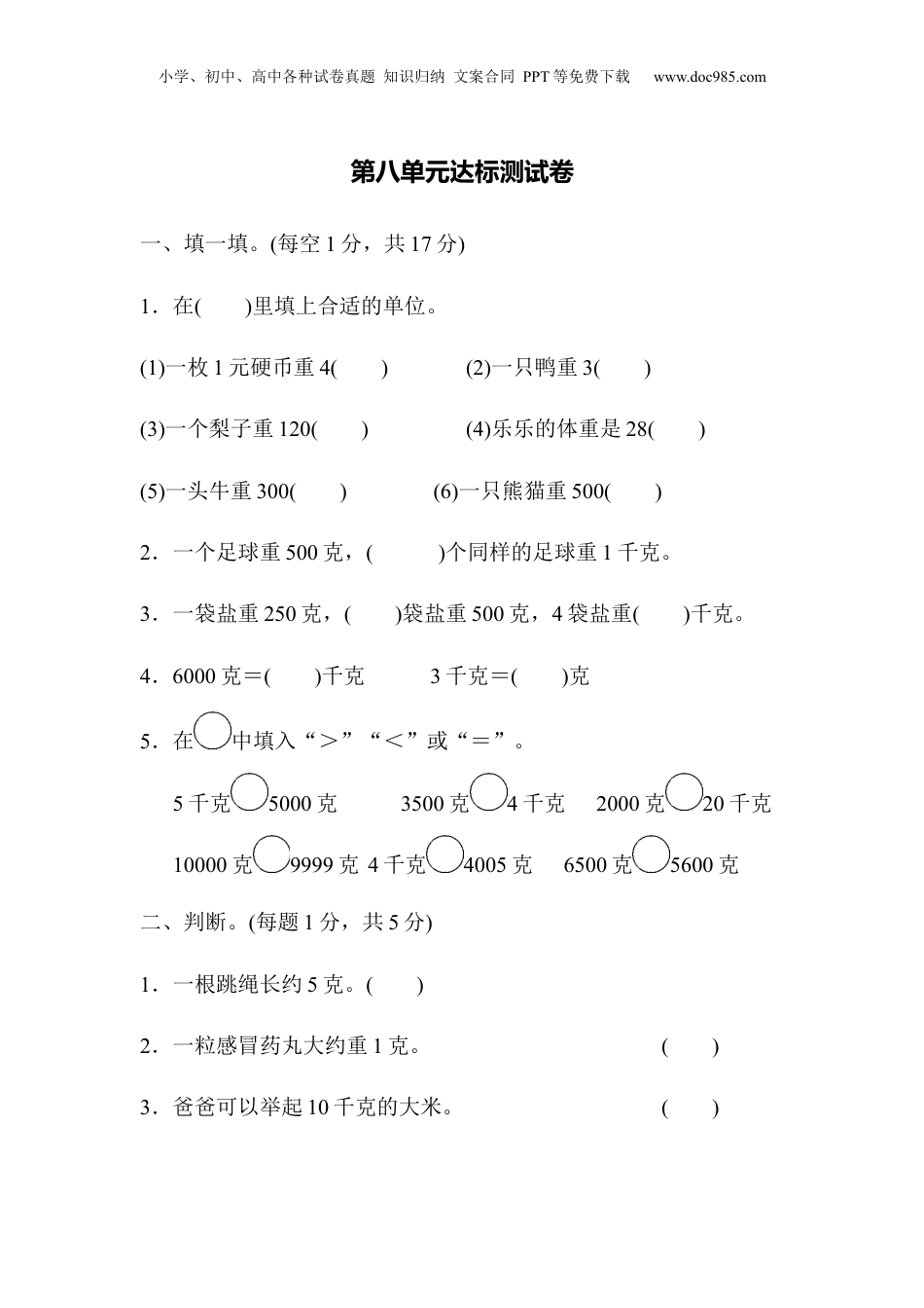 小学、初中、高中各种试卷真题知识归纳文案合同PPT等免费下载www.doc985.com第八单元达标测试卷一、填一填。(每空1分,共17分)1.在()里填上合适的单位。(1)一枚1元硬币重4()(2)一只鸭重3()(3)一个梨子重120()(4)乐乐的体重是28()(5)一头牛重300()(6)一只熊猫重500()2.一个足球重500克,()个同样的足球重1千克。3.一袋盐重250克,()袋盐重500克,4袋盐重()千克。4.6000克=()千克3千克=()克5.在中填入“>”“<”或“=”。5千克5000克3500克4千克2000克20千克10000克9999克4千克4005克6500克5600克二、判断。(每题1分,共5分)1.一根跳绳长约5克。()2.一粒感冒药丸大约重1克。()3.爸爸可以举起10千克的大米。()小学、初中、高中各种试卷真题知识归纳文案合同PPT等免费下载www.doc985.com4.4千克的石头比4000克的沙重。()5.1个苹果重200克,4个苹果重1千克。()三、选一选。(每题2分,共10分)1.小佳想称自己的体重,你建议他选用()。2.如右图,5个同样的西瓜重多少?你的选择是()。①30克②15千克③30千克3.一瓶墨水重100克,()瓶墨水重1千克。①5②10③204.下面比1克轻的是()。①一片羽毛②一个苹果③一个足球5.一瓶果酱(jiàng)连瓶重1千克,瓶重100克,果酱净重()。①1100克②1000克③900克四、下面的物品有多重?填一填。(8分)小学、初中、高中各种试卷真题知识归纳文案合同PPT等免费下载www.doc985.com五、有多重?连一连。(5分)六、下面这些物品怎样放才能使天平处于下面的两种状态?(8分)七、下面的秤最多能称多重的物品?(6分)小学、初中、高中各种试卷真题知识归纳文案合同PPT等免费下载www.doc985.com八、解决问题。(1题6分,2题12分,3题8分,4题15分,共41分)1.一盒茶叶连盒重1500克。2.购物。(1)把上面食品和动物的质量按从重到轻的顺序排列。小学、初中、高中各种试卷真题知识归纳文案合同PPT等免费下载www.doc985.com(2)3个桃子重多少克?(3)你还能提出什么数学问题?提出并解答。3.请你估一估30个西红柿大约重多少千克。(1)如果30个西红柿都是较大的呢?(2)如果30个西红柿都是中等个儿的呢?4.(变式题)下面是乐乐水果店的价格表。小学、初中、高中各种试卷真题知识归纳文案合同PPT等免费下载www.doc985.com(1)李阿姨花了多少钱?(2)小伟花了多少钱?(3)你还能提出什么数学问题并解答吗?水果价格苹果2元/500克桃子1元/500克香蕉3元/500克荔枝7元/500克西瓜4元/500克菠萝3元/500克小学、初中、高中各种试卷真题知识归纳文案合同PPT等免费下载www.doc985.com小学、初中、高中各种试卷真题知识归纳文案合同PPT等免费下载www.doc985.com答案一、1.(1)克(2)千克(3)克(4)千克(5)千克(6)千克2.23.214.630005.=<<><>二、1.×2.√3.√4.×5.×三、1.③2.③3.②4.①5.③四、5006008500五、六、不平衡:左边:4千克1千克右边:2千克400克600克(答案不唯一)平衡:左边:4千克右边:2千克1千克600克400克易错点拨:第一种状态:左边重,右边轻,答案不唯一。左边:4千克+1千克=5千克右边:600克+400克+2千克小学、初中、高中各种试卷真题知识归纳文案合同PPT等免费下载www.doc985.com=3千克第二种状态:天平平衡。左边:4千克右边:4千克2千克+1千克+400克+600克=4千克七、1200g50kg10kg八、1.1千克=1000克1500-1000=500(克)2.(1)4千克>2000克>1千克>400克>200克(2)200+200+200=600(克)3个桃子重600克。(3)(答案不唯一)鱼比牛奶重多少克?1千克=1000克1000-400=600(克)3.(1)30÷5=6(千克)(2)30÷6=5(千克)4.(1)4千克=4000克,4000克里面有8个500克。3×8=24(元)(2)3500克里面有7个500克,2500克里面有5个500克。7×7+3×5=64(元)(3)略。